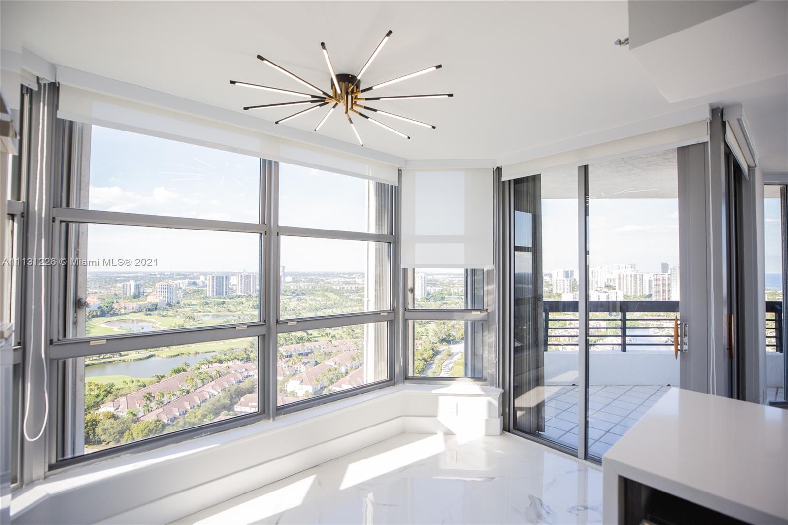 ONE OF A KIND. Completely remodeled 2 beds plus den and 2 full bathrooms.Enjoy the most beautiful and spectacular panoramic views of the ocean,Turnberry Golf course,skyline from this spacious apartment in the prestigious Mystic Pointe.Apartment features an exquisite open kitchen with new stainless steel appliances and wine-cooler. Unit features exquisite bathrooms, separate new washer and dryer in the unit. Entire home has tile throughout. Split floor with extensive wrap-around balcony with breathtaking views and shutter.Full building amenities including: Fitness center, heated pool,library,7 clay tennis courts,2 pickle ball courts,1 basketball court and dog park,mini market, beauty salon and restaurant. Mystic Pointe is a desirable and all-inclusive 24 hours gated community.