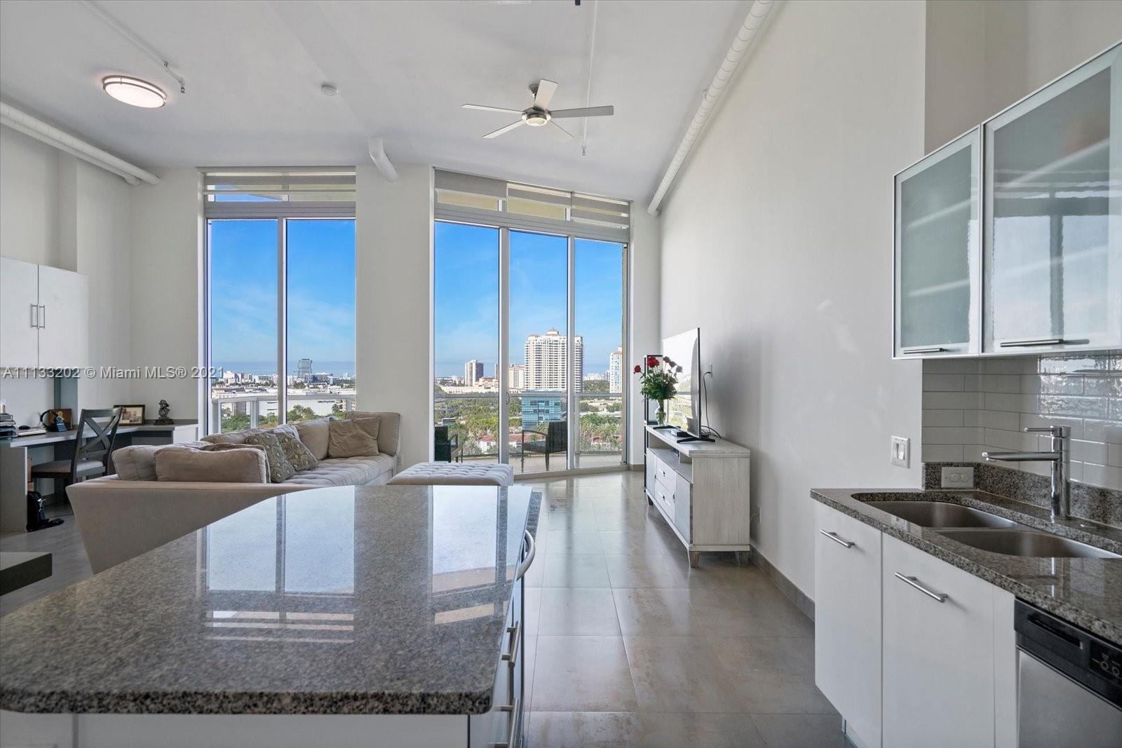 Beautiful penthouse with impressive views; Modern and tastefully updated loft with 14 foot high ceilings and private furnished 510 Sq ft. Roof Top Terrace, with unobstructed views. Kitchen redone with updated cabinets, new backsplash, and new installed wine cooler. Brand new custom-built 10 feet high bedroom closets with clothing racks and built-in dresser drawers. Brand new custom-designed office with 8 foot high built-in cabinets for additional clothing space, and custom cabinets installed over the office, for additional office storage space. Marble flooring throughout the unit-including the Patio area. New Lighting, Fans, and chandelier throughout the Loft. Updated Bathrooms; new LED Mirrors and new light fixtures. Unit completely newly painted and sold furnished.