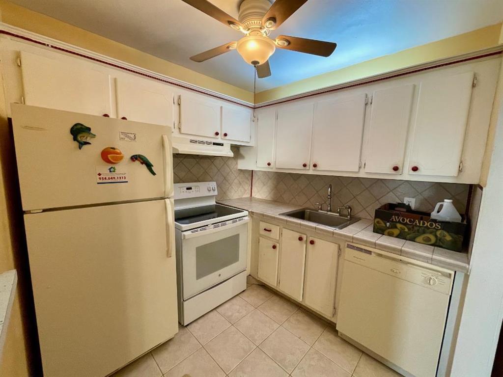 This popular 1/1.5 floor plan in 55+ Century Village is a great spot for your Florida home! Kitchen features white cabinets, tile floors, and a dishwasher. Updated half bath. Spacious bedroom suite with full en-suite bath, wall of closets, and access to screened lanai. Accordion shutters on front and back windows. Sold AS IS and with furnishings as shown. Century Village is a 55+ community with so much to offer...