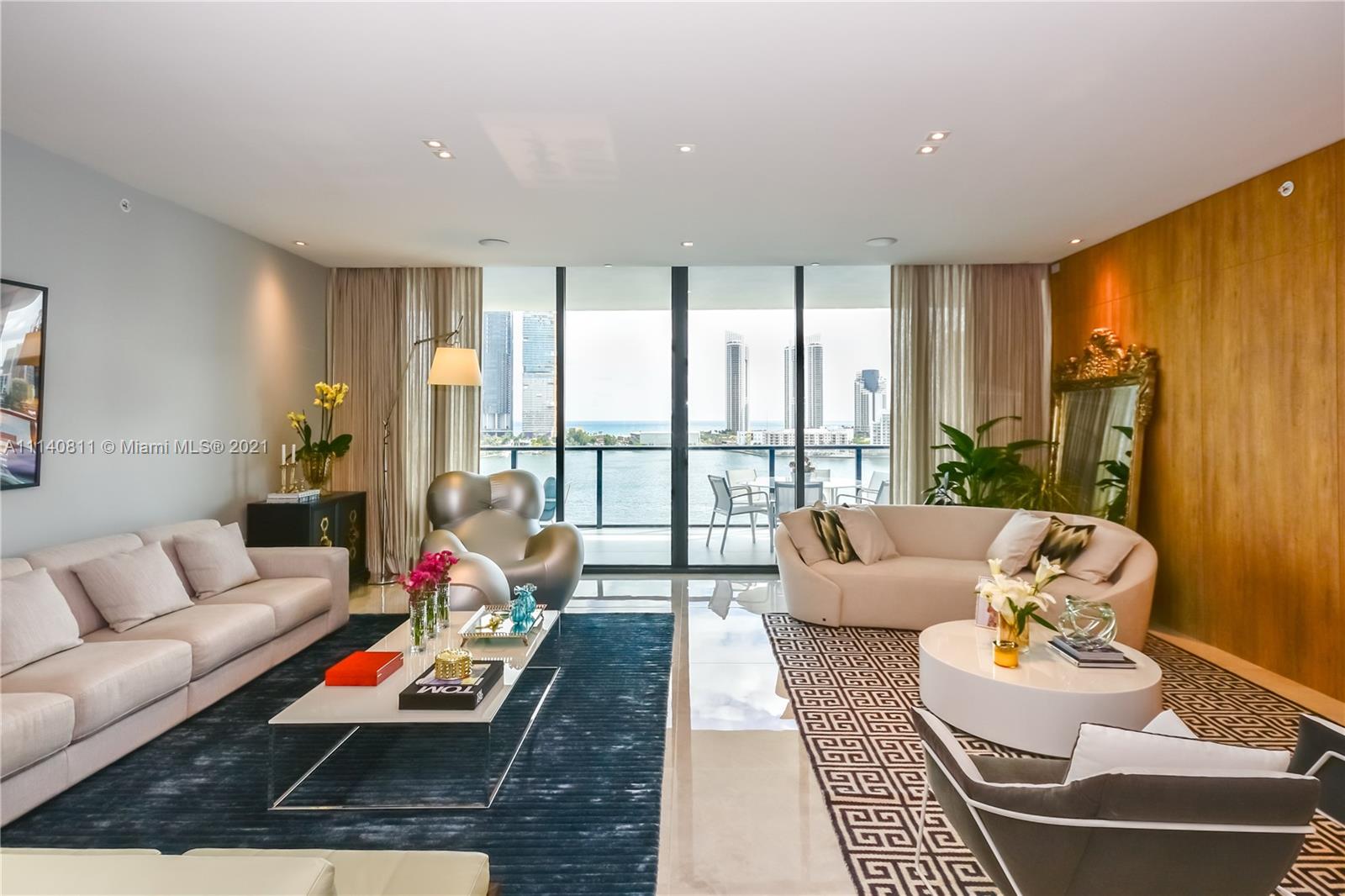 Impressive and unique large unit at PRIVE. A magnificent complex in an 8-acre private island in Aventura. This gorgeous unit features a flow-through lay out w/3 bedrooms + den/4,5 baths & breathtaking views to Bay/Ocean from every window/10’-foot floor -to -ceiling glass windows & deep terraces with barbecue . European grey Italian porcelain 48 x 48 floor, sound system .Has a built storage room, high end custom made walk-in closets,. Private elevator & modern European Kitchen. Amenities include: Gym/Spa, large pool deck with East/West views;2 pools & pool bar service, restaurant/cafe on site; entertainments room, cigar room, wine room, tennis courts, boat dock, children's playground & game room and much more. 3 assigned parking spaces.