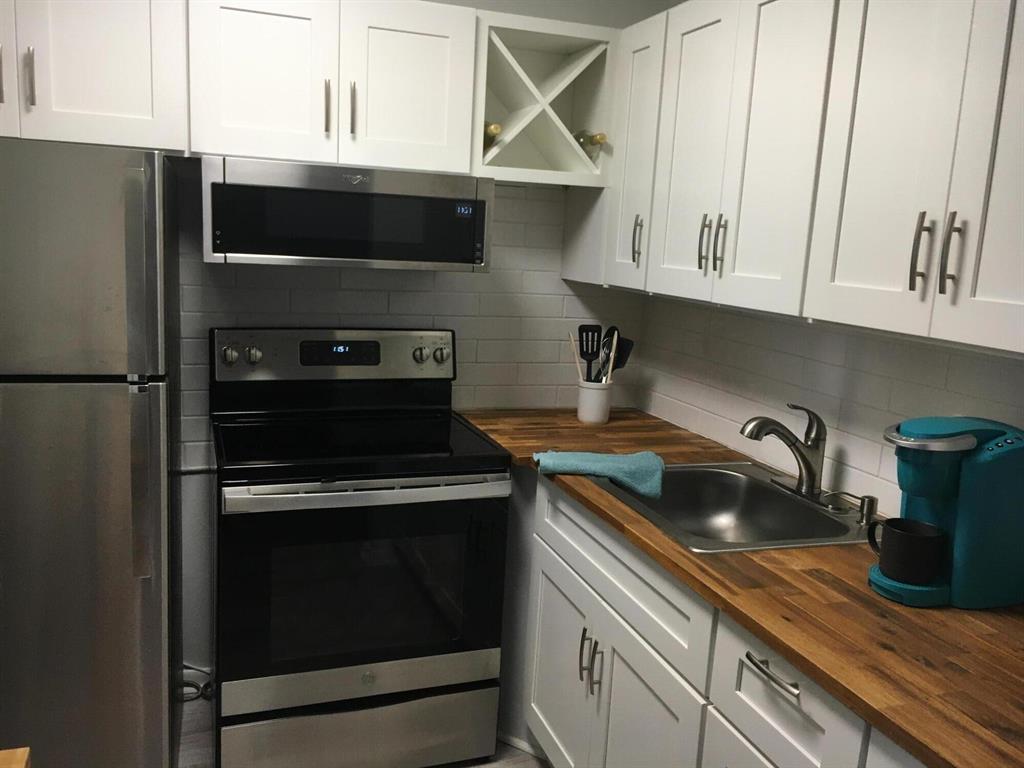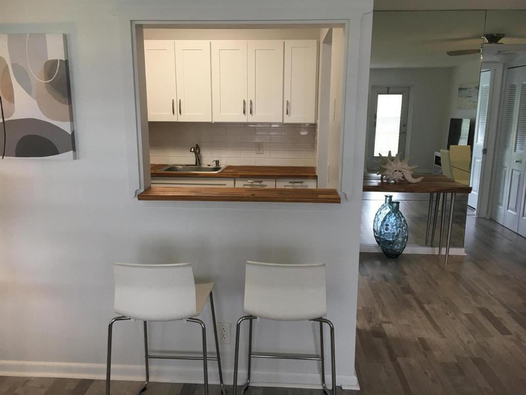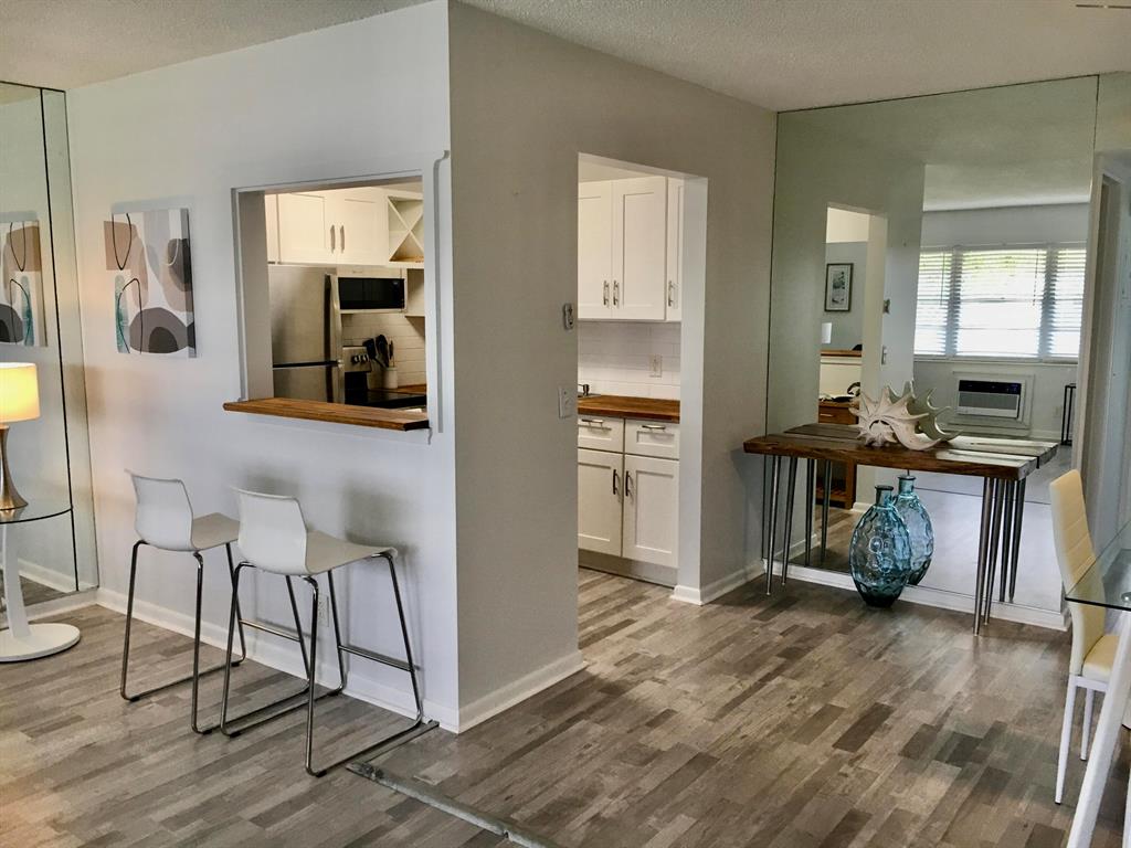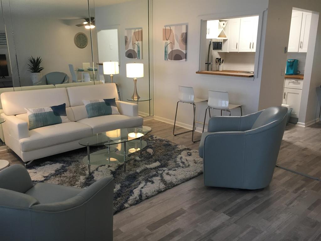 JUST BRING YOUR SUITCASE TO THIS 55+ UNIT IN CENTURY VILLAGE! Modern furniture in the living room, dining and bedroom was purchased in 2021. The stainless steel fridge, stove, microwave and new cabinets in kitchen with butcher block countertop and pass-thru window. TURNKEY kitchen ware, Keurig coffee maker, new TV, dishes, towels, bedding, rugs...it's all here!The oversized bedroom has tons of closet space, a full on-suite bath. Sliding doors leading to a huge lanai with canal views, Full bath and half bath have been updated with new sinks/vanities.Century Village is a gated, 55+ community with multiple pools, clubhouse, gym, tennis courts and more. Low HOA, bus service and convenient location to beaches, shopping and dining destinations. NO Pets allowed.