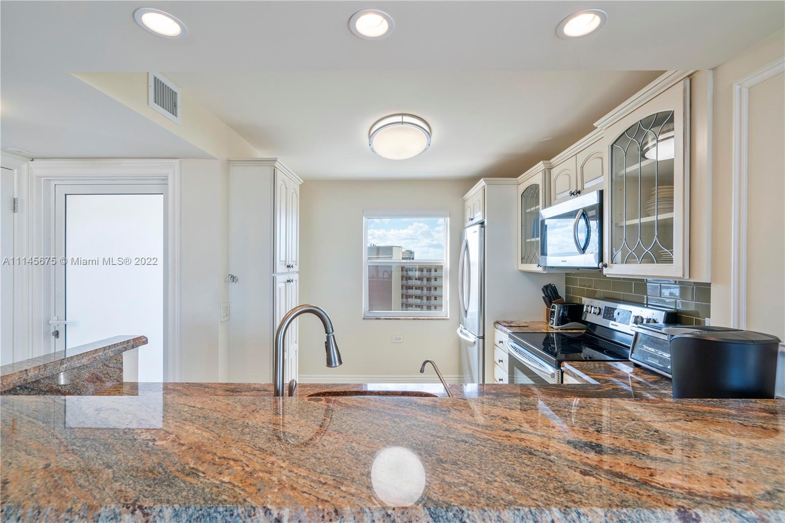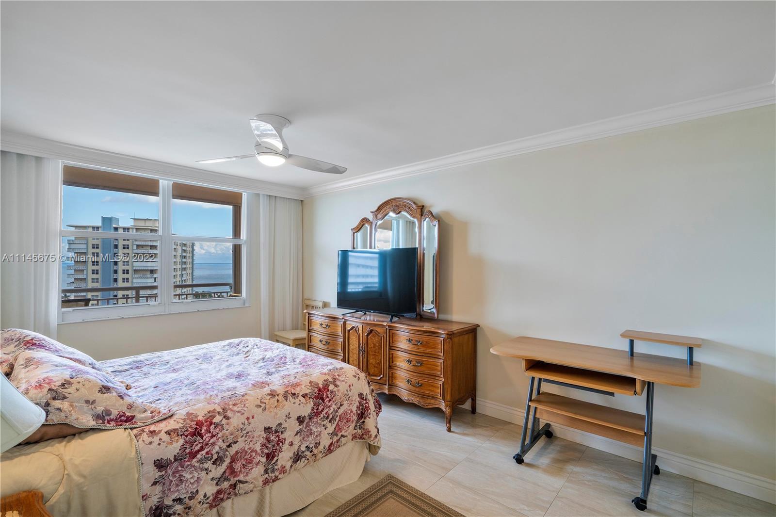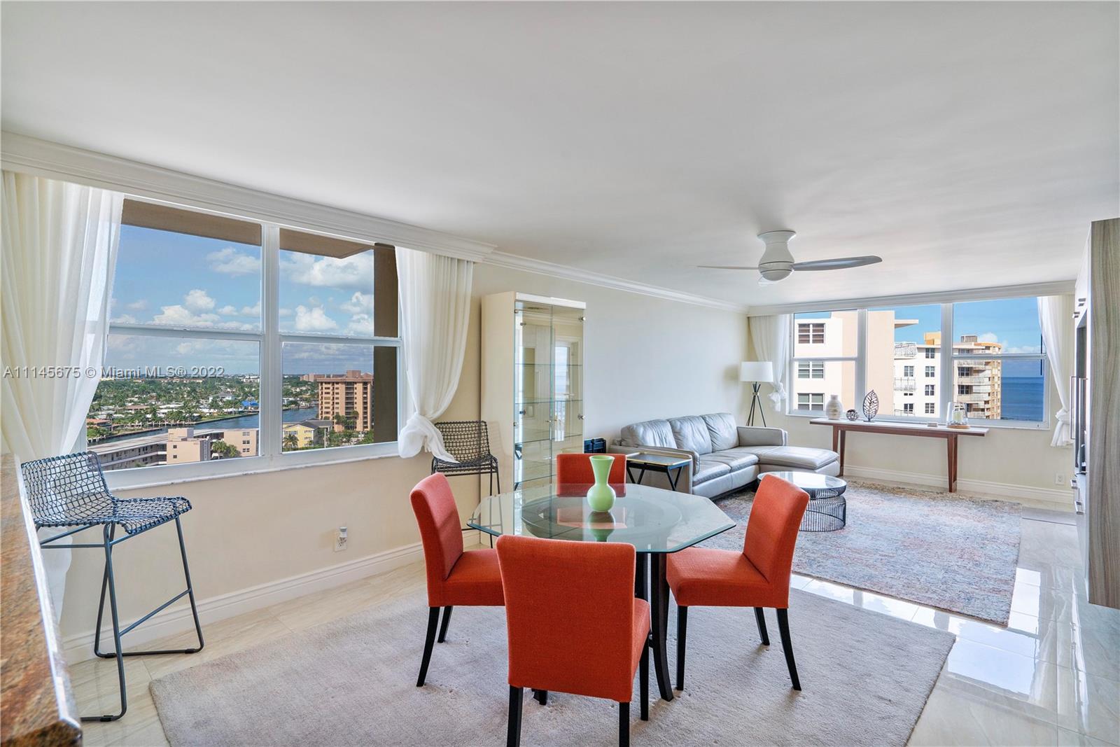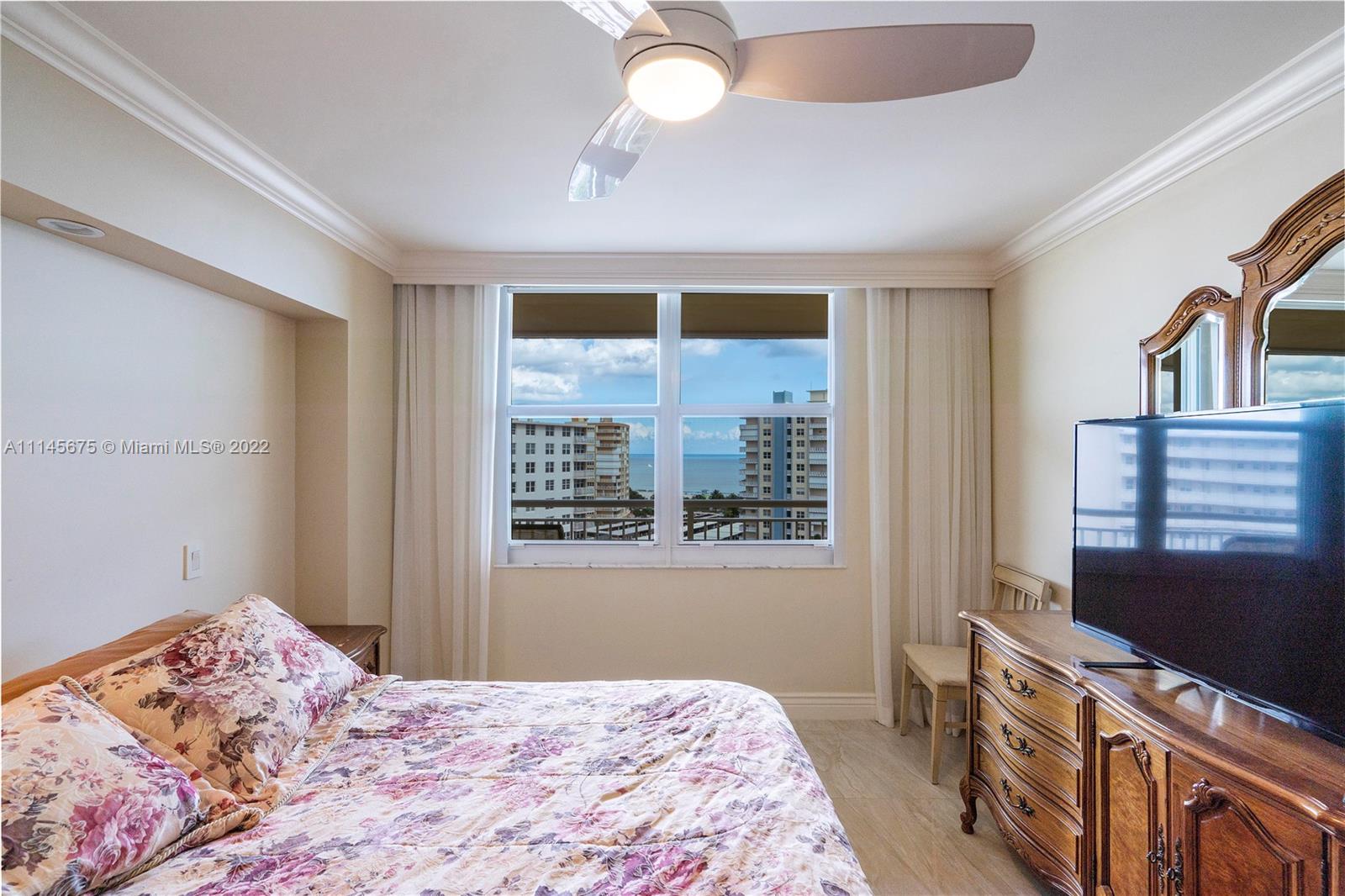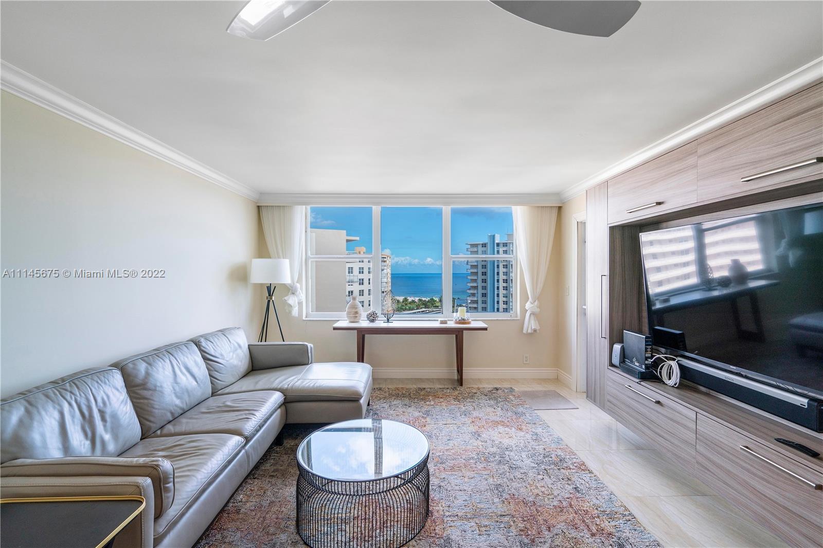 Wow! Gorgeous 2 Bed, 2 Bath corner unit with 1200 Sq. Ft. located in desirable Granada House with exceptional view of Atlantic Ocean and Full Intracoastal view! Fully Furnished. Modernized built in entertainment area in living room. Crown molding throughout. Bar area upon walk in, all impact windows and doors, tile/marble floors throughout whole unit. Soft close drawers and cabinets in kitchen. Master bathroom fully updated. Built-ins in master closet. Built-in in second bedroom. Updated second bathroom. Oversize balcony to overlook ocean. Electric shades. Washer and dryer by elevator. Water heater is 2015. AC year unknown. All Samsung appliances. Nest set up for AC. Can walk right across to all new bars and restaurants. Must see!