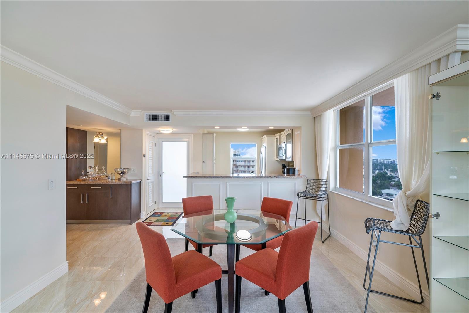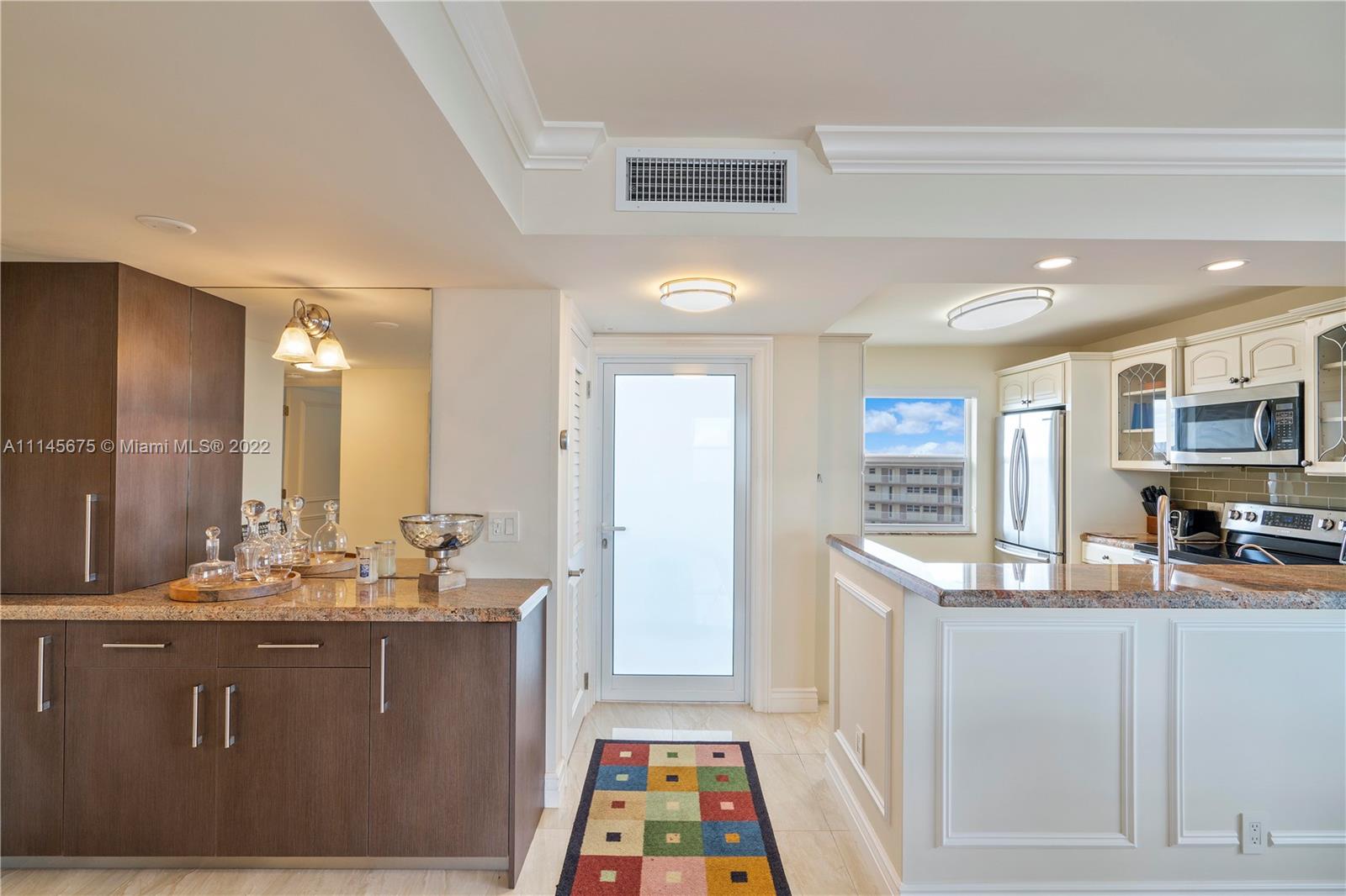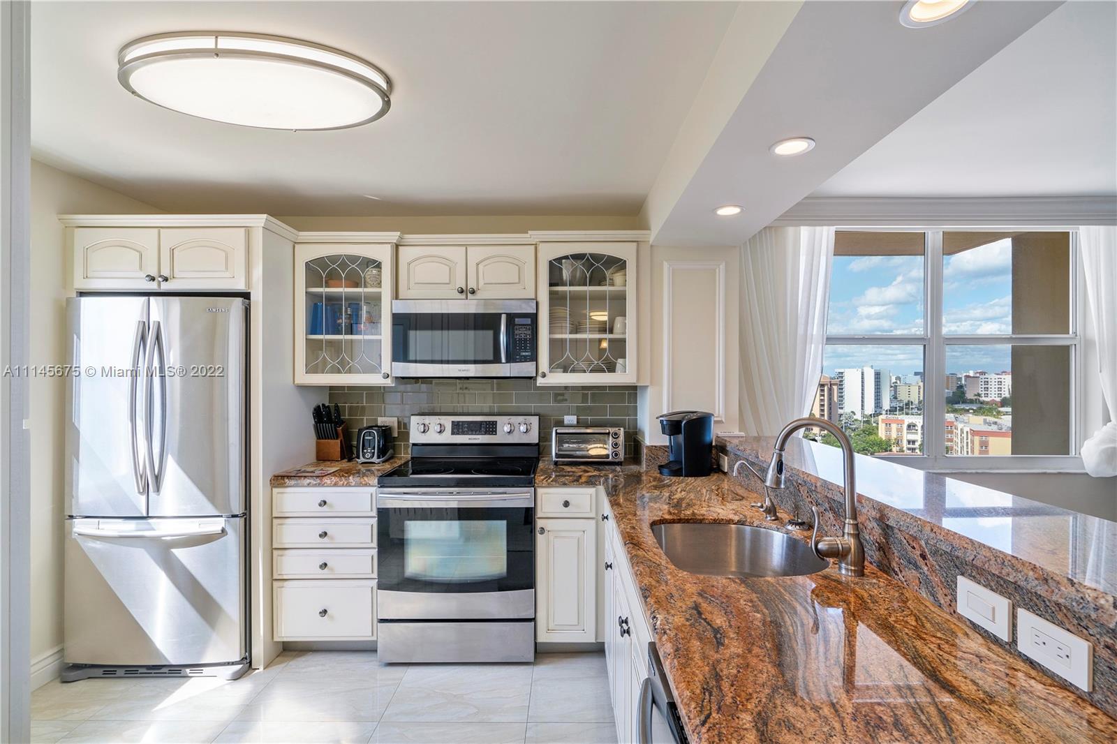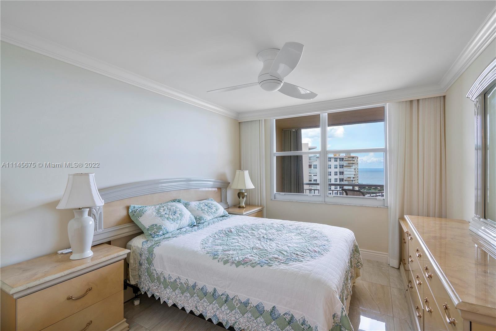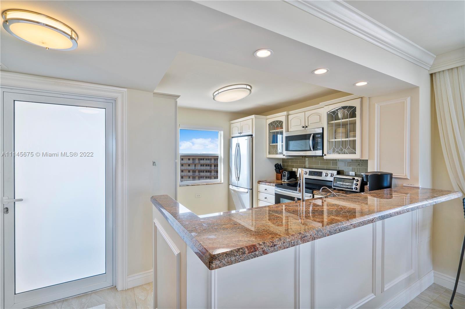 Wow! Gorgeous 2 Bed, 2 Bath corner unit with 1200 Sq. Ft. located in desirable Granada House with exceptional view of Atlantic Ocean and Full Intracoastal view! Fully Furnished. Modernized built in entertainment area in living room. Crown molding throughout. Bar area upon walk in, all impact windows and doors, tile/marble floors throughout whole unit. Soft close drawers and cabinets in kitchen. Master bathroom fully updated. Built-ins in master closet. Built-in in second bedroom. Updated second bathroom. Oversize balcony to overlook ocean. Electric shades. Washer and dryer by elevator. Water heater is 2015. AC year unknown. All Samsung appliances. Nest set up for AC. Can walk right across to all new bars and restaurants. Must see!