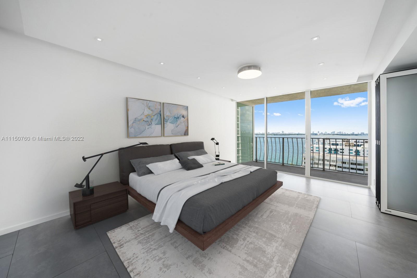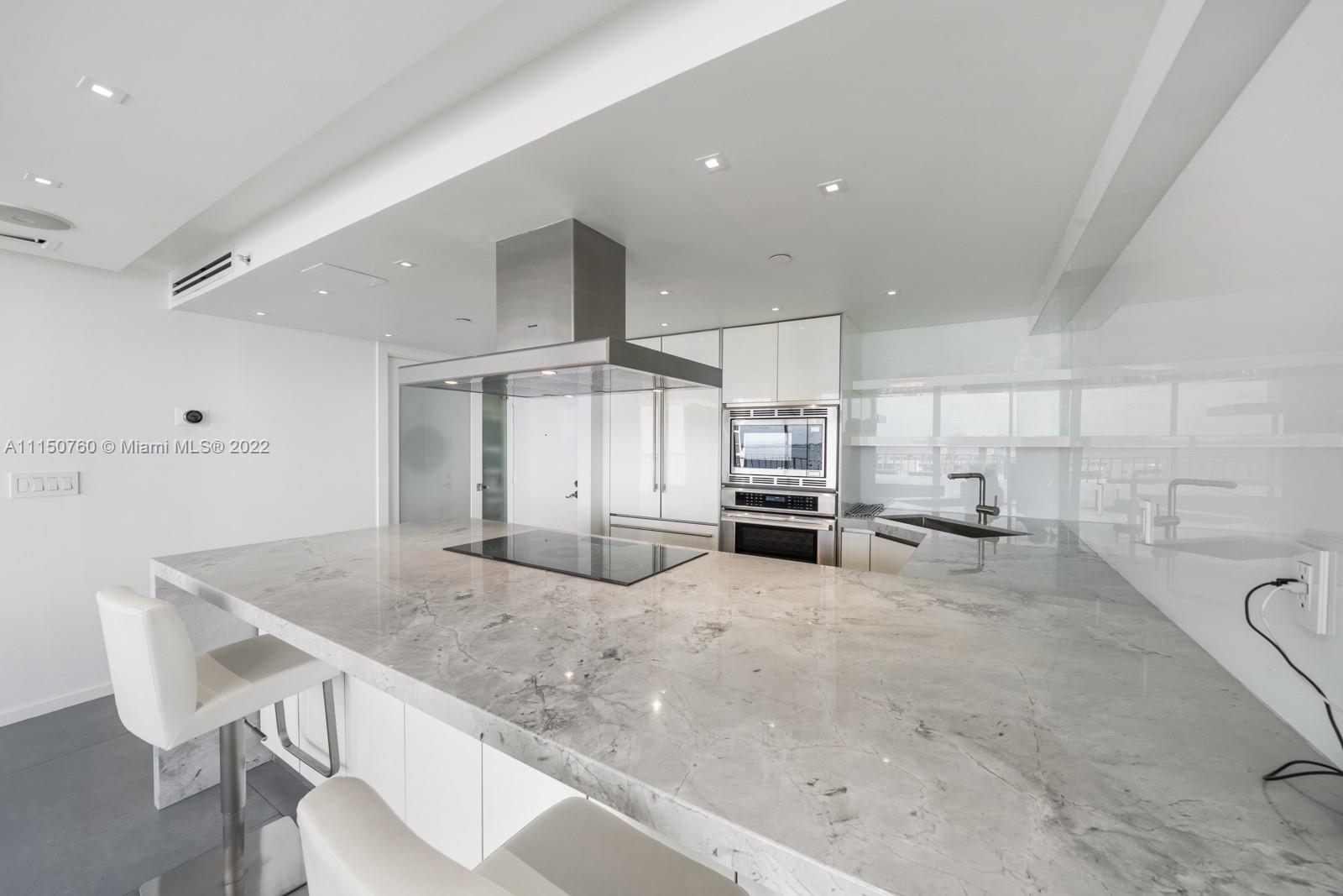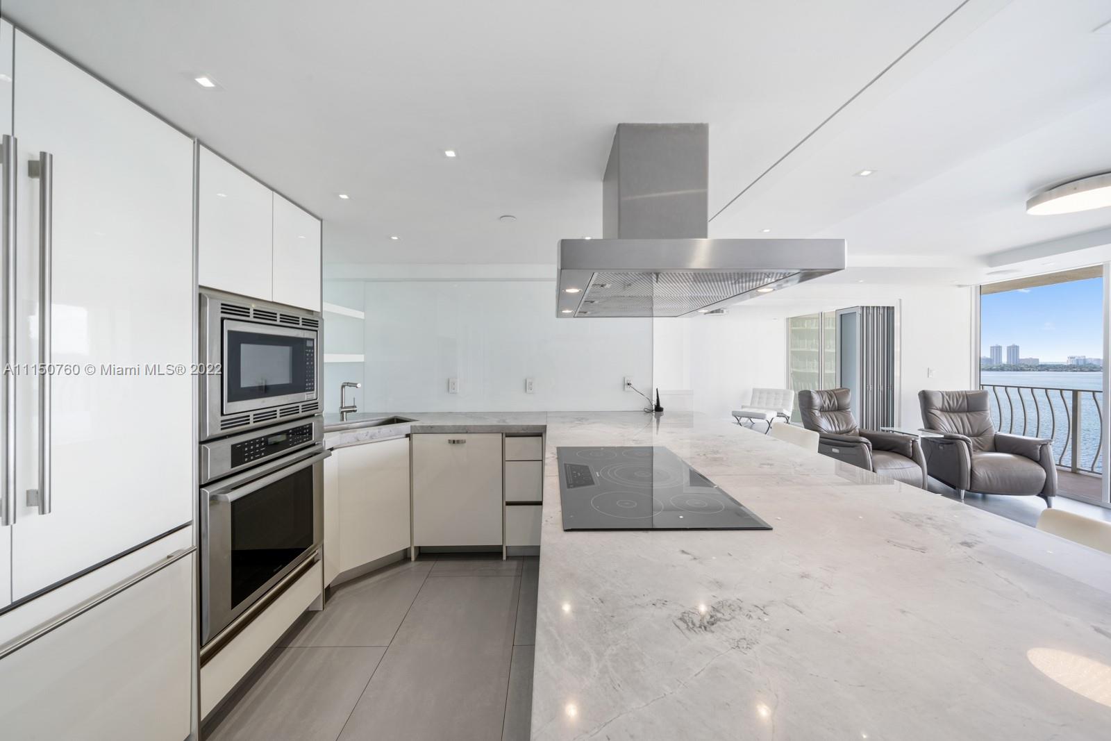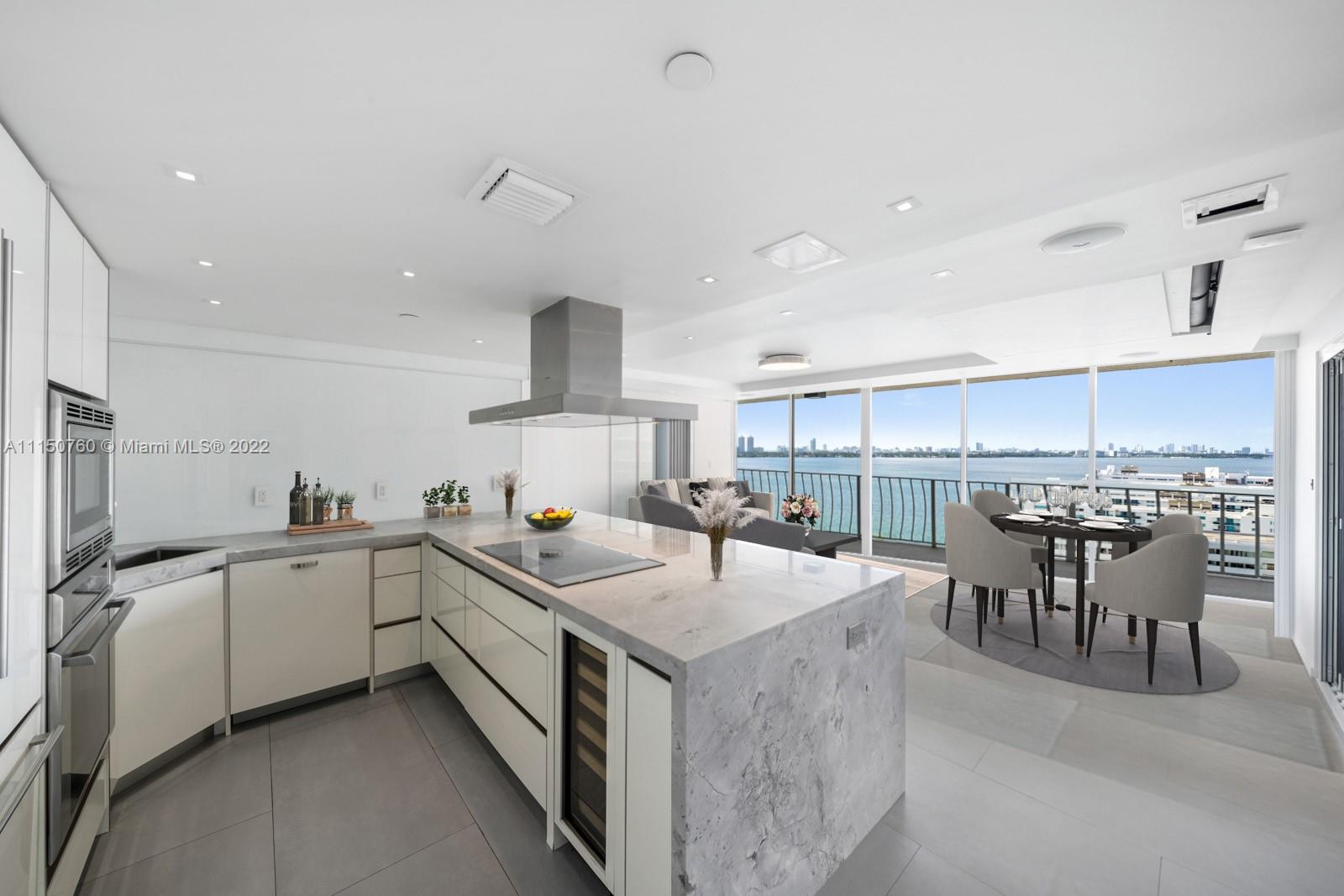 Spectacular one of a kind 2 bed 2 baths with panoramic waterfront views! Flow through this open concept condo that's been totally upgraded with no expense spared. High end Italian cabinetry includes top of the line Thermador appliances, including dishwasher, and wine cooler. Enjoy the huge oversized 6-person island which features a quartz waterfall and a glass 5 burner stove top overlooking the bay views. Bosch washer and dryer, 24x48 slate flooring, Floating 75-inch tv drops down from ceiling, automatic window shades and blackout curtains. Many amenities and 2 upgraded spacious parking spaces included!