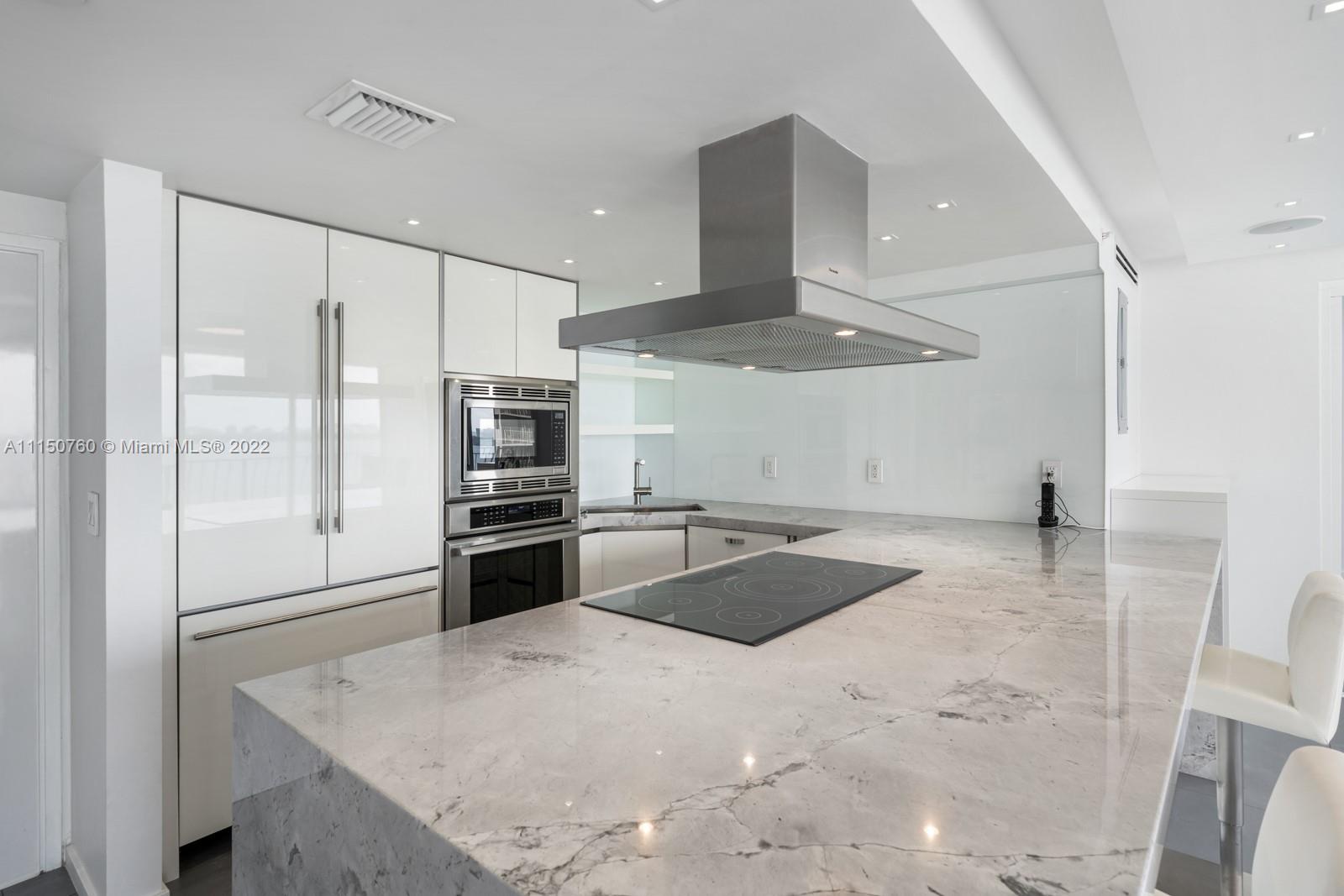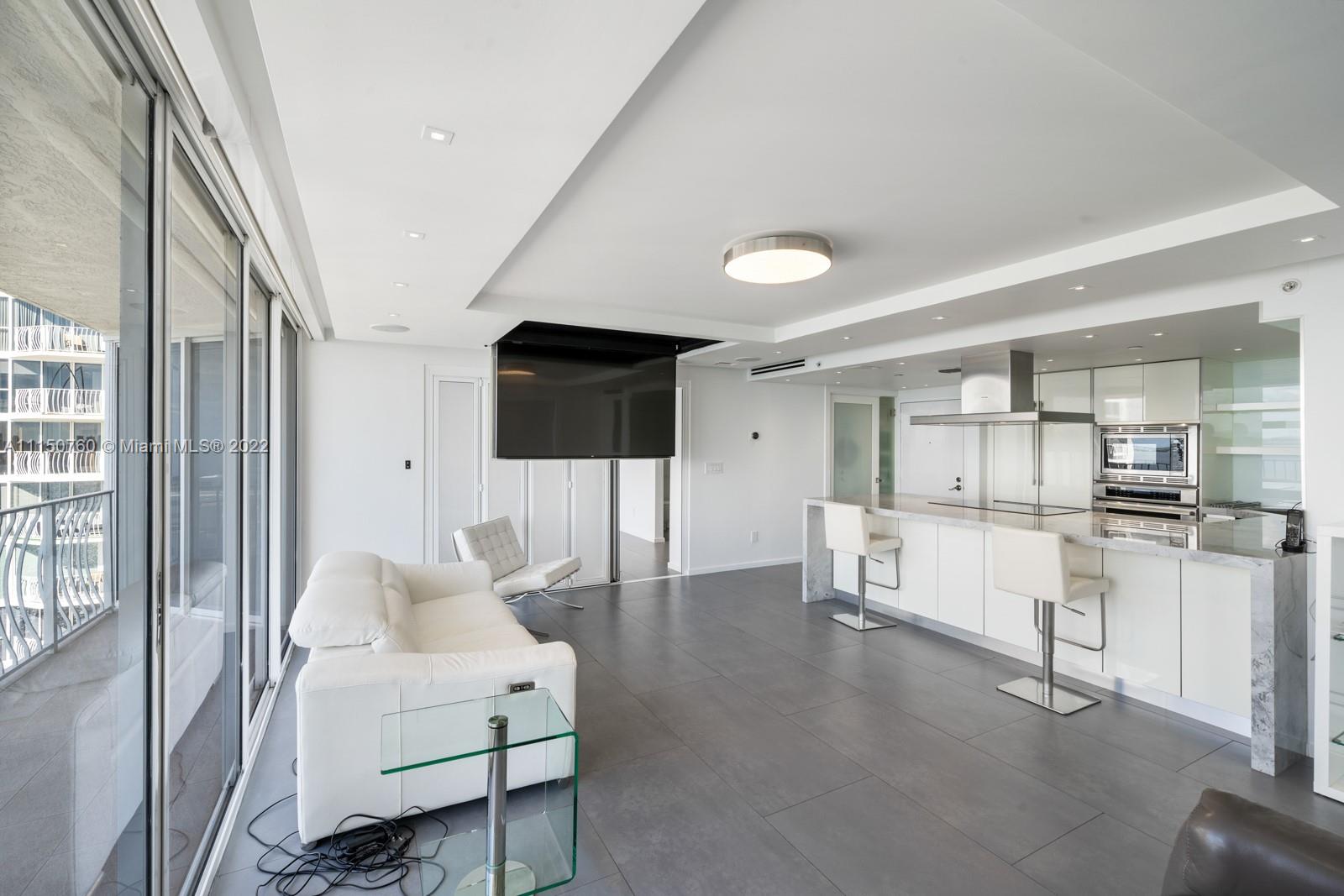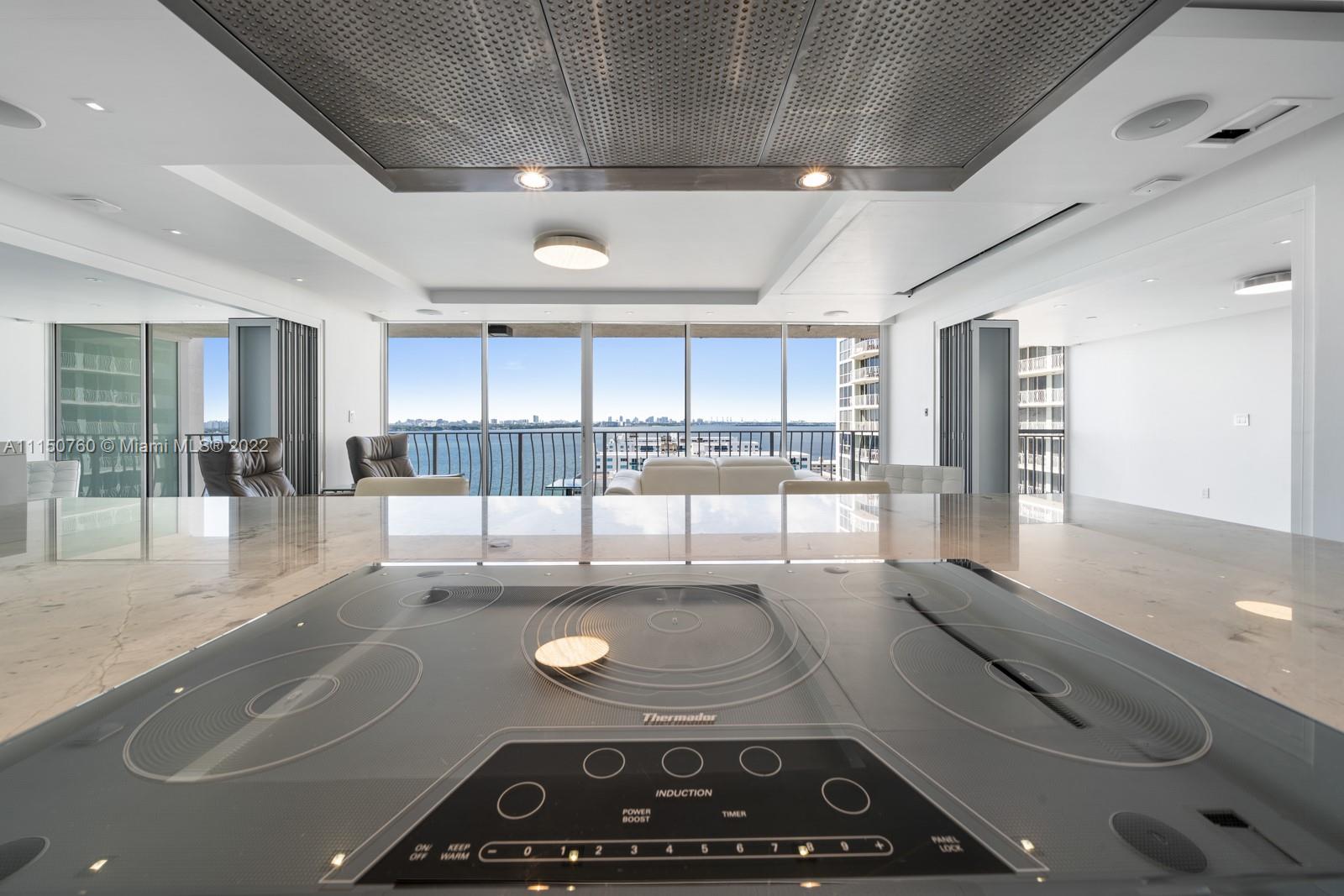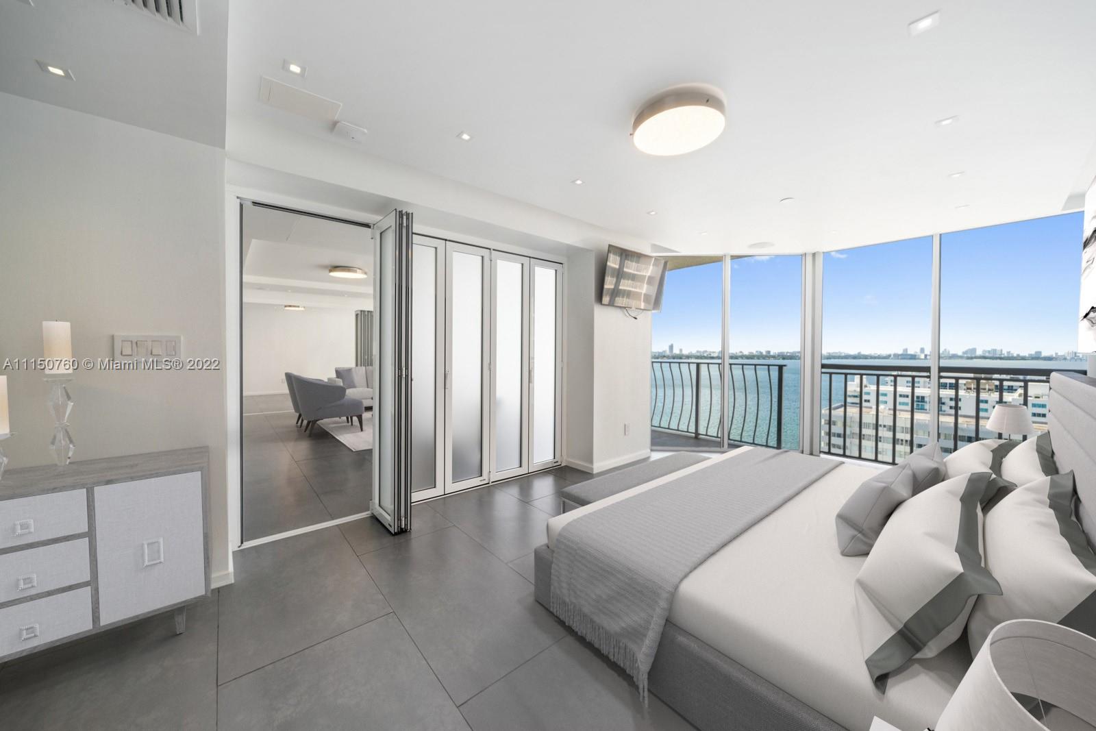 Spectacular one of a kind 2 bed 2 baths with panoramic waterfront views! Flow through this open concept condo that's been totally upgraded with no expense spared. High end Italian cabinetry includes top of the line Thermador appliances, including dishwasher, and wine cooler. Enjoy the huge oversized 6-person island which features a quartz waterfall and a glass 5 burner stove top overlooking the bay views. Bosch washer and dryer, 24x48 slate flooring, Floating 75-inch tv drops down from ceiling, automatic window shades and blackout curtains. Many amenities and 2 upgraded spacious parking spaces included!