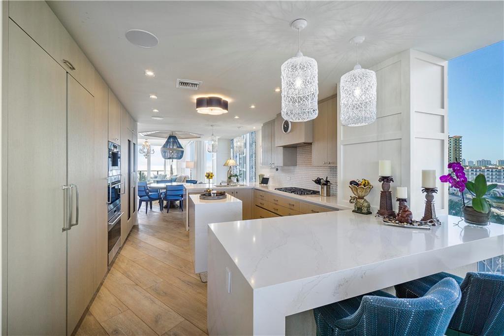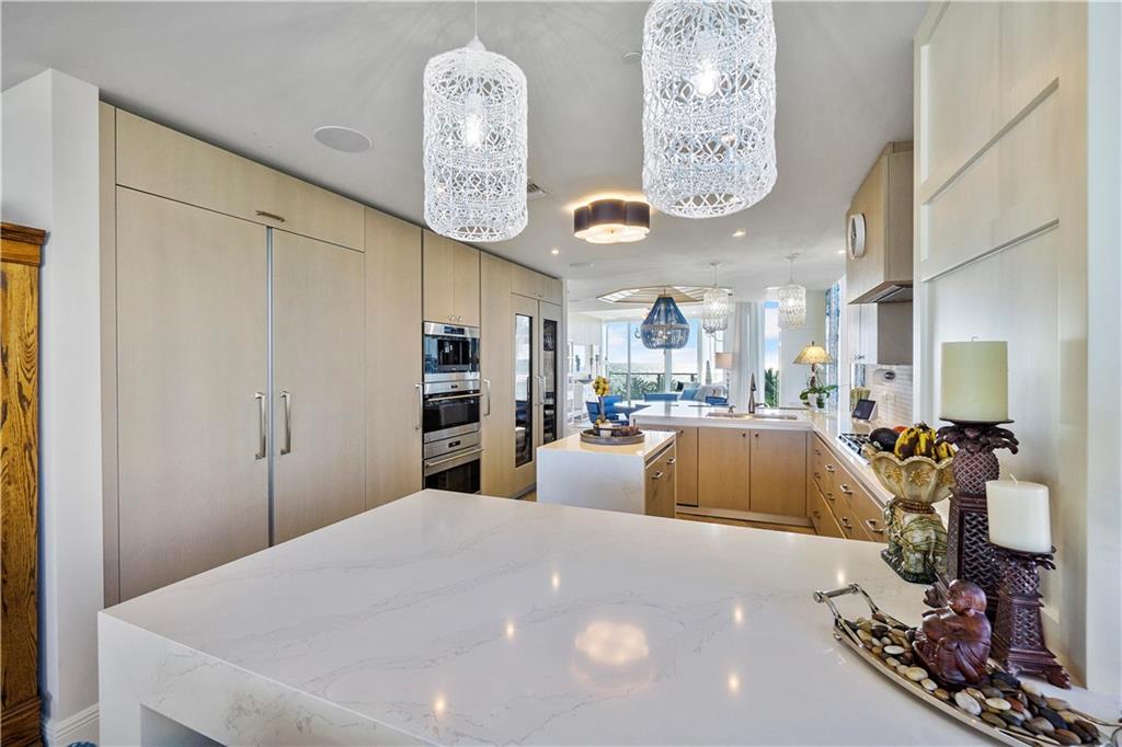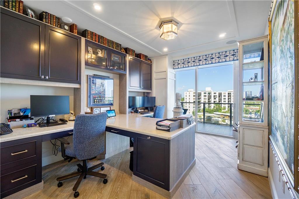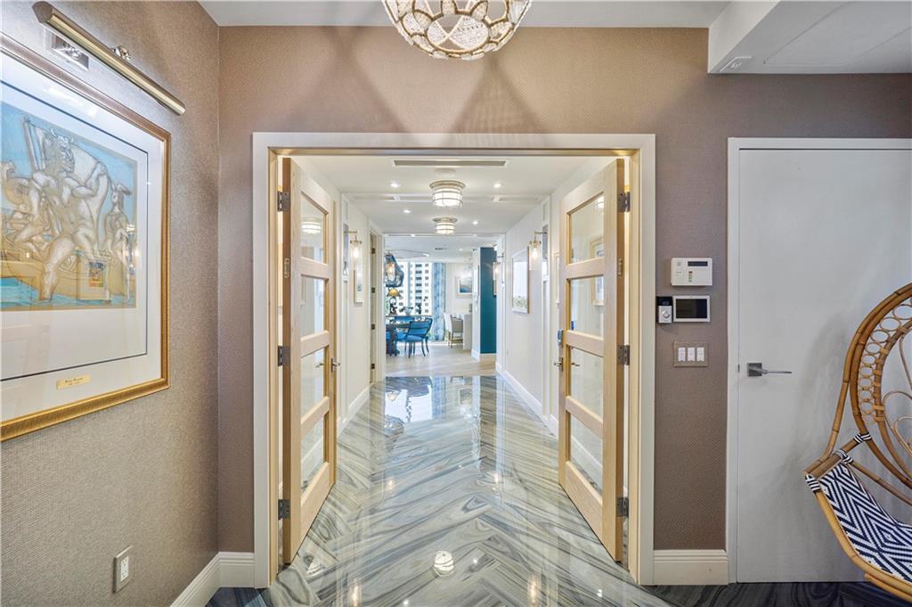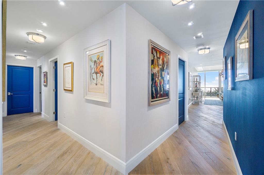 This exquisite corner flow-through floor plan stretches E to W providing direct sunrise ocean views & sunset city views w/an expansive terrace on each end. Enter through a private foyer & capture the stunning blue porcelain herringbone flooring w/a custom art gallery & gorgeous octagonal custom ceiling woodwork in the dining room showcasing the chandelier. This 4 bed (1 was used to expand the media room) & 5 bath residence includes a custom built-in office, a second master built-in walk-in closet w/quartz countertops, & a Den! The unit features a hand-painted tile powder room along w/custom millwork & natural oak flooring throughout. An upgraded Control 4 system is installed & includes complete control of lights, locking, blinds (day/blackout), & security cameras all w/Alexa!