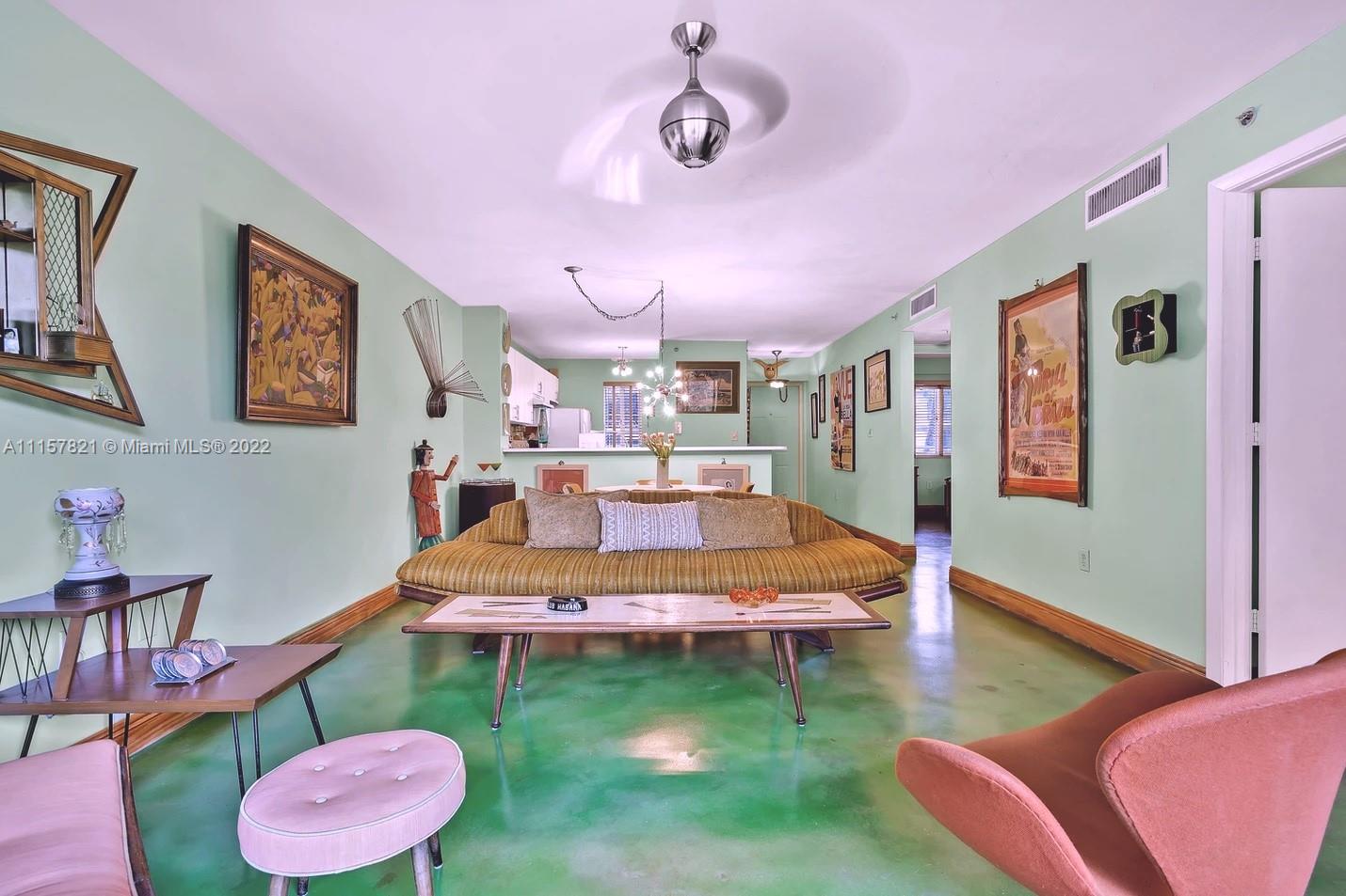 Are you among the millions looking to relocate/move to Miami Beach, FL? Then don't miss this opportunity to own this charming two-bedroom, two-bathroom condo, located in a desirable 52 unit building, with very low monthly HOA. The unit has gorgeous green stained concrete floors and soft mint walls, which are the "in" colors for 2022. The apartment is like walking into a time capsule with all mid-century furniture, and accessories (also available for sale). Great investment property since monthly rentals are allowed. Excellent walkability, steps from shopping, restaurants, and Lincoln Road Mall. Blocks from the beach, Whole Foods and Trader Joe's. One assigned, covered parking space included, and pets OK. This unit will sell fast!
