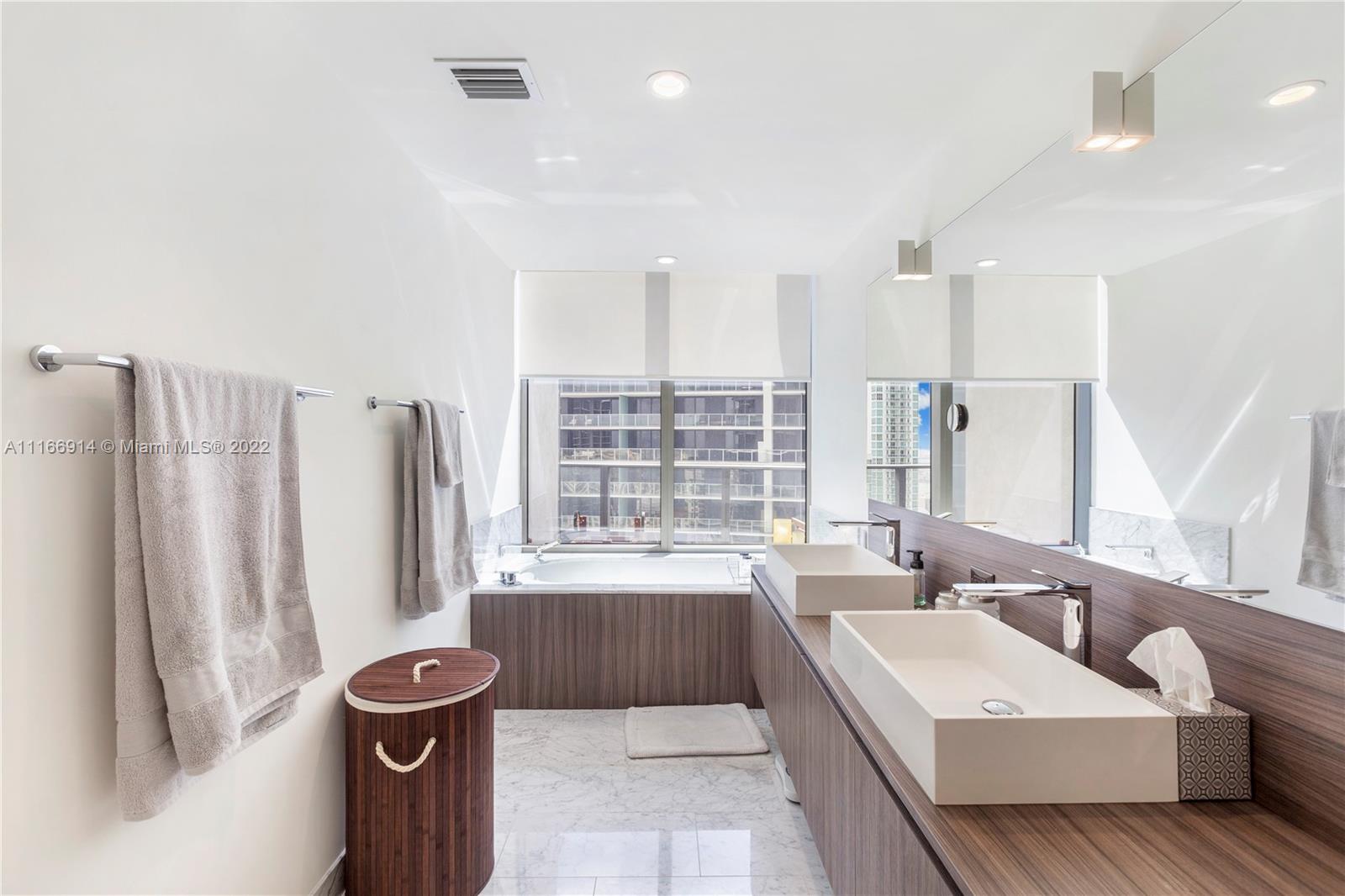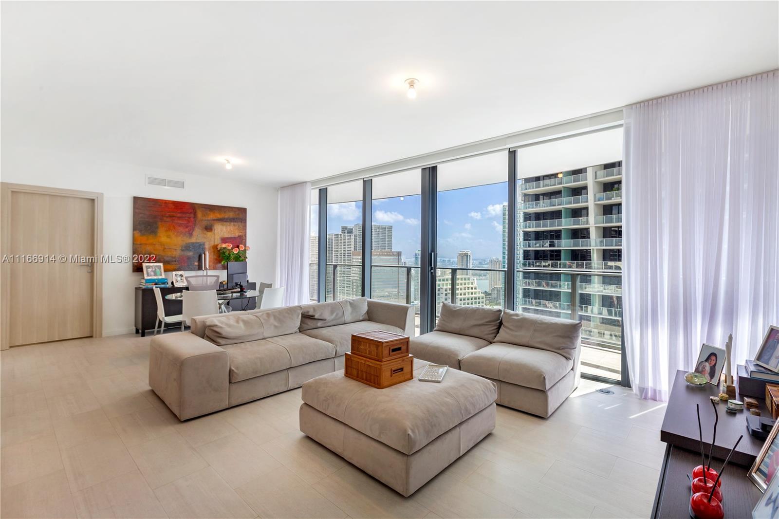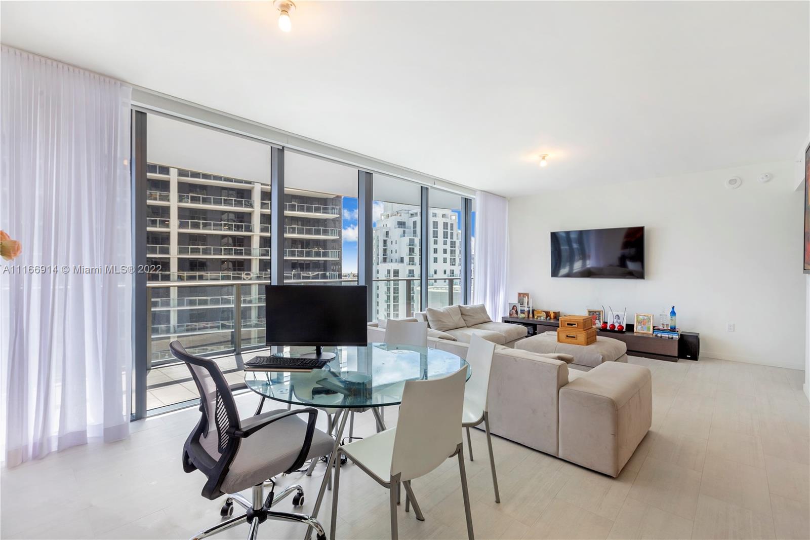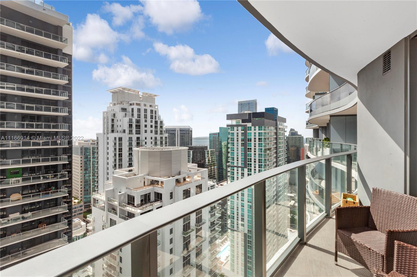 Magnificent skyline views complete this modern condo in the unique architectural icon developed by Ugo Colombo. With 1,236 Sq.Ft., its glass walls and elliptical balconies wrap around the 2 bedrooms and 2.5 bathrooms, kitchen, and living/dining room area. The imported Italian marble floors, accent walls, custom-designed cabinetry, and high-end, stainless steel appliances create a sophisticated style for easy living. This unit has a spacious washer and dryer walk in closet, smart master Toilet ,remote control blinds and 2 parking spaces.The amenities include a spa, gym, 2 pools, theater, lounge, billiards room, personal concierge, children's pool, and playroom, plus a secure parking garage with electric vehicle charging stations. Walking distace to all Brickell has to offer.