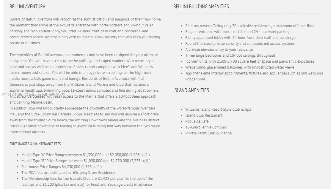 The seller bought #1903 model unit for $ 1,850,000 w/over $300,000 in ARTEFACTO professional decoration, probably the most beautiful unit in the building, Best Line w/ Water, Bay, Marina view, no Buildings in front. Never been rented, just used for short vacations, looks like brand new unit, must see. Ready to move in just bring your toothbrush. Total area 2,758 SF, perfect layout with 3-beds & 3-baths. Bellini is the newest development at Williams Island, You need understand what is a luxury country club life style w/ 27,000 SF, w/pool, spa, gym, tennis courts, playgrounds, 3 restaurants, deep water marina. Close to the Beach and Aventura Shop Center. The last sold Bellini 1204 .A11168377. April 28th 2022 for $ 1,752,600 . Buyer paying the the special assessments.
