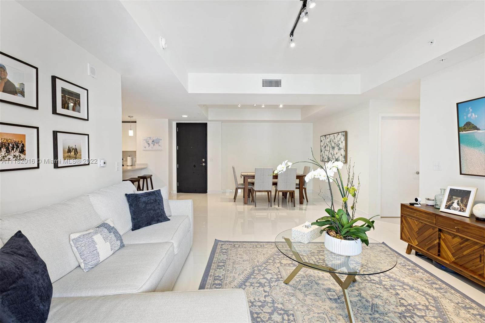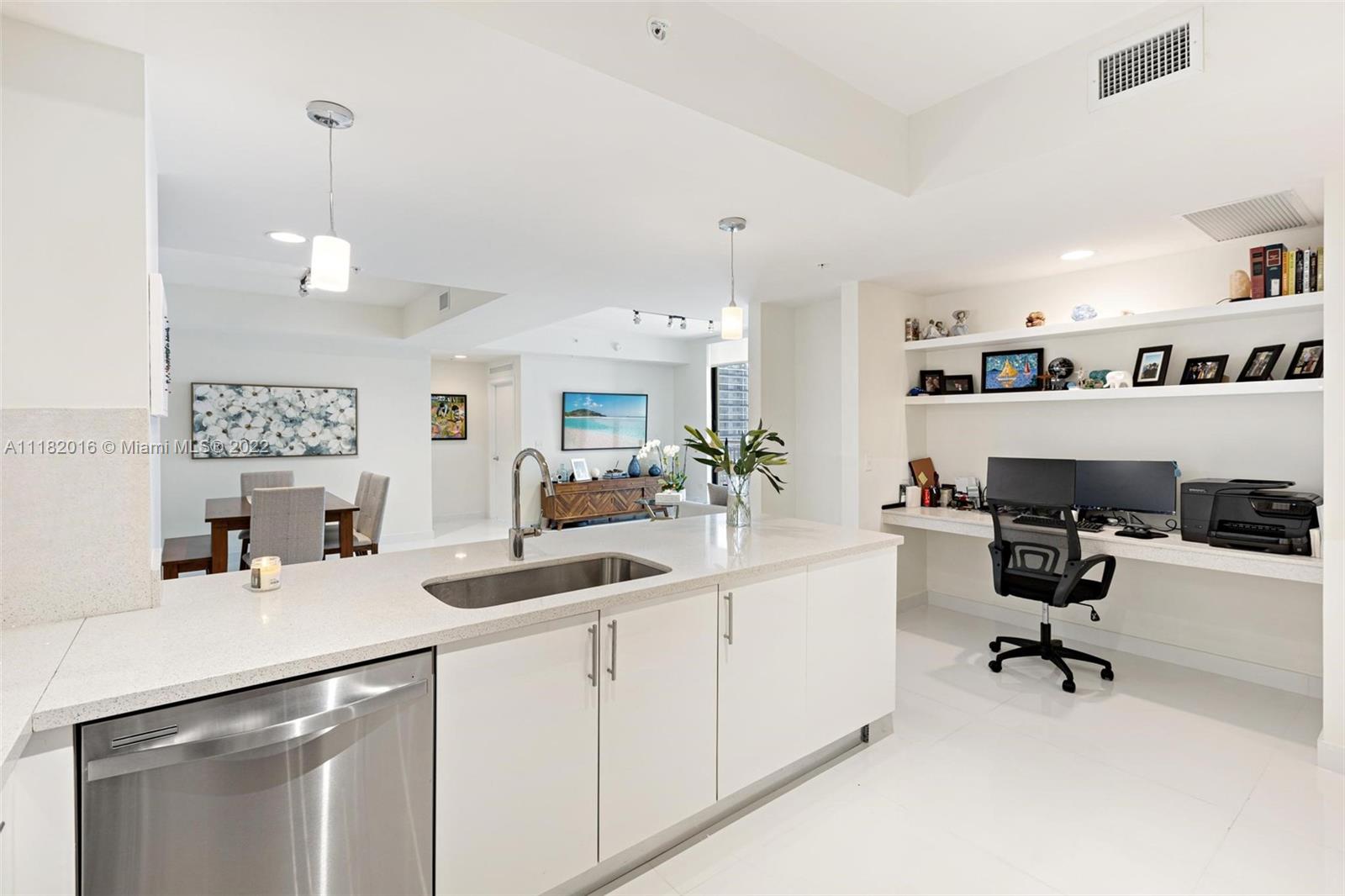 This is the epitome of city living, this two-bedroom unit offers 1,384 square feet of living area at the impeccable NINE building at Mary Brickell Village. This spacious apartment offers recently remodeled white porcelain tile flooring from PORCELANOSA (36 x 36 inches) and built California closets. The split floor plan offers a built-in work area adjacent to the kitchen and a private laundry room. The master bedroom offers a large walk-in closet and ample master bath. The NINE has it all, with fabulous amenities located on the 11th floor including a rooftop pool, bbq, child playground, library, private party room, game room, and a full gym. Located above Publix and across from the Metrorail station, just a few blocks from Brickell City Centre and some of Miami's finest restaurants.