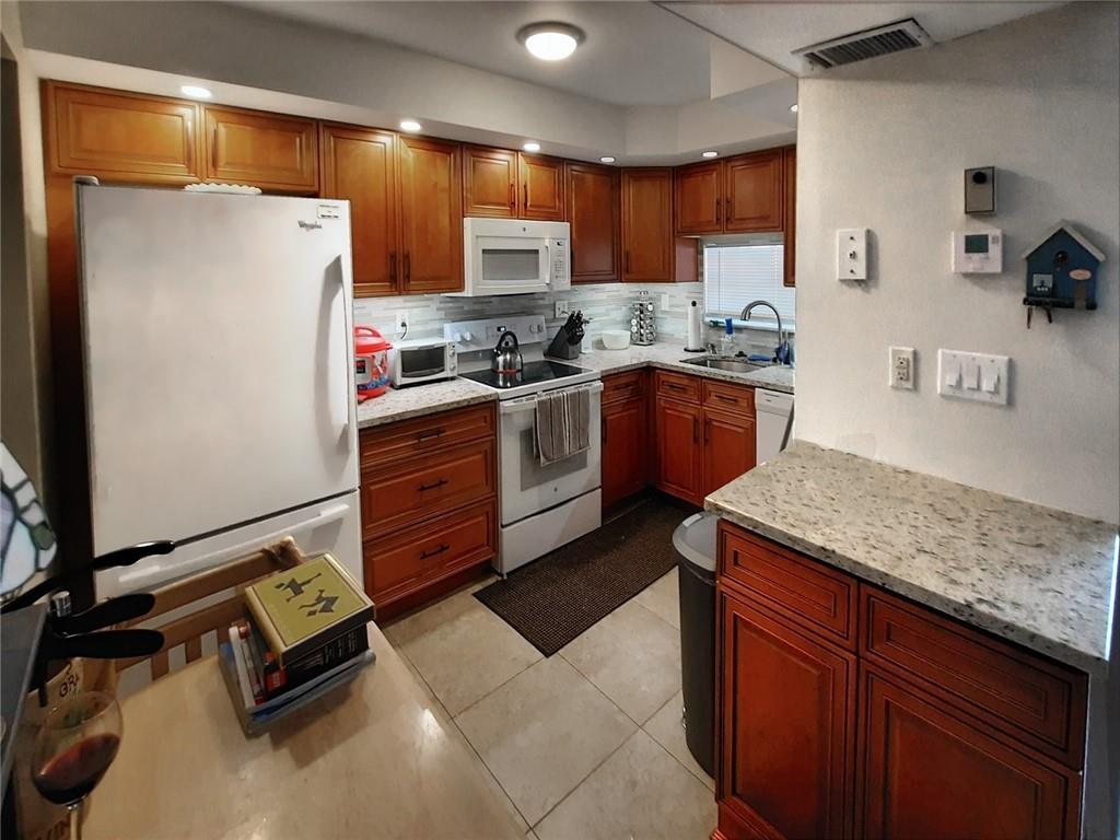Enjoy country club style living in this upgraded 1st floor, 2 bed convertible with a peaceful water view. Nicely furnished and move in ready if desired. All tile floors. Living room has been extended into glass enclosed patio with back door leading out to beautiful canal view. Kitchen has been recently remodeled with new cabinets with granite counters, raised ceiling and modern appliances. Bathroom cabinets and floors have been replaced (master bath is handicap accessible). Front bedroom has been opened up as a convertible room with a slider. Front door closet has been fitted with washer/dryer hook ups with ventilation. Assigned parking in front. Plenty of guest spaces. Paid up rec lease. * See Broker Remarks below for occupancy qualifications.