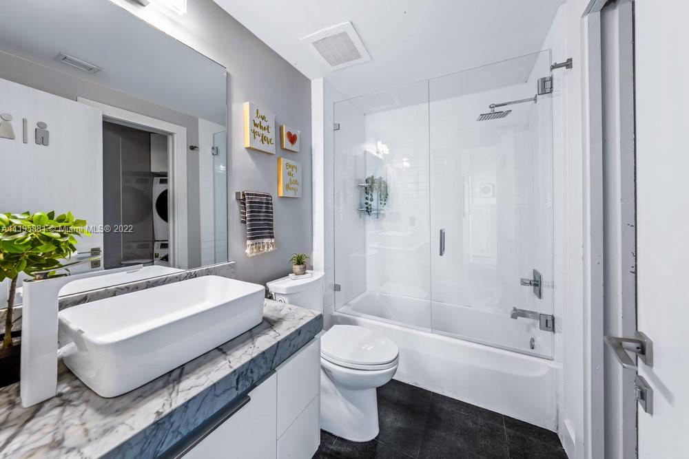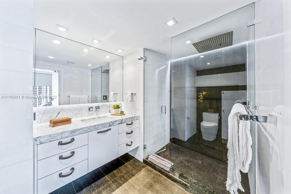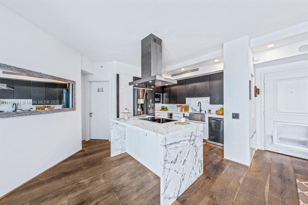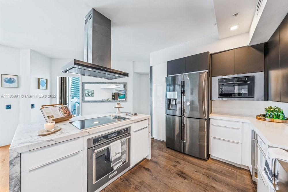 Secure the height of luxury; no expense has been spared on this recently renovated 2BED/2BATH condo looking onto Biscayne Bay's waters in Miami's East Edgewater. The residence boasts 10-ft ceilings, hardwood floors, a fabulous black stainless steel kitchen w/ clean lines, a featured marble island bench perfect for cooking, and a custom open floor plan for entertaining. The split bedroom layout features a primary suite w/ limestone and marble finishes bathroom and a large wardrobe w/ built-in cabinetry. Capture sweeping views from the second suite. Floor-to-ceiling impact glass windows and doors open to a generous, private balcony to take in the views. In-unit cleverly concealed laundry. One garage parking, 24-hour security, concierge services, and all the amenities of a luxury high rise.