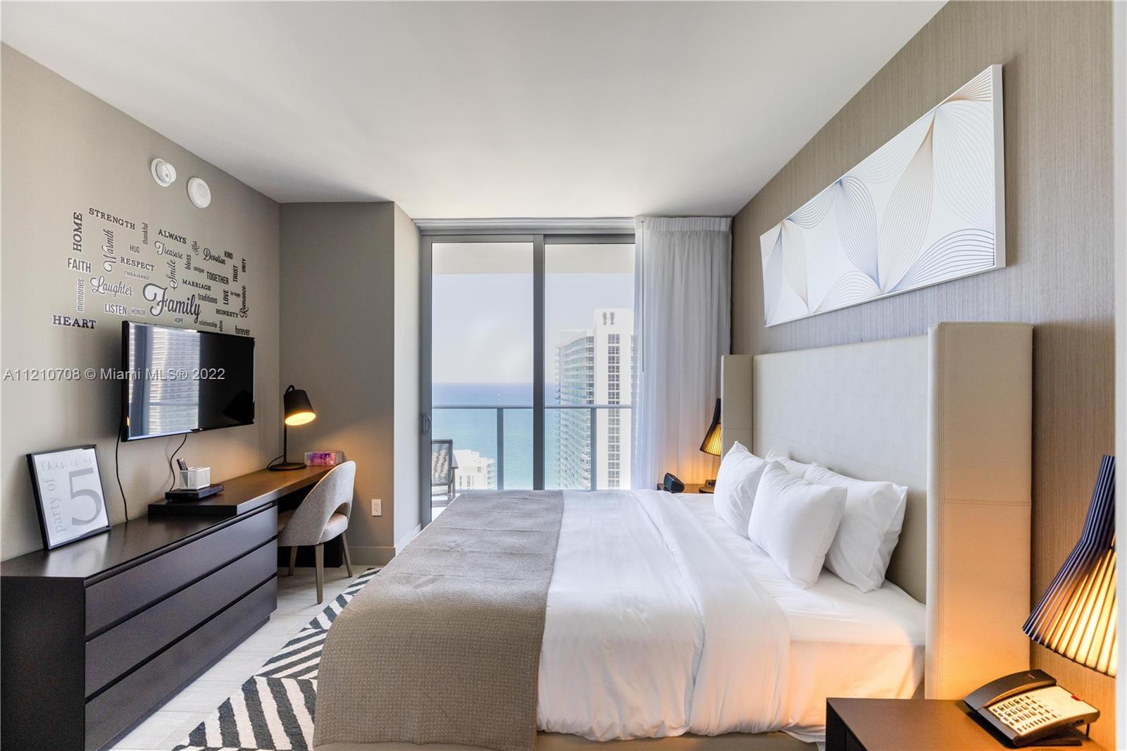 One of the nicest unit in the building, 38th floor with spectacular breathtaking ocean views, spacious flooplan with 1,054 sqf of living area plus 215 sqf of balcony, 2 bedroom, 2 bathroom split floorplan, beautiful and modern open kitchen with all Italian cabinetry, tastefully and completely furnished and decorated, and rarely used. A five star resort building across from the beach and next to all the action and convenience. Owner can reside permanently, rent through the onsite condo-hotel program or manage privately (Airbnb). Amazing income producing property. Resort like amenities, includes a private beach Club with ocean access, 3 heated oversized pools, tennis, basketball and racquetball courts, state of the art gym, club room, restaurant, exclusive access to roof top lounge.