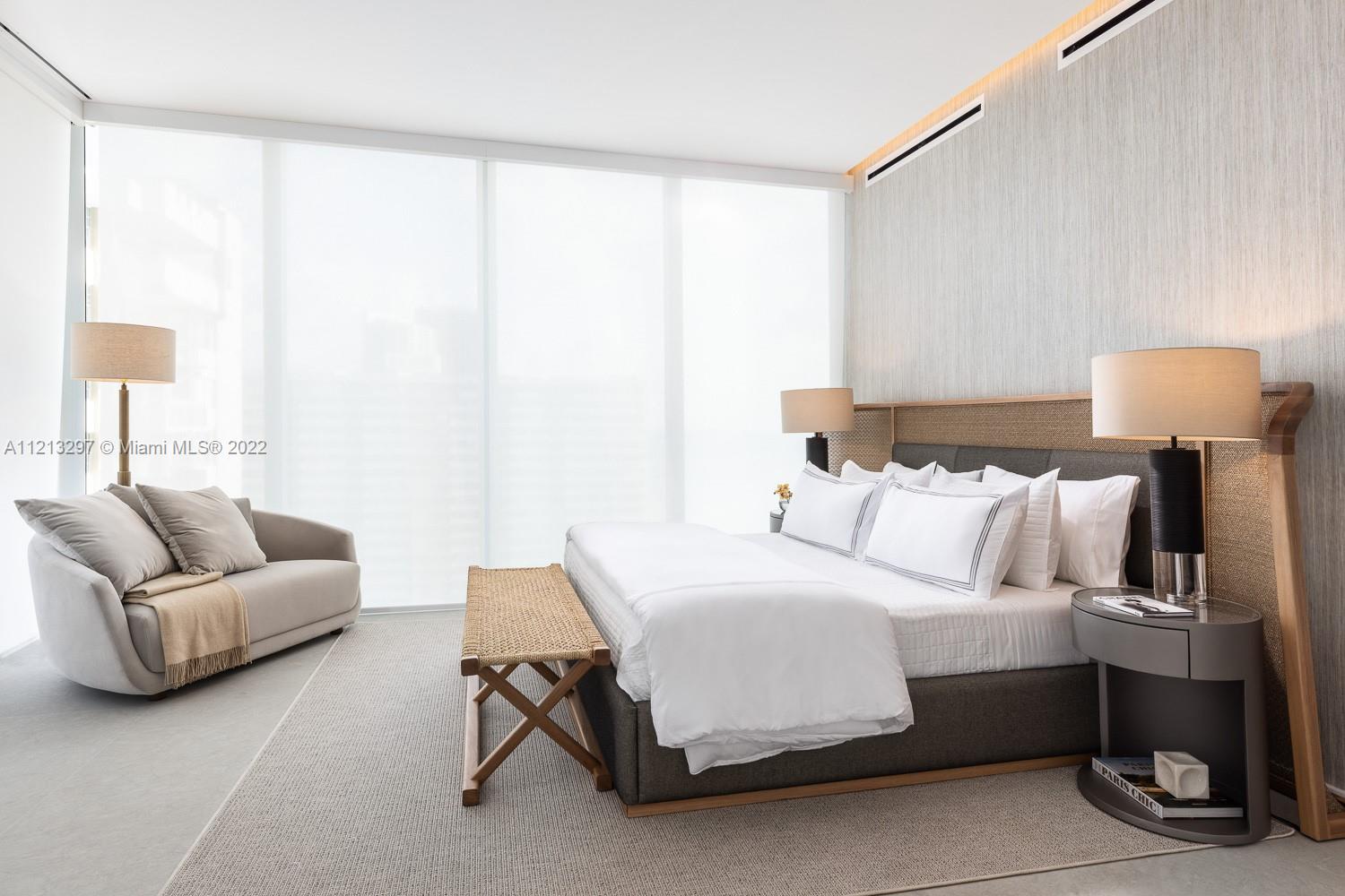 Luxury boutique property just North of Golden Beach. This contemporary 38 story glass tower showcases panoramic views of the Atlantic Ocean, Intracoastal Waterway. This gorgeous north residence model has been staged by Artefacto includes everything in the unit except for the art work that could be purchased separately. $397K worth of furniture, accessories including wall paper and window treatments. This residence has a light Boffi Kitchen and dark closets done by B&B Italian. Piedra Serena finished floor throughout the residence. 10 ft ceilings. Private elevator landings with facial recognition, 24 hr concierge and security.