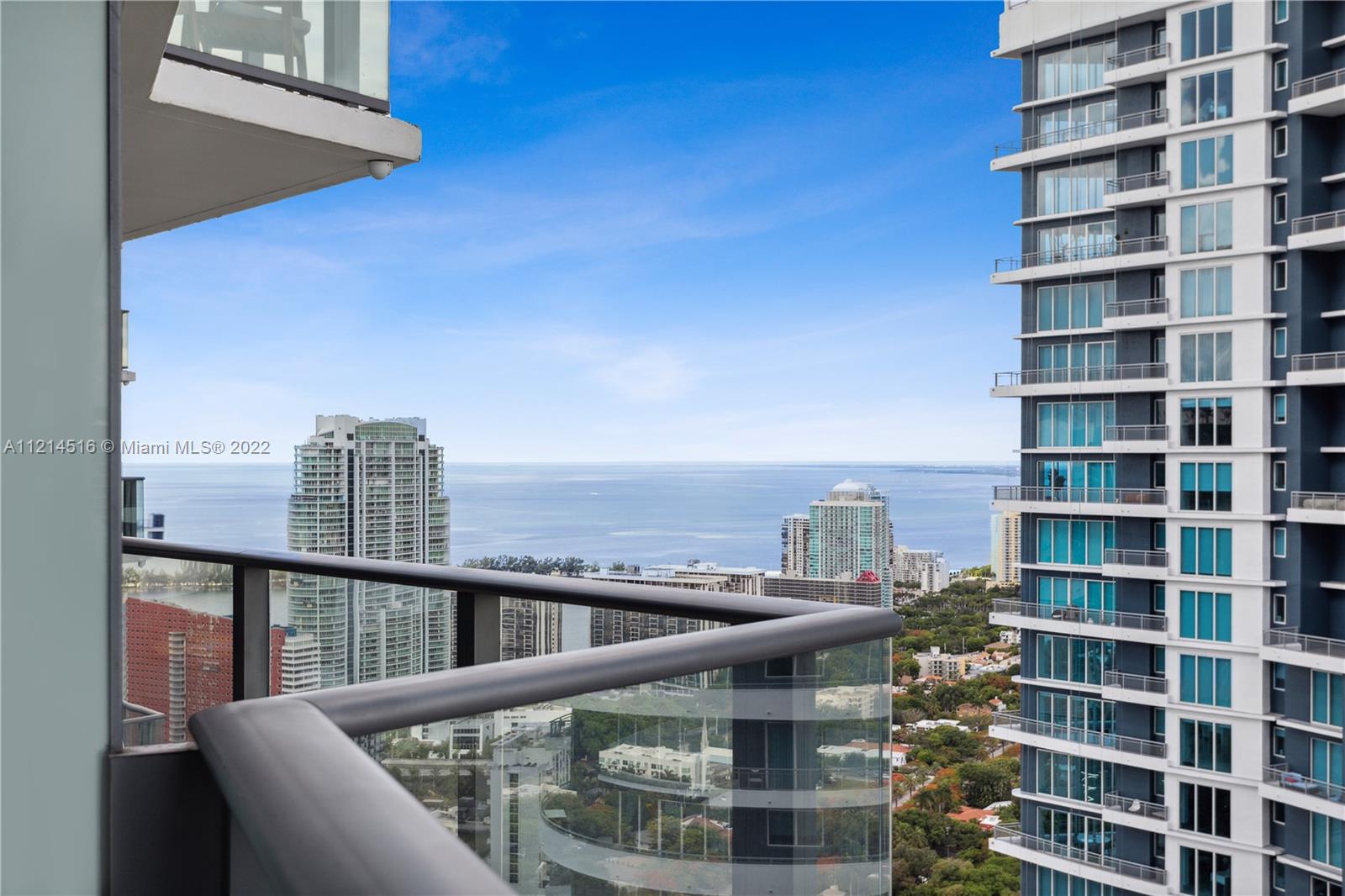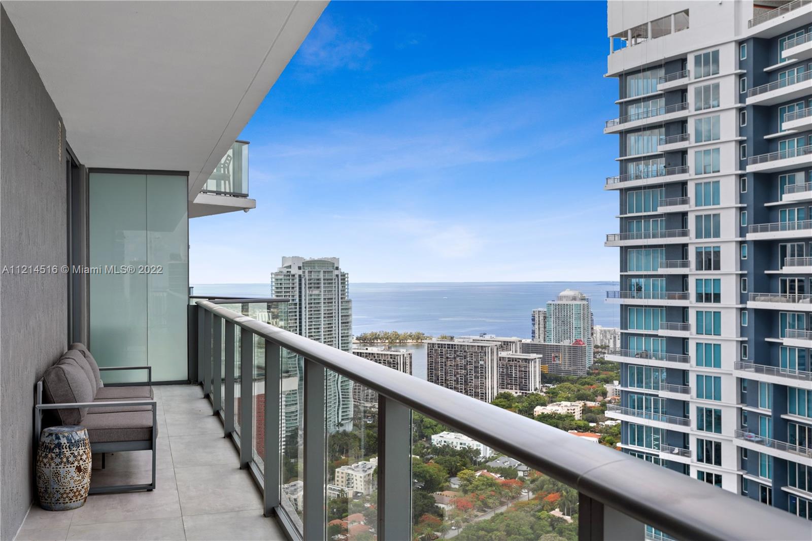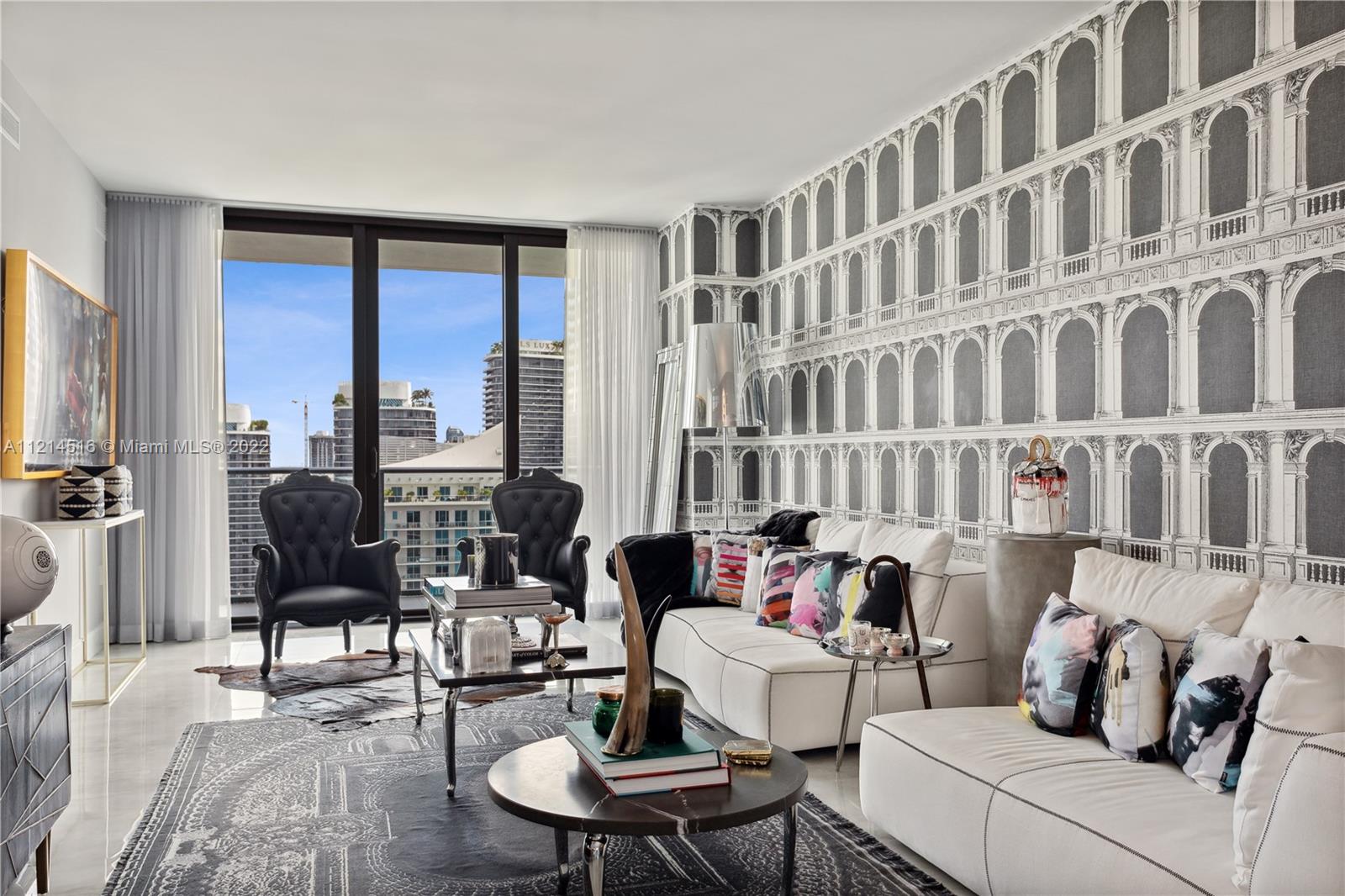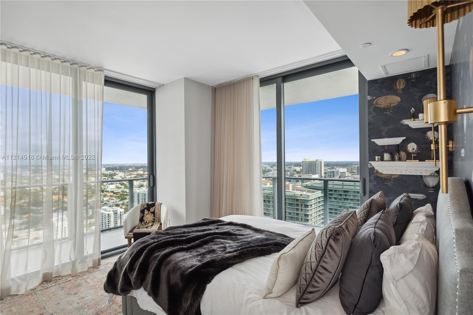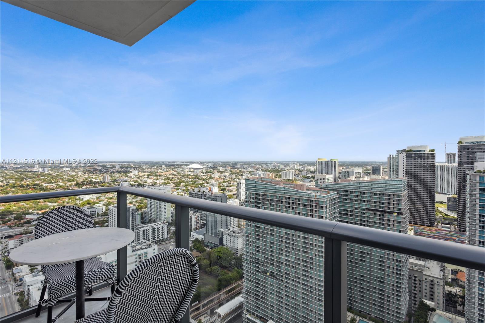 Large corner unit 2bed 2bath + Den. Wrap around balcony with stunning panoramic views to Miami skyline, the bay, and the ocean. Rated as one of the best finished apartments in the high floor 2-bedroom category. Italian A+ Porcelain Ceramic floors throughout the unit, top of the line appliances, built up closets, black out & sheer curtains, Interior spaces designed by Fornasetti. SLS Brickell is combined with 5-star hotel services; amenities include roof top pool (for residents only) spa, fitness center, movie theater, restaurants and more.