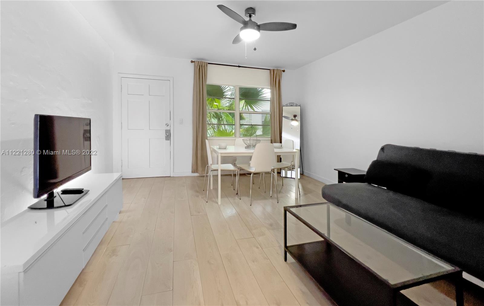 This partly-furnished junior one-bedroom apartment is in the heart of everything South Beach offers, just minutes away from Flamingo Park, Ocean Drive, and Lincoln Road! Investors will see good ROI after purchasing this unit with a great tenant in place until February 2023, paying $1,750 per month. The unit features a closed-in sleeping space with a closet, a large in-wall A/C unit, ceiling fans in the living room and sleeping area, a new all-in-one washer/dryer, and a back patio. Street parking permits are available to South Beach residents. The building is pet-friendly for up to 20 pounds and is well maintained by Blue Sky Management. Cash or conventional loans with 25% down for primary residence or 30% for an investment loan.