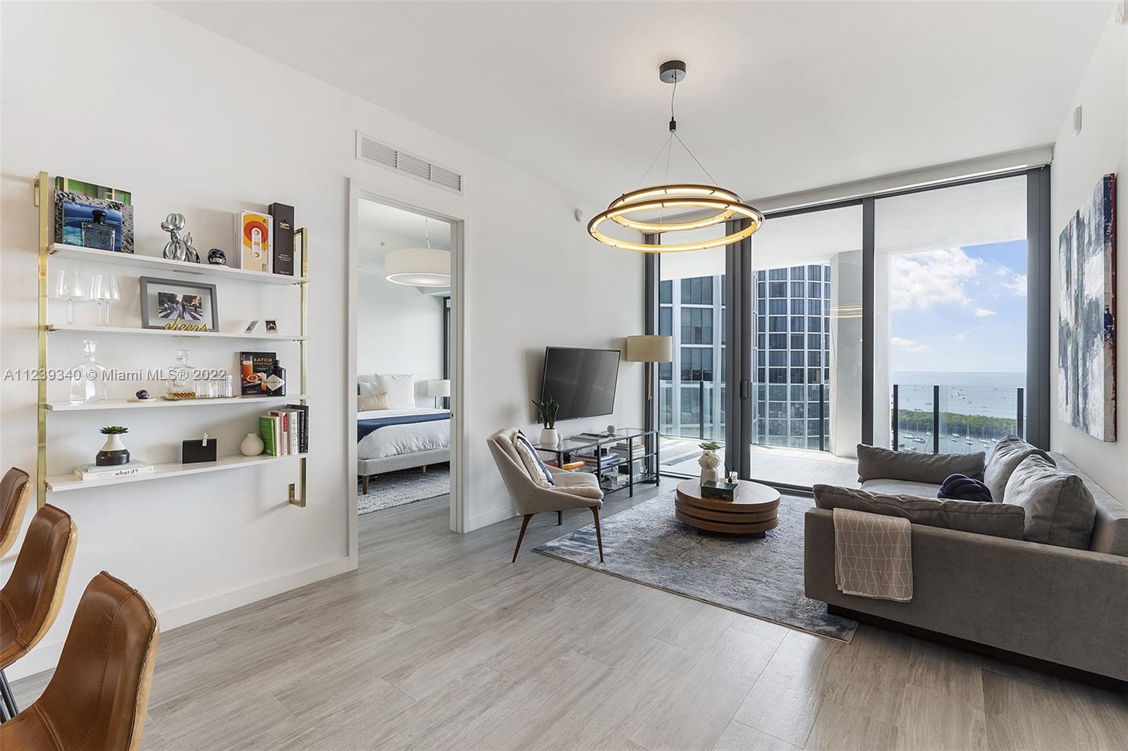Fantastic Views from this desirable 02 line. Split 2 bedroom plan plus den/office featuring custom built-ins, top of the line kitchen appliances with subzero and wolf appliances, gas cook top & marble counter top. Enjoy gorgeous bay views from your expansive terrace. Park grove was designed by award- wining architect : Rem Koolhaas offering amazing amenities. Excluded from Sale: Living Room & Master bedroom lamps.