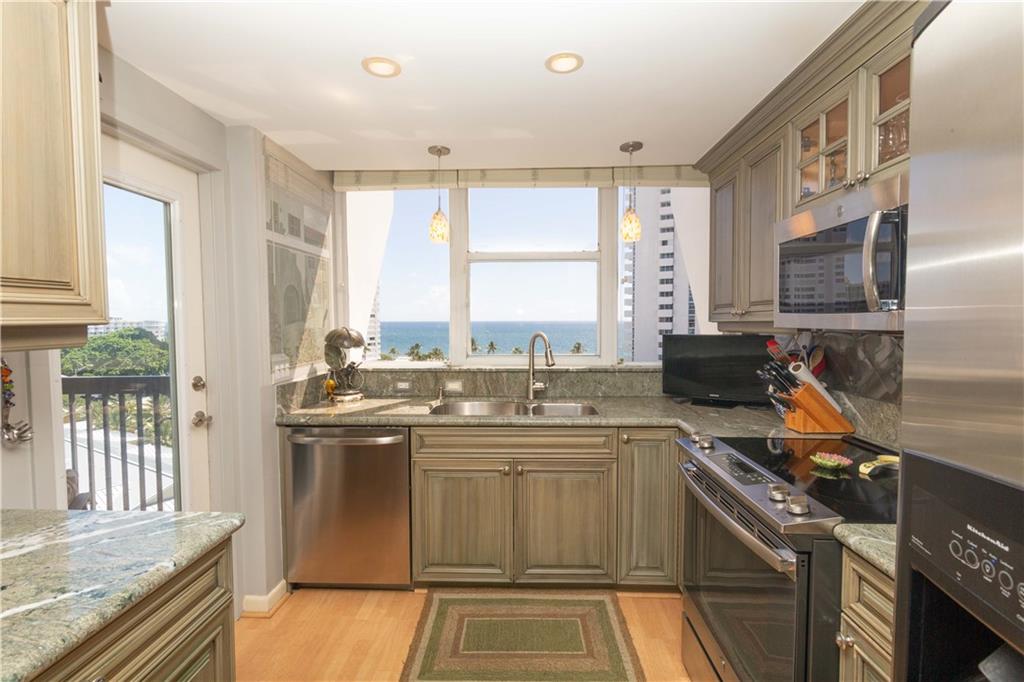 STYLISHLY UPDATED NE CORNER UNIT WITH OCEAN AND INTRACOASTAL VIEWS. OPEN AND SPACIOUS WITH TWO BALCONIES. UNIT FEATURES INCLUDE A LOVELY KITCHEN WITH SOLID WOOD CABINETRY AND ELEGANT GRANITE COUNTER TOPS. W/D IN UNIT. BOUTIQUE BLDG THAT IS VERY WELL MAINTAINED AND MANAGED. THE BUILDINNG FEATURES AN INCREDIBLE RESORT STYLE POOL WITH SEPARATE HOT TUB, BBQ GRILLS, TIKI HUTS. PET ALLOWED UNDER 25 LBS. SITUATED ACROSS THE STREET FROM GOLDEN SAND BEACHES AND BEAUTIFUL BLUE WATERS OF THE ATLANTIC OCEAN.