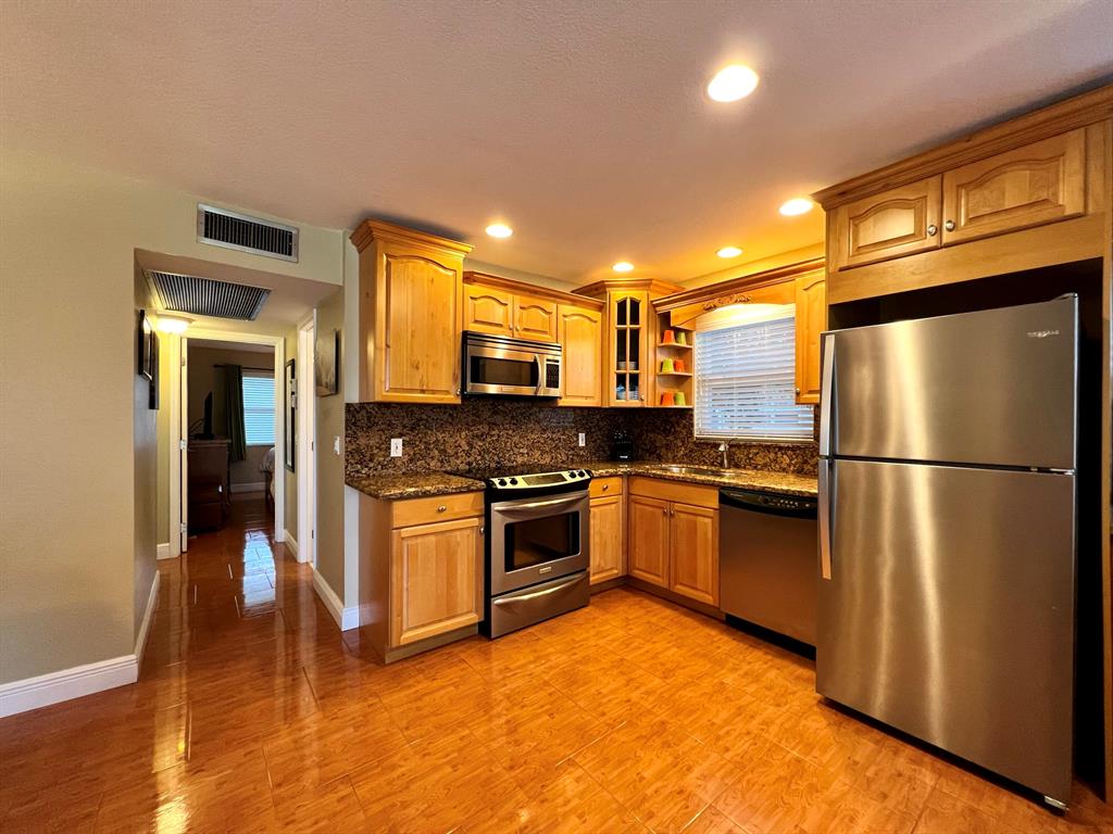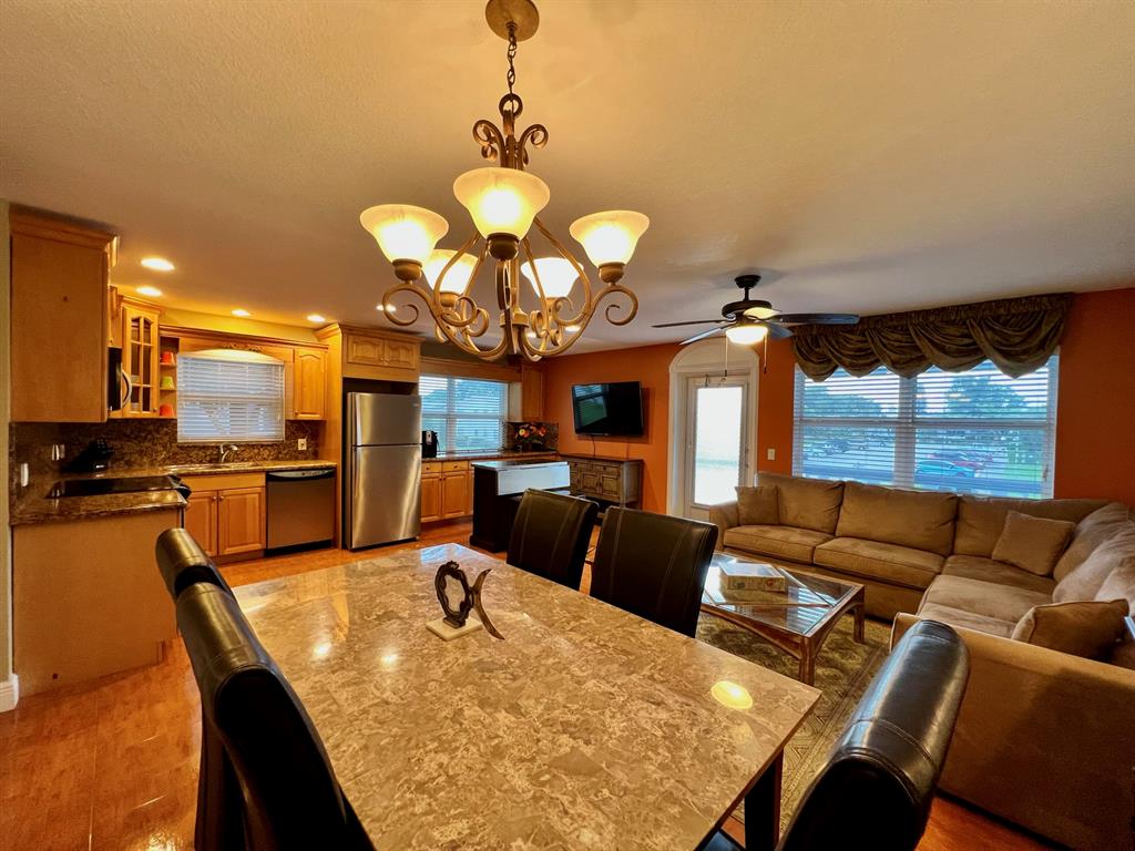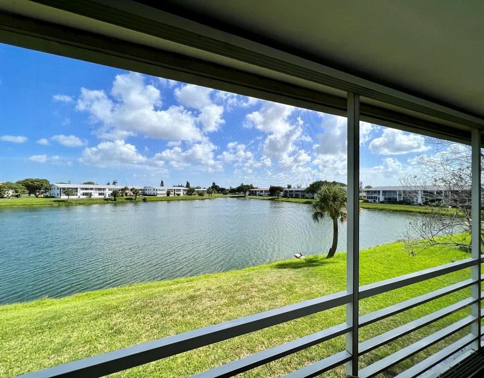 Impeccable move-in ready CORNER condo with gorgeous WATER VIEWS in 55+ Century Village! Updated open kitchen upgraded with expanse of cabinets & granite counters, stainless appliances, and high-hat lighting. Beautifully updated bathrooms. Gorgeous water views from the long lanai; a terrific spot to sit back and relax. Impact windows. Interior doors updated. Tile flooring throughout. Newer AC. Well maintained building. No pets or rentals. Sold AS IS and partially furnished (stainless top island with two stools, living area couch, area rug, glass top coffee table, mirror and primary bedroom bed & dresser to stay). You will want to call this spot home! Century Village is a 55+ community with so much to offer...