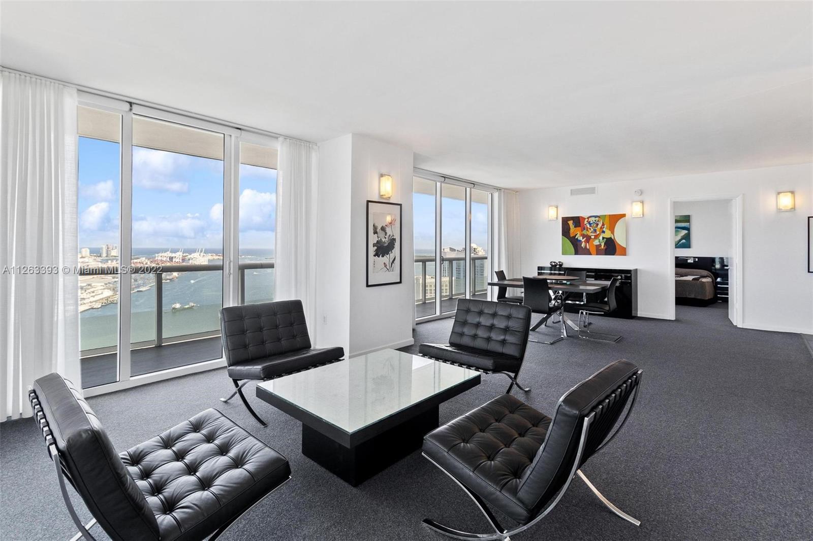 A must-see, fully furnished condo including original art work with breathtaking views of Miami, Biscayne Bay and the Beaches. Rarely available, high floor, 3 bedrooms 2 baths NE corner unit with a wraparound terrace; electric blinds and curtains available turnkey. Amenities include: 24 hr concierge and security, fitness center, sauna & spa, infinity pool and jacuzzi with cabanas, social room, valet parking and more. Walkable Downtown location, opposite Bay Front Park, in close proximity to Miami's top restaurants, Whole Foods, Silverspot Cinemas, Bayside Marketplace, FTX Arena, and many of Miami's best events. 3rd floor parking space steps away from the elevator. Original owner, rarely lived in, used as a short term vacation home.