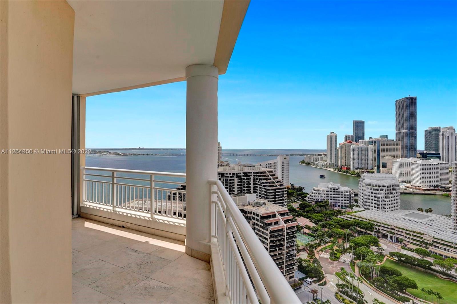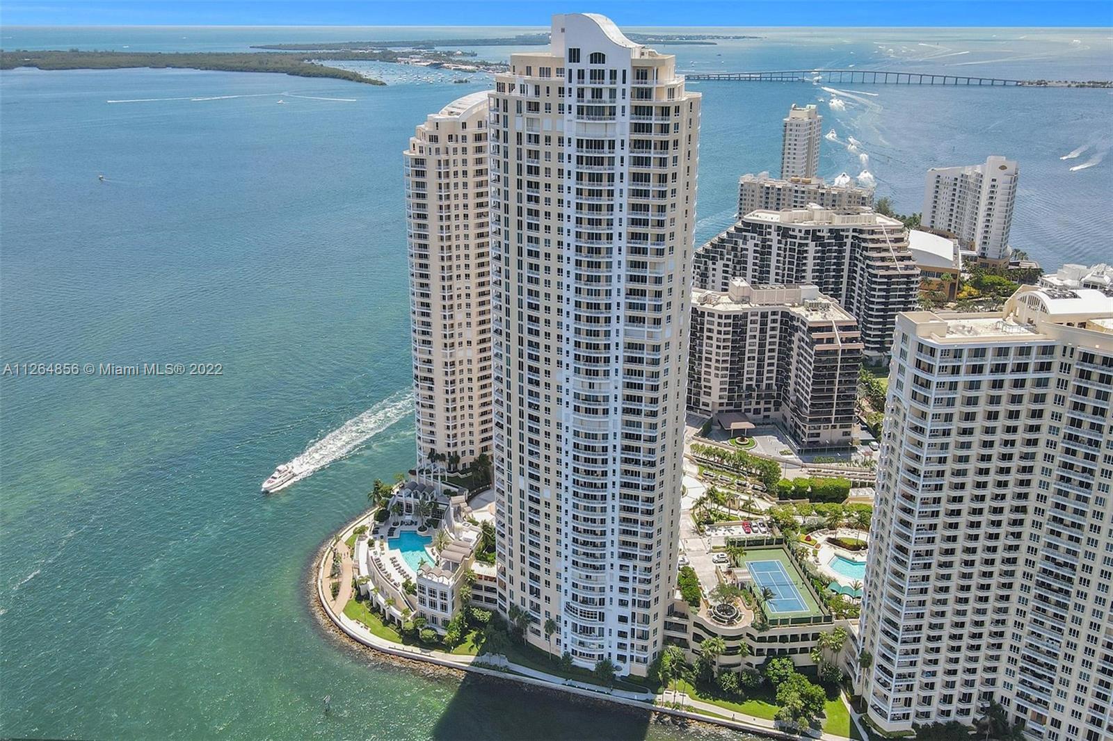 Extraordinary unobstructed views of the bay, river, and astonishing city lights from two wraparound huge balconies providing an 180 degree view. Do not miss out on this corner unit located at exclusive Brickell Key Island. With a well-designed split-floor plan and full of light, this unit provides a unique North and Southwest exposure. Only 6 apartments and 4 elevators per floor. Marble and wood floors, ss appliances, custom closets, laundry area, 2 side by side parking spaces and a storage area. Impact windows and shutters. Unit in excellent condition, ready to move in. Resort-style amenities, including a two-story, fully-equipped fitness center; a bay front pool; a bbq area; tennis, squash, and racquetball courts; a business center; concierge and valet parking services. Easy to show.