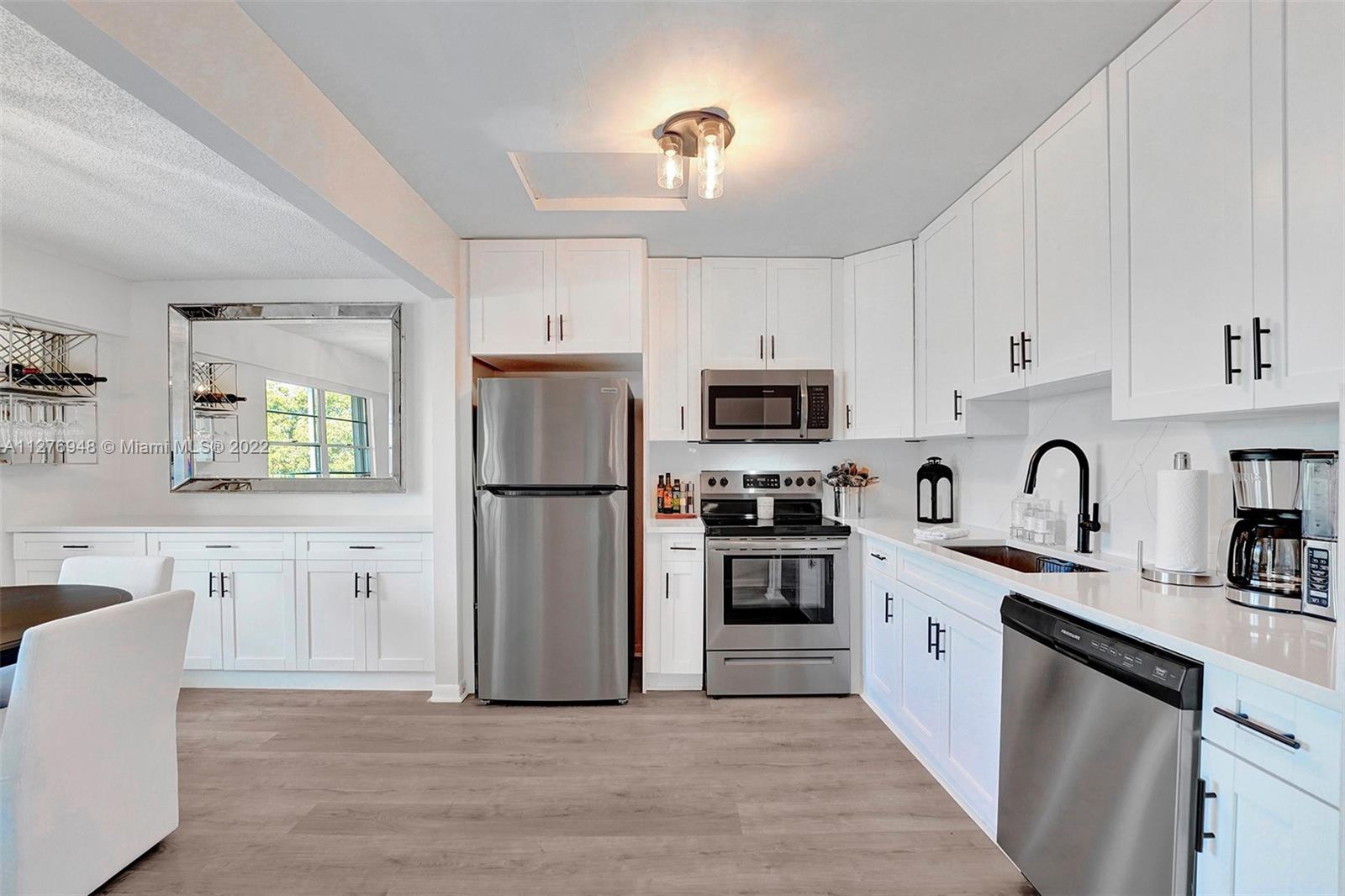 Want to move to Century Village & a new home the DOES NOT require thousands of dollars$$$ in renovations? Completely remodeled from head to toe-unique frontdoor of this property is tucked back in it's own private hallway. Once you enter- your stepping into luxury & serenity. Custom kitchen with dreamy white cabinets and stunning quartz counter. Open floorplan in dining room with custom breakfront for entertaining & extra storage. Immaculate bathroom w/custom tub/shower. The master bedroom is the ultimate retreat that has custom closet to keep you organized. Open floorplan allows you to relax in the living room as you look out over gorgeous golf and lakeview situated among large shade trees. Steps to the laundry room and trash chute- did I mention the elevator for the building is NEW?