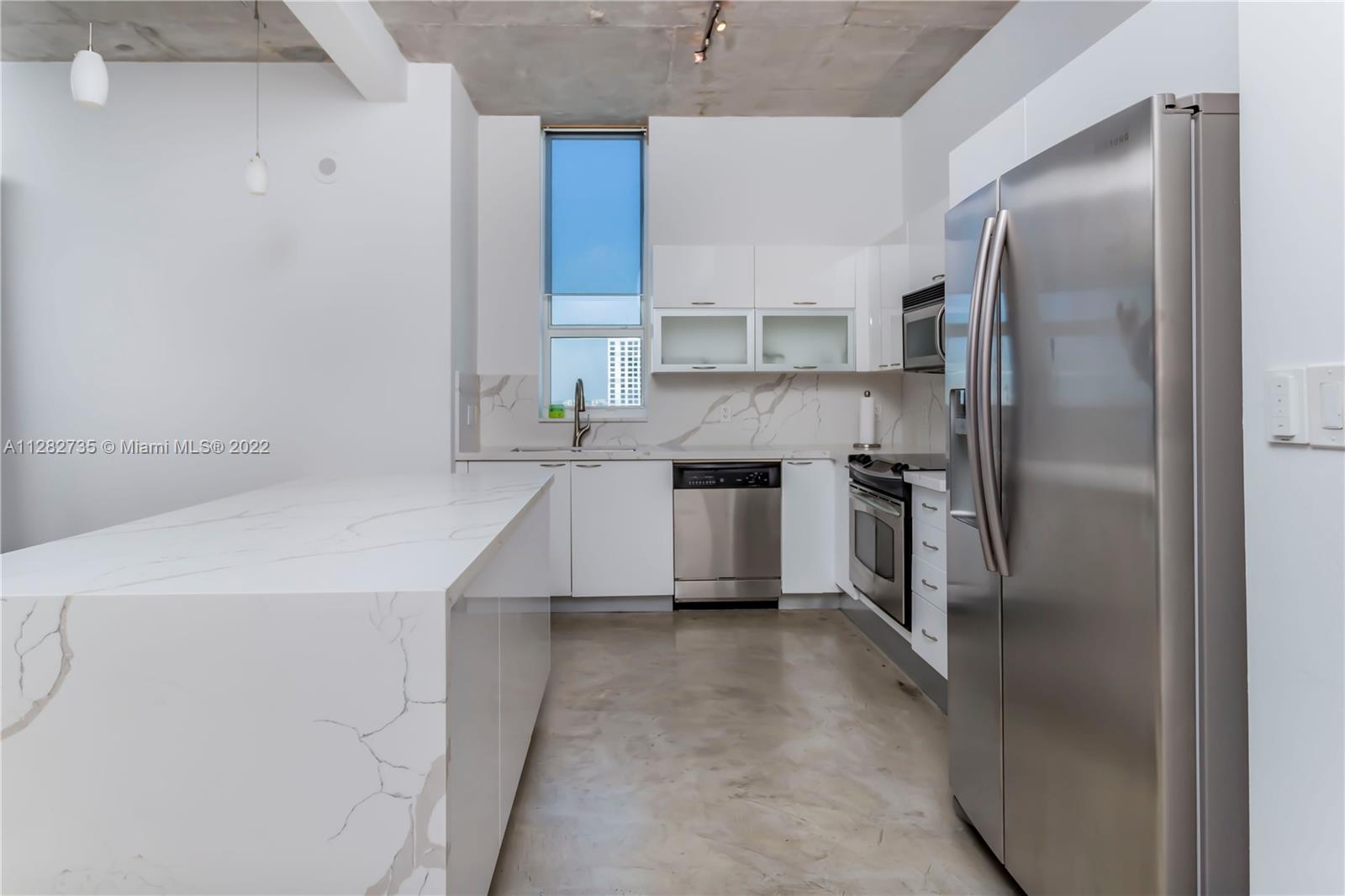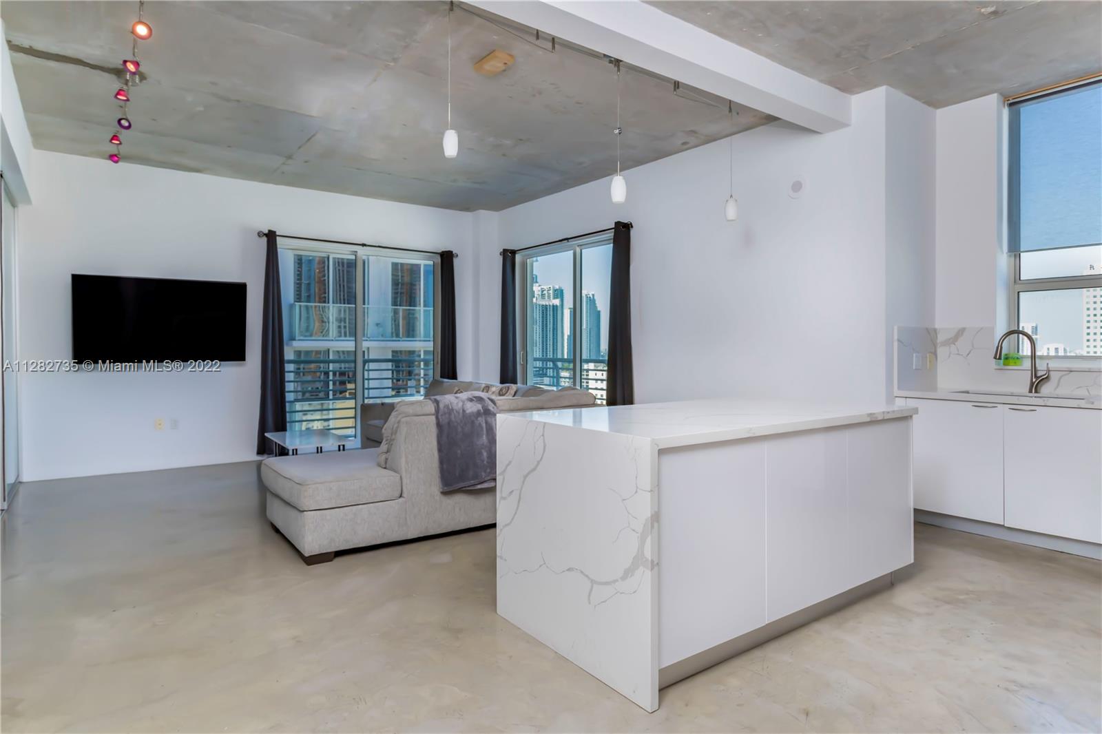 Spacious corner unit on a high floor with vaulted ceilings and wraparound balcony featuring panoramic views of the Miami Skyline. Remodeled with a contemporary design, featuring stained concrete floors, calacatta countertops, and open kitchen with island. Short-Term Rentals permitted (30 day min). Great "Downtown Miami" location, close to Bayside, FTX Arena, and a Design District, Wynwood, and Brickell, and just 10 min to Miami Beach. Enjoy the convenience of being just steps to the Metro Mover. Secure a prime downtown location for a fraction of what new construction is selling for.