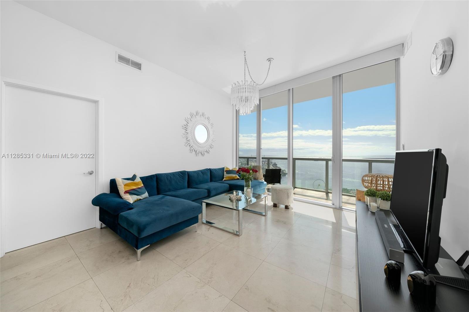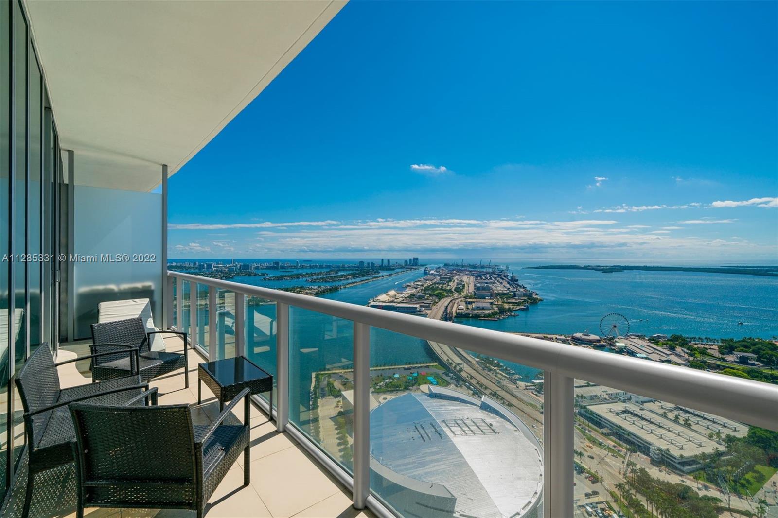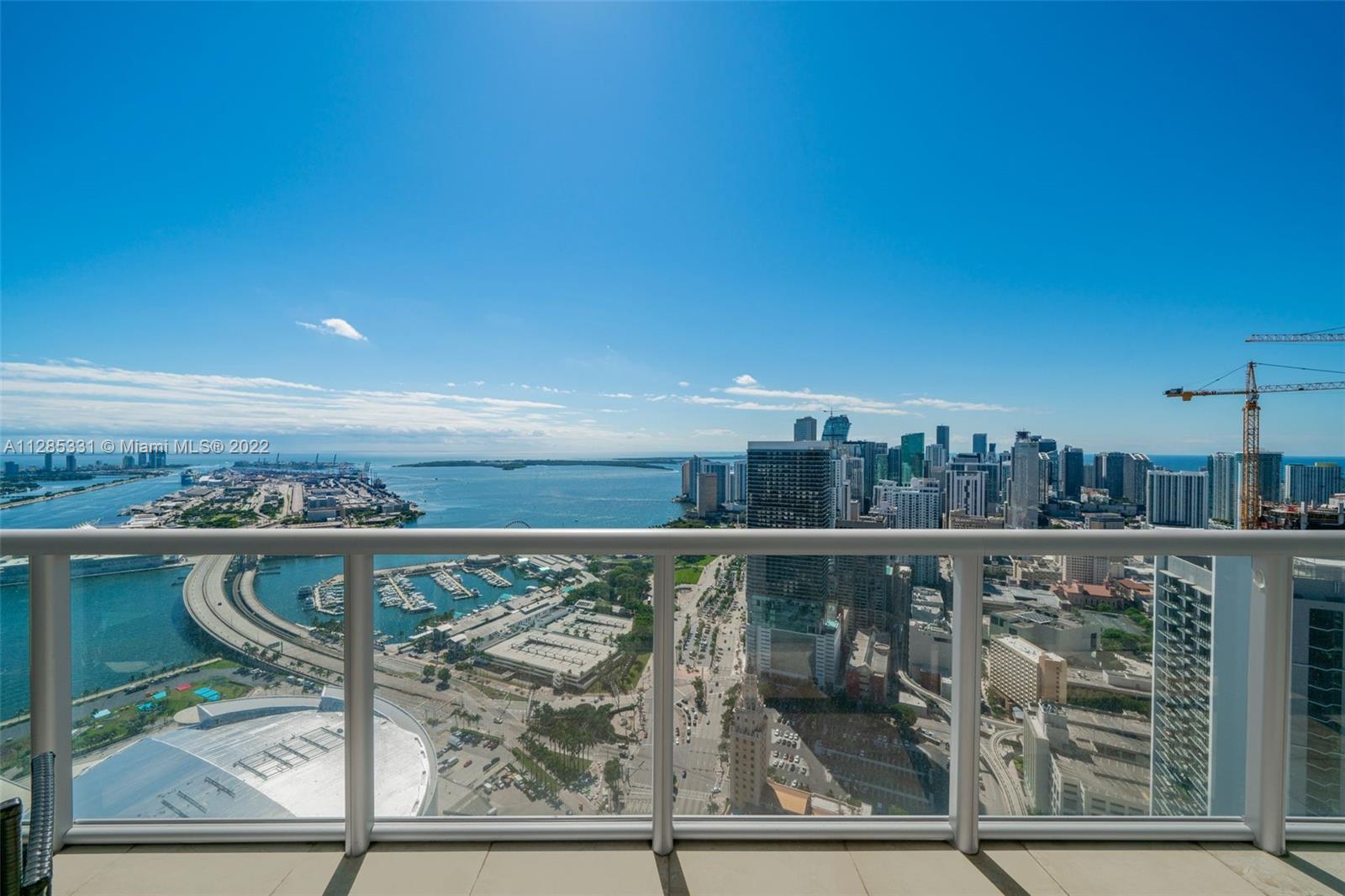 A magnificent, split 2-bedroom residence at MarinaBlue w/ 2.5 baths; marble flooring throughout; motorized shades; large, custom-built closets in both bedrooms; brand new air conditioning unit; stainless steel kitchen appliances; & 10-foot-high ceilings w/ floor-to-ceiling glass windows offering awe-inspiring, panoramic views of the Atlantic Ocean, Biscayne Bay, & Downtown Miami skyline from the 55th floor. Very unique floor plan; only 5 of its kind in the entire building. Both bedrooms have balcony access & direct water views. Includes 1 assigned parking space & 1 assigned storage cage. Building amenities include 2 swimming pools (sunrise & sunset), whirlpool hot tub, fitness center, business center w/ conference room, 24-hour valet parking, sand volleyball court, party room & BBQ grills.