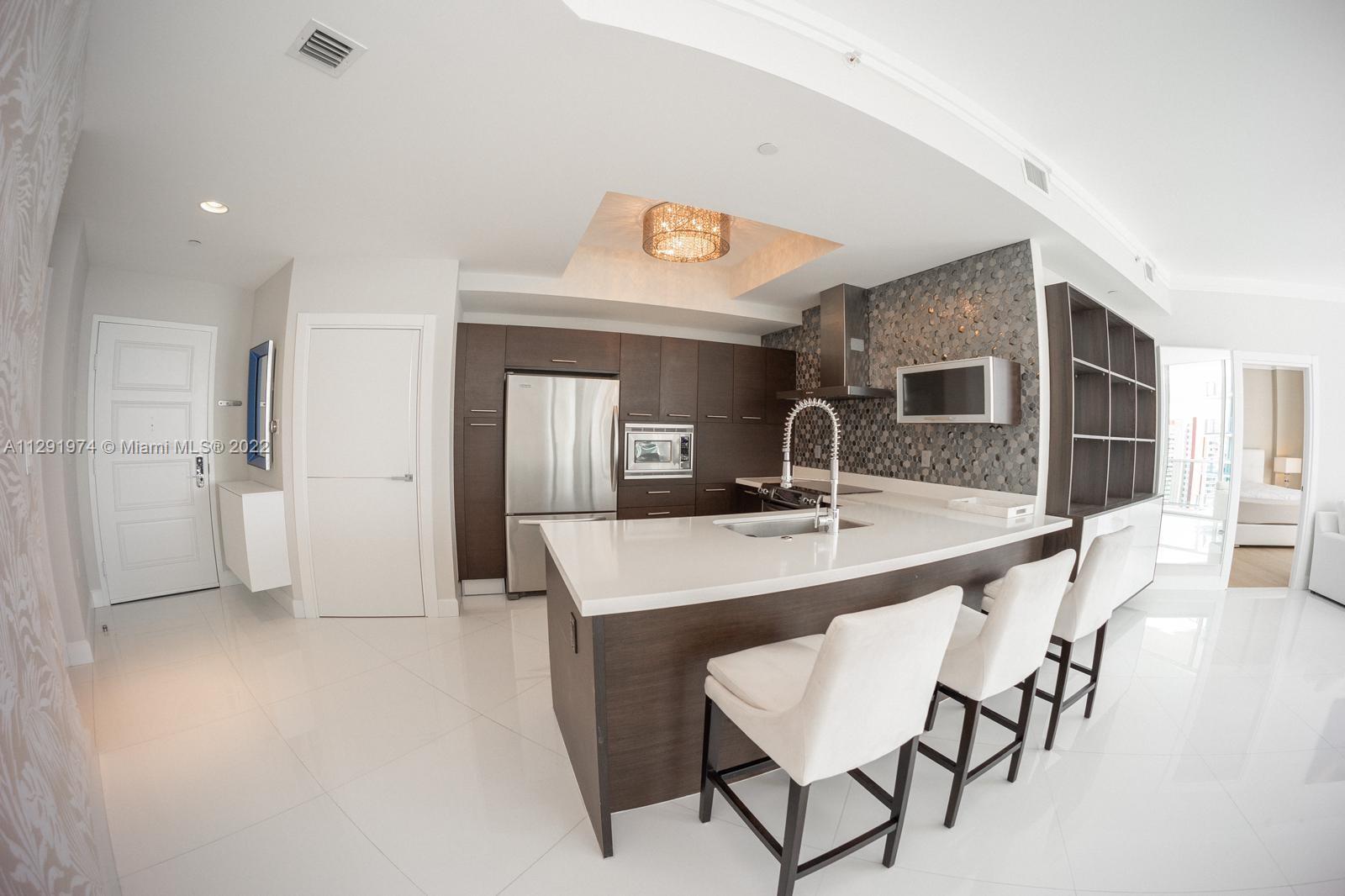 Elegant Tower Suite - 3Bdr/2Bth spacious split floor plan with beautiful views on the highest floor of Tower 3. Professionally decorated and fully furnished. Countless upgrades throughout including custom cabinetry, lighting, flooring, etc. This amazing unit was remodeled in 2021. All new doors and shower doors. Top floor 10F ceilings. Parking: THE UNIT COMES WITH 2 ASSIGNED PARKINGS plus 1 Valet parking. Furniture is negotiable. 5-Star Amenities including complimentary shuttle to and from private Beach Club in Sunny Isles Beach. Great location in Sunny Isles, shops, cafes & restaurants on ground level, That's a MUST SEE!!