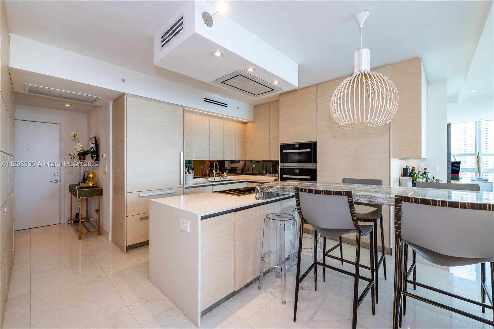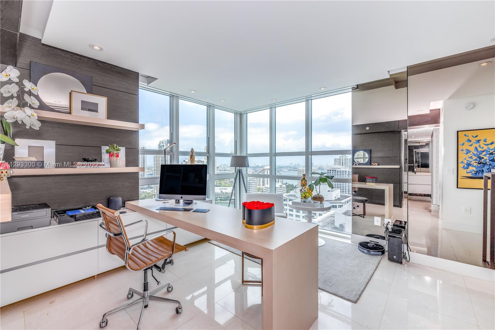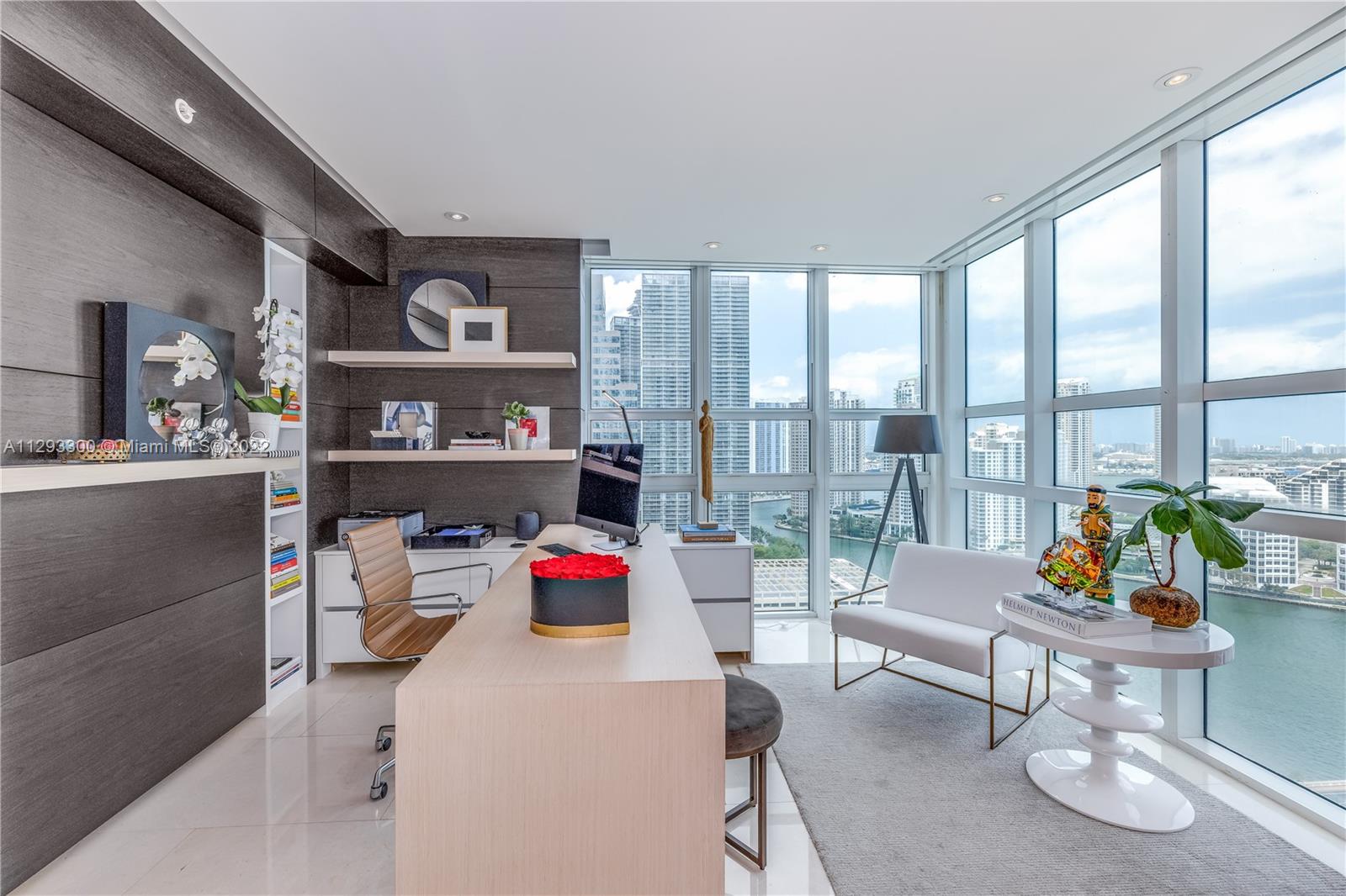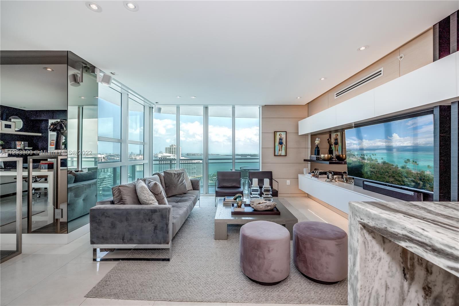 Spectacular panoramic views of Biscayne Bay. Designer remodeled and designer furnished - top-of-the-line appliances, marble floors throughout, European kitchen with built-in dining table, eletric shades & blinds. Second bedroom is used as an office with convenient Murphy bed. Enjoy coffee on your oversize terrace overlooking Key Biscayne, Brickell Key and Miami Beach. Amenties include gym, pool area, theater, party room, office center & valet parking. Centrally located to all Brickell has to offer. Walk everywhere on Brickell. Unit currently rented furnished for $6,500 a month until May 2023. Furniture is negotiable. Please use ShowingTime, text or call listing agent for showings.