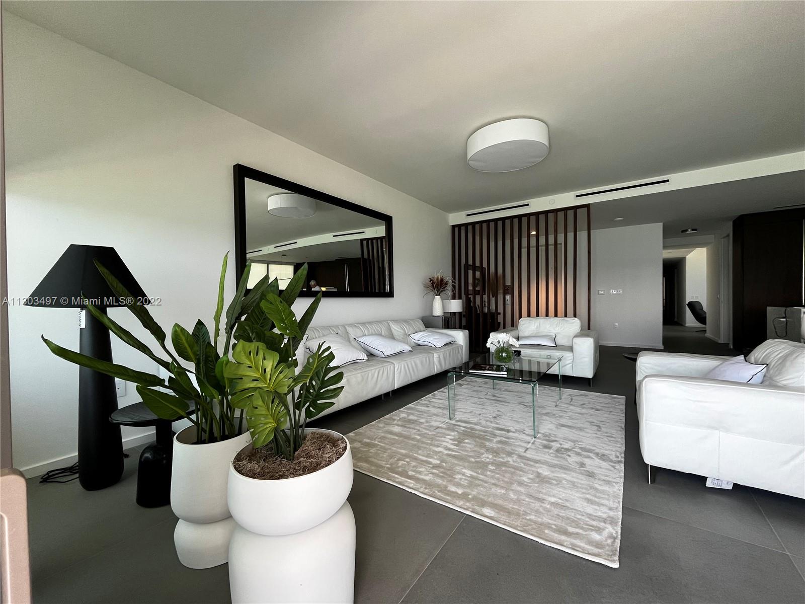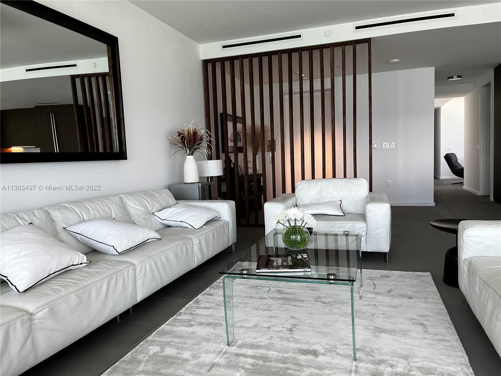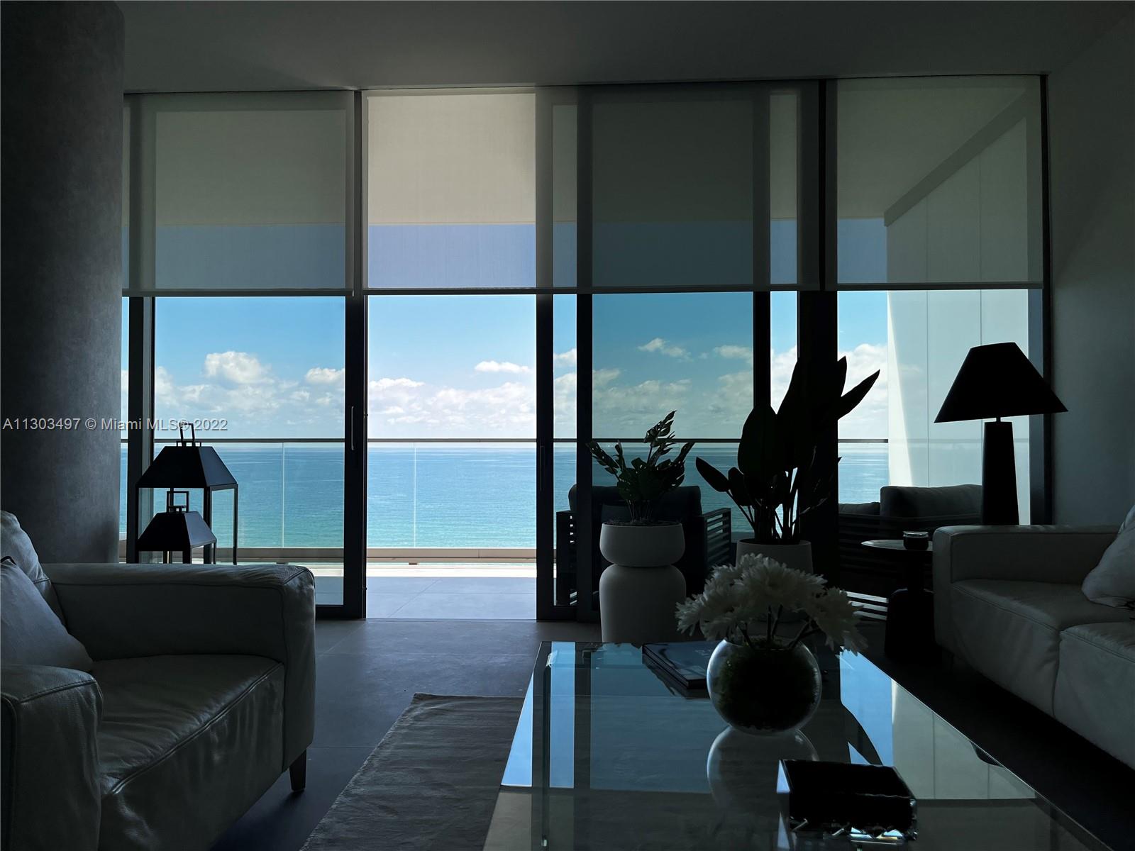 Luxury boutique property just North of Golden Beach. This contemporary 38 story glass tower showcases panoramic views of the Atlantic Ocean, Intracoastal Waterway. This gorgeous north residence includes everything in the unit and window treatments. Piedra Serena finished floor throughout the residence. 10 ft ceilings. Private elevator landings with facial recognition, 24 hr concierge and security. Thoughtfully designed modern residence featuring 3 bedrooms, 3 and half bathrooms, and den. Flow-through corner unit wrapped in glass with both east and west balconies. BOFFI kitchens, MINOTTI stone, and GAGGANAU appliances. Full Service building, amenities include: east and west pools, spa pavilion, sauna and hammam, yoga room, fitness room, event spaces, gardens, and beach services.