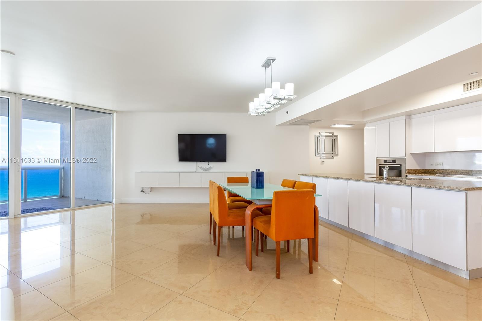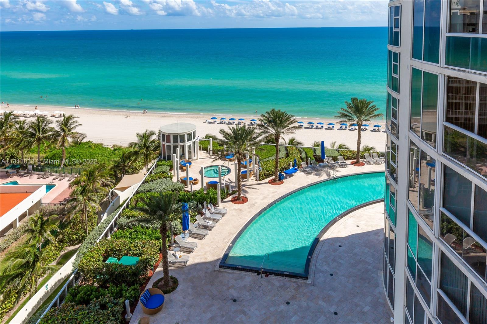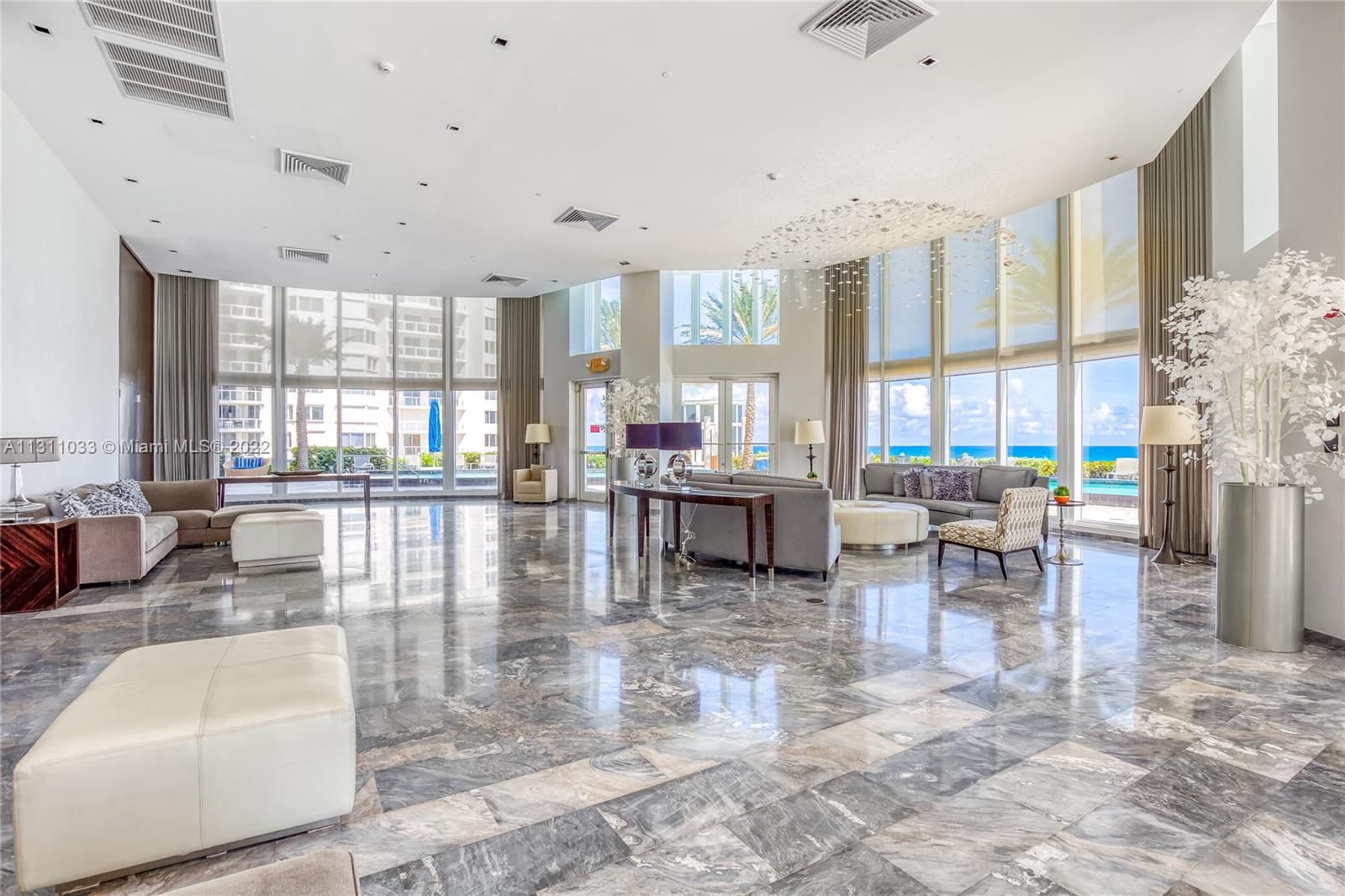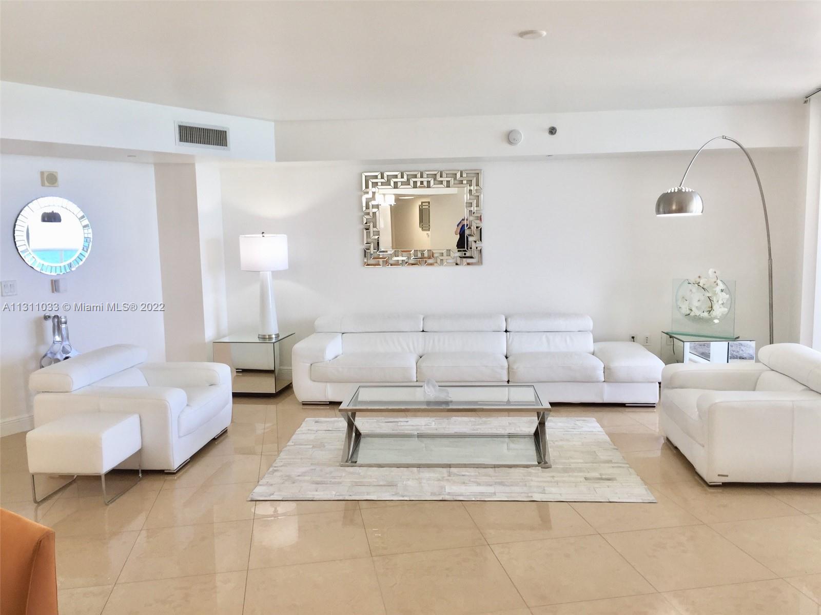 Furnished turn key direct Oceanfront fabulous condo. 3rd room is a den/office with a large walk in closet. Open floor plan- living room, dining room & kitchen over looking the ocean. 2 large balconies (east & west) for sunrises and sunsets. 24" porcelain floors throughout. Kitchen with chef's island, modern cabinetry, Meile & Subzero appliances. Large master suite. Master bath features jetted tub, glass shower & 2 sinks. There are custom lighting fixtures, hurricane impact windows/ doors. 5 star amenities include pool, jacuzzi, gym, cardio room, yoga, steam room, ping pong, restaurant & beach chair service. Prime location on the beach across from a park, playground, & plazas with cafes & shops. Walk to pier. Minutes to Bal Harbor, Aventura Mall, South Beach, airports & more!
