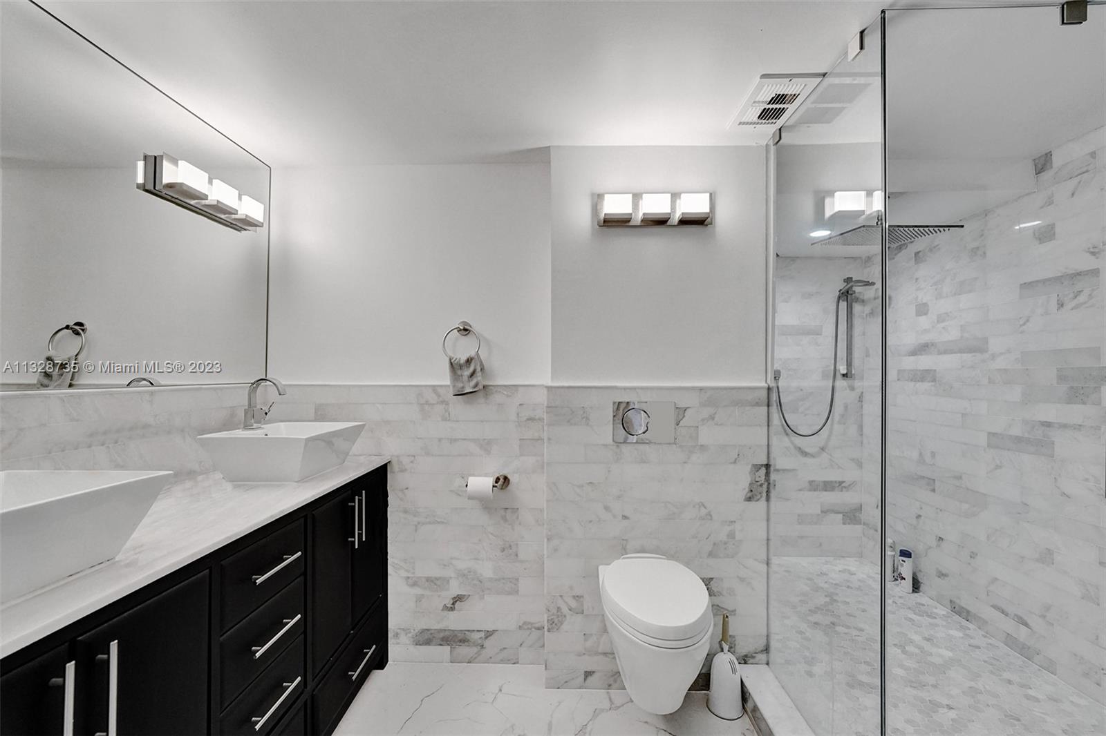Welcome to apartment 5k... Upon entering the home, you are greeted by the spacious dining area, currently configured with a table that comfortably seats six. Adjacent is the chef’s kitchen, outfitted with top-of-the-line Samsung appliances. Move then into the sun-flooded living area that looks out on to your private balcony, which is accessible from both bedrooms as well. The split bedroom layout allows for privacy amongst occupants and guests. The primary suite boasts a spacious walk-in closet with custom shelving, as well as a stunning en-suite marble bathroom with dual sinks and a gorgeous vanity. Marble floors, custom lighting, remote control electric blinds, and brand-new appliances are only some of the magnificent updates this gut renovated home has to offer.