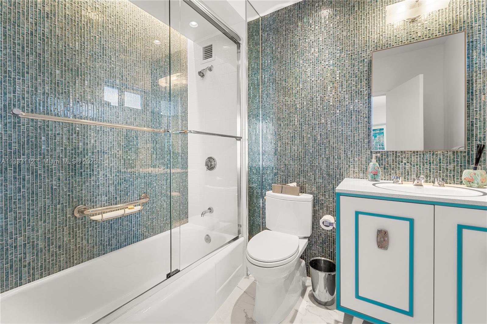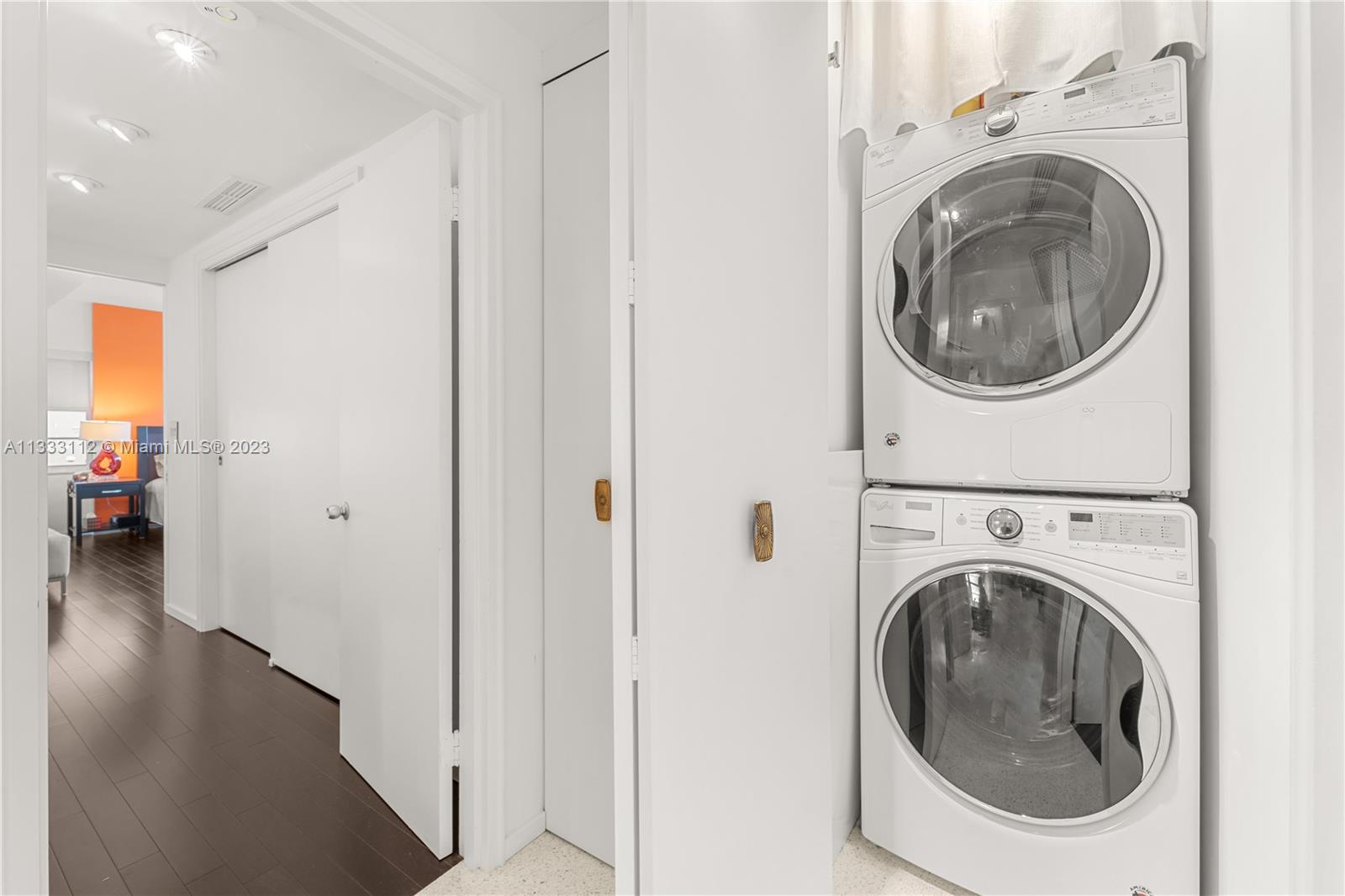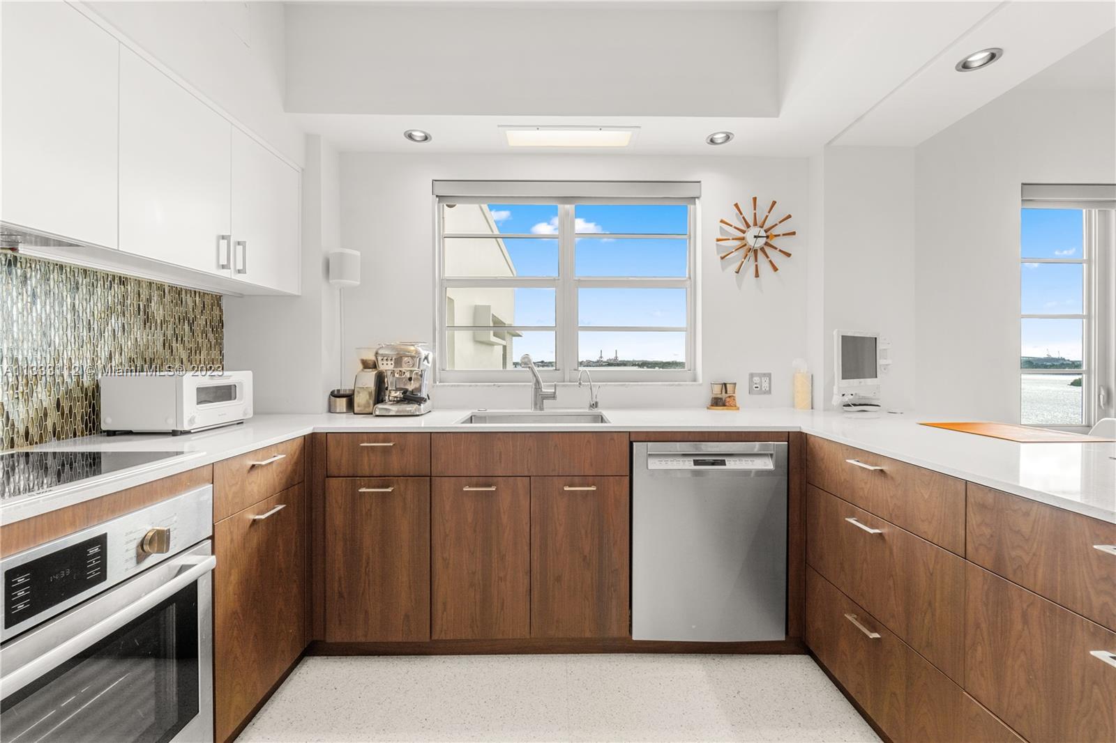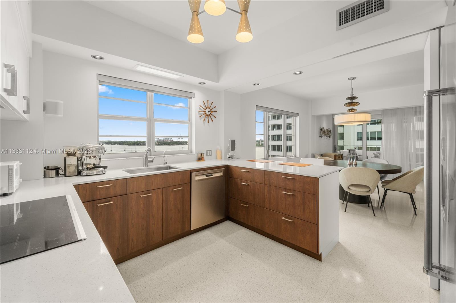 Recently renovated 2 Bed 2.5 Bath with meticulous attention to every detail of the original midcentury modern design of Belle Towers. UNIT IS 1950 SQ/FT. Finishes include terrazzo floors, decorative concrete block, custom walnut cabinetry, roman brick & vintage light fixtures throughout. The design is seamlessly blended with modern conveniences such as induction cooktop, quartz countertops, full size washer/dryer, 60" TV with Sonos sound bar, impact windows & power window shades. Generous storage includes walk-in closets in both bedrooms, kitchen pantry and an internal storage room large enough to accommodate bicycles. Enjoy views of Biscayne Bay from every room and your private terrace great for entertaining. Convenient location walkable to Miami Beach shopping and dining.