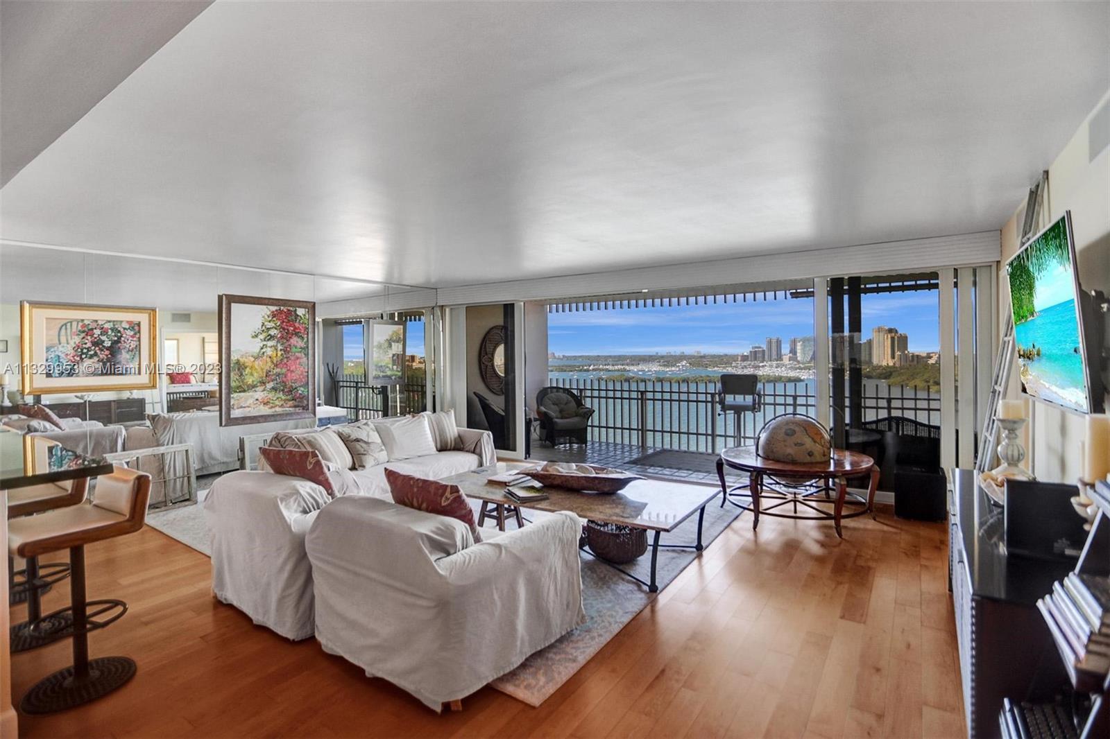 Beautifully updated, move-in ready! This high-floor Grove Isle residence offers incredible Unobstructed south views of the open bay, Dinner Key marina, and downtown Coconut Grove Skyline from every room. The open kitchen has wood cabinetry, stainless steel appliances, and black granite countertops. The spacious balcony is accessed from the living room and guest bedroom. The primary suite has a large custom built-in closet with island dresser and an en-suite bathroom with double sinks, and shower. Other features include impact windows and sliding doors throughout and a built-in dry bar with a mini wine refrigerator. Be one of the first to get in to see this amazing residence. Grove Isle is a 20-acre guard-gated island in Coconut Grove offering full services and resort-style amenities.