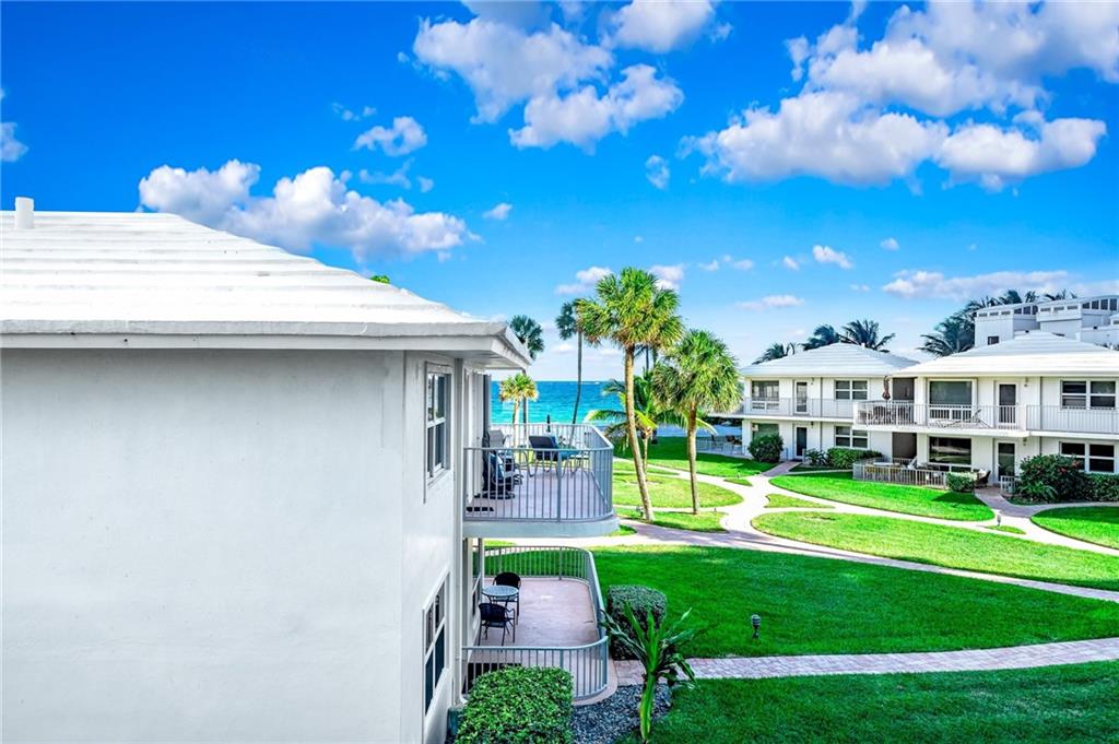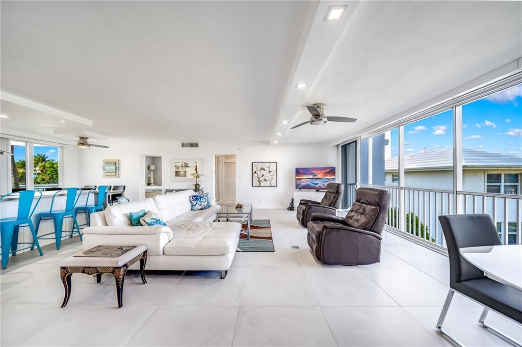 Paradise Perfected. This 2 bedroom, each with an ensuite bathroom and walk-in closet, features an open living area with amazing direct views of the ocean! This unit was renovated in 2022 and includes rectified 32" floor tiles throughout, new kitchen cabinets & quartz countertops as well as a designated bar area with wine rack. The a/c was replaced in 2022 as well as the electrical panel, tankless water heater, and new shut-off water valves. The fridge, stove, dishwasher and exhaust are all 2 years old. The unique vintage mid-century restored bathrooms add to the overall quality comfort of this spacious and bright end unit. Impact windows and doors throughout as well as remote controlled blinds reveal a full-wall of sliding glass doors to enjoy your morning coffee with stunning ocean views.
