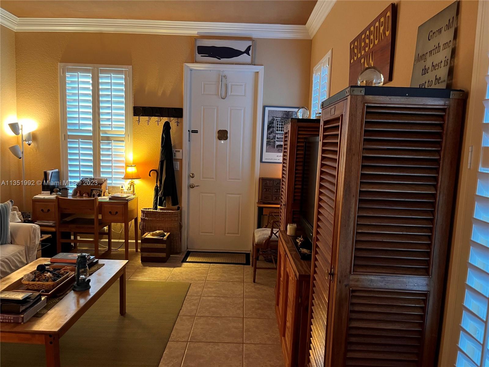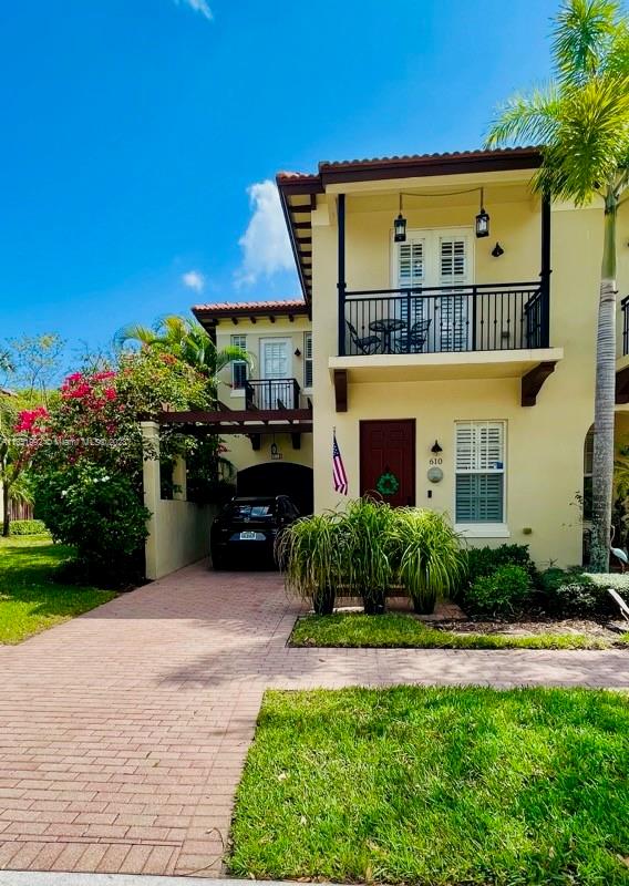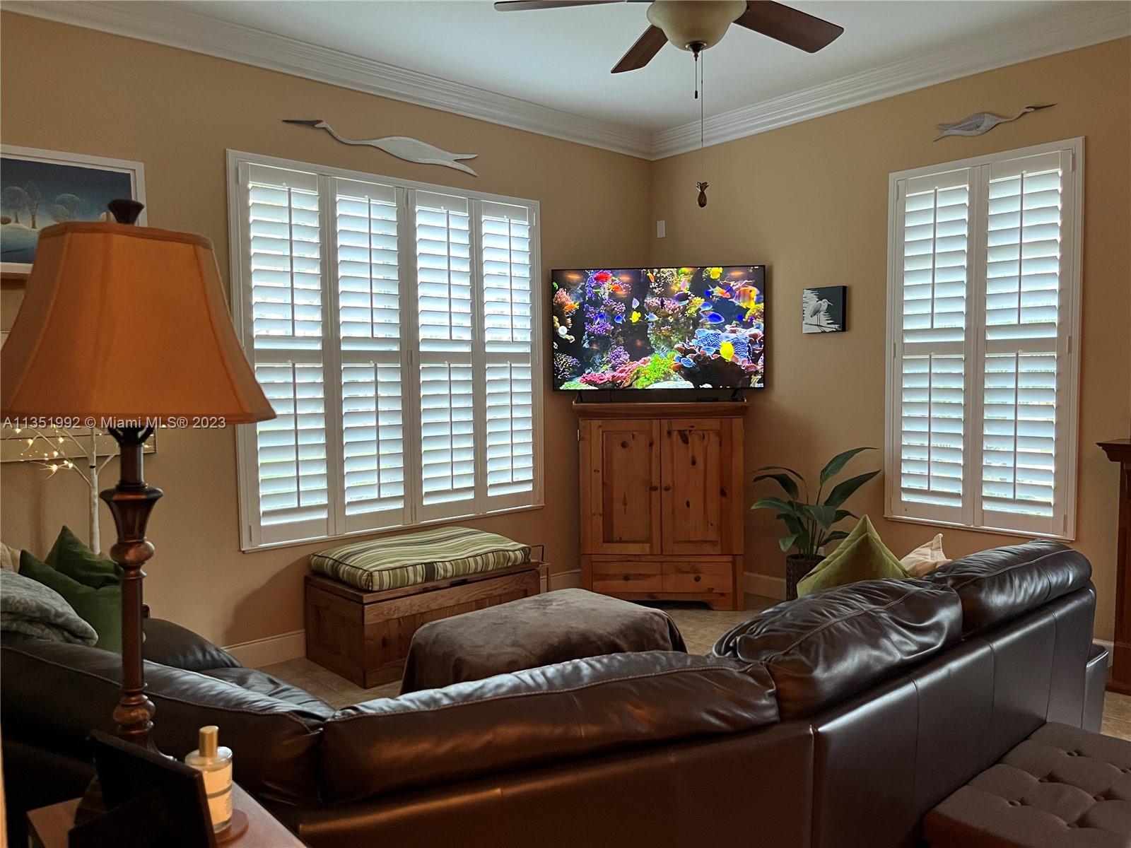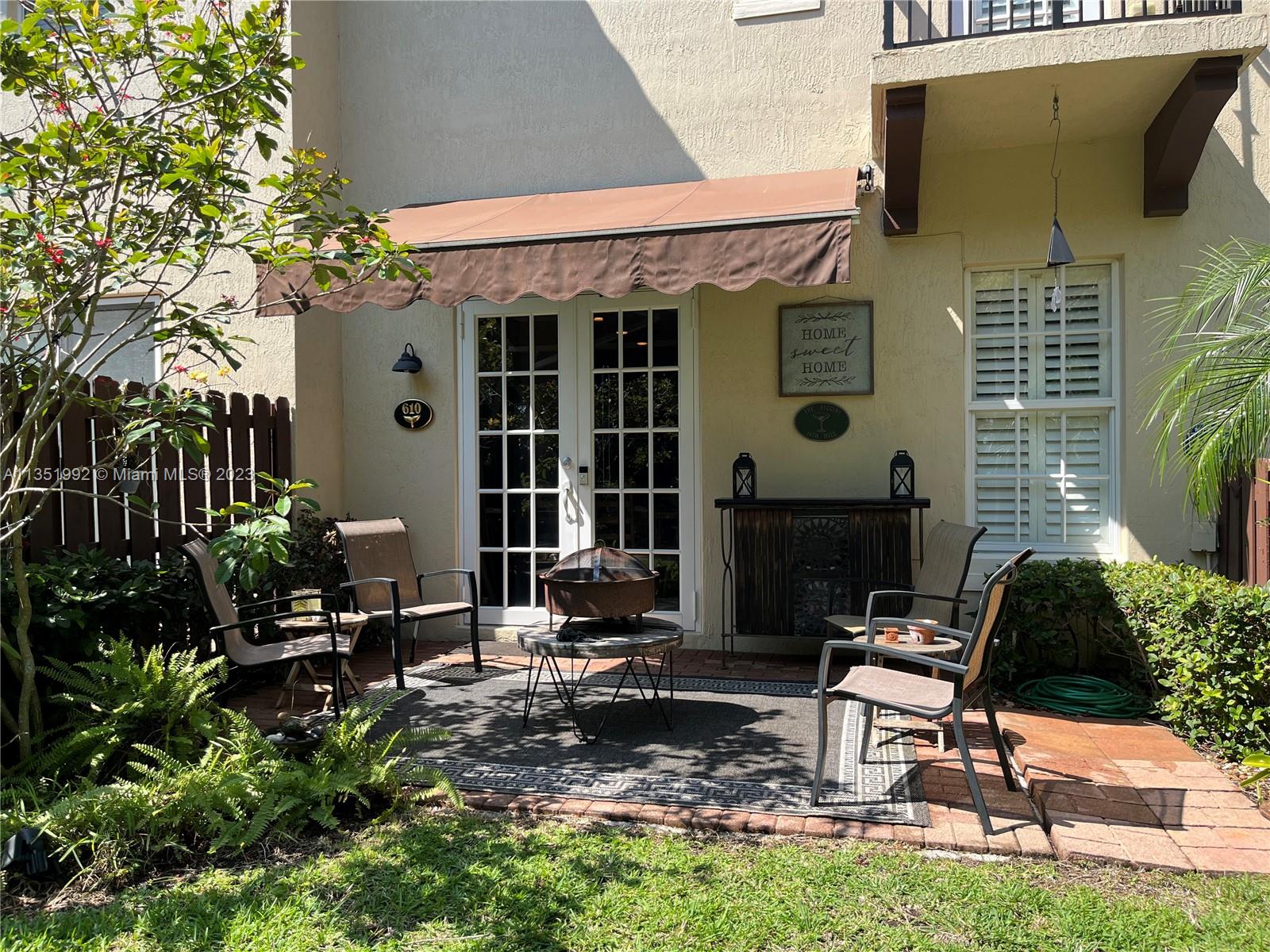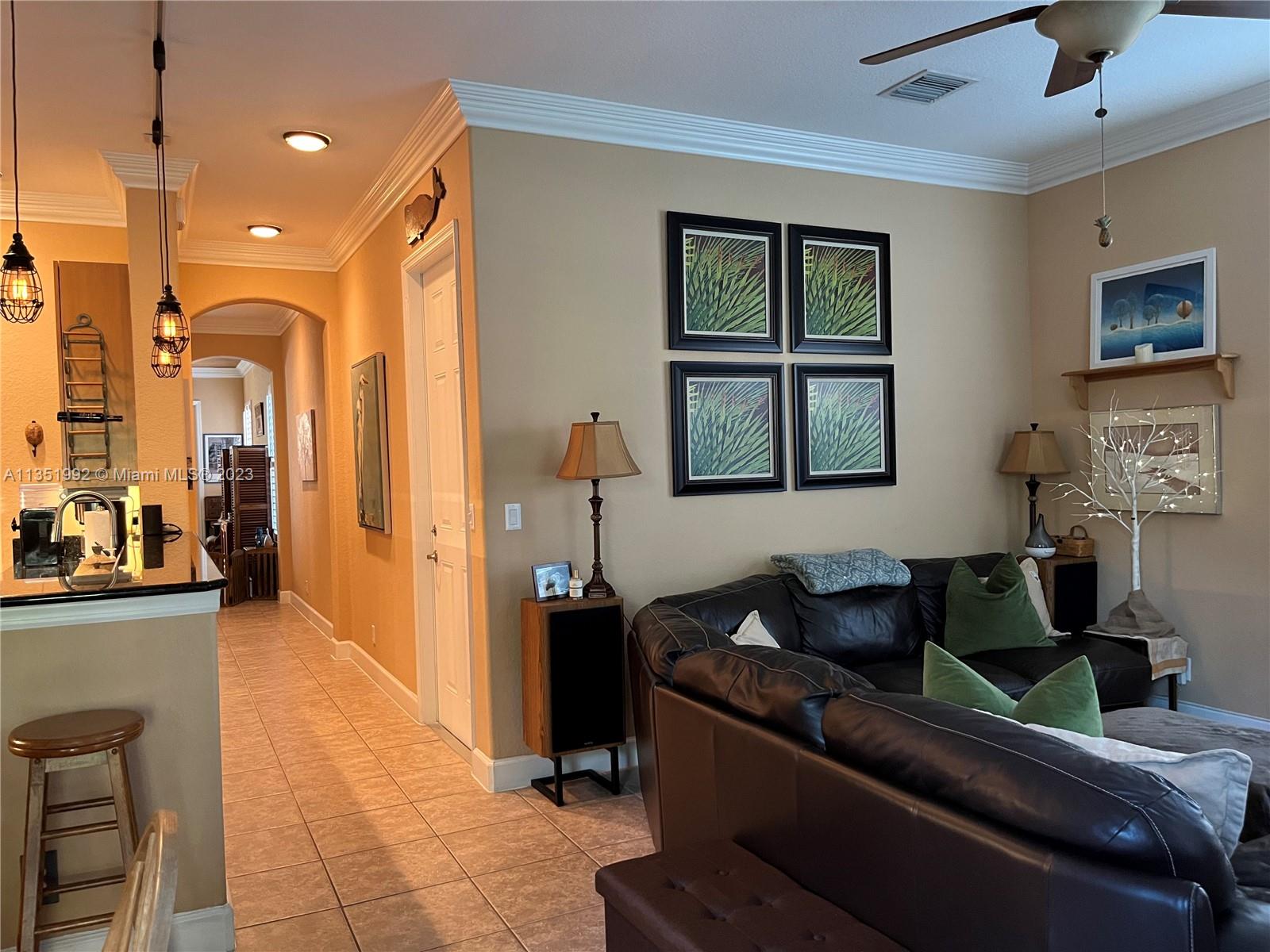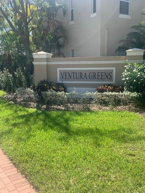 Welcome home to this stunning end-unit townhouse in the gated community of Ventura Greens. This home features plantation shutters throughout, crown molding, french doors to the patio, balconies off all three bedrooms, and dimmable lighting downstairs. The downstairs boasts ceramic tile floors, an open concept kitchen with soft closing drawers, and a gel flame fireplace. The primary bedroom has his and hers walk-in closets, a soaking tub, and a separate shower. Enjoy the new stove (2022) and microwave (2021), A/C from 2016, brand new water heater (2022), and Berber carpet upstairs. Relax outside in the Florida breeze with a retractable awning over the patio with a beautiful garden view and the Emerald dunes 6th fairway right behind. Prime location just minutes from shopping and dining!!