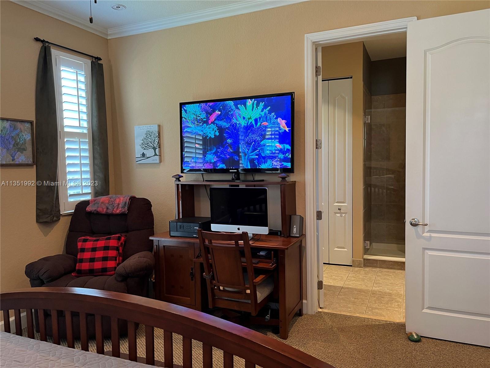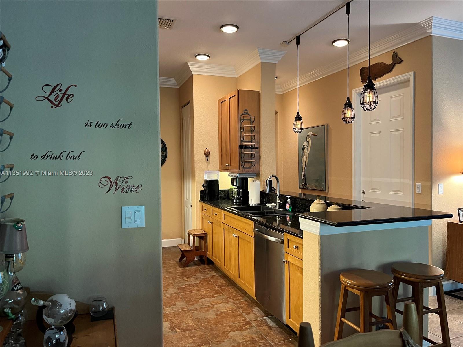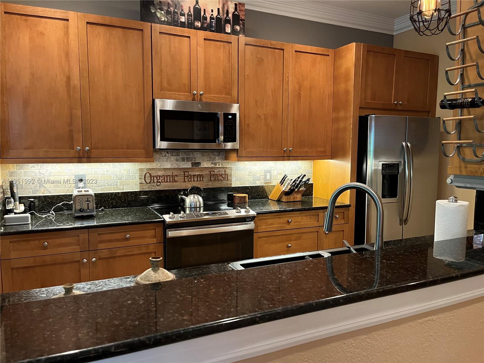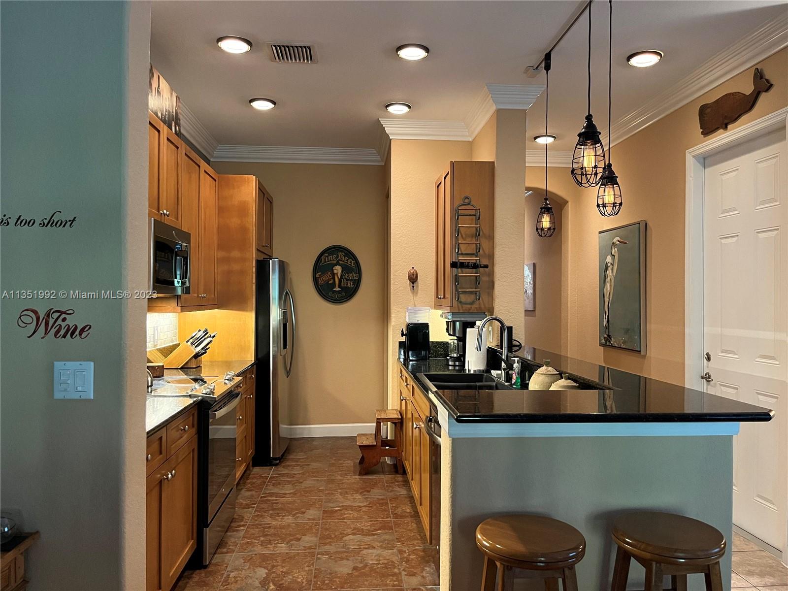 Welcome home to this stunning end-unit townhouse in the gated community of Ventura Greens. This home features plantation shutters throughout, crown molding, french doors to the patio, balconies off all three bedrooms, and dimmable lighting downstairs. The downstairs boasts ceramic tile floors, an open concept kitchen with soft closing drawers, and a gel flame fireplace. The primary bedroom has his and hers walk-in closets, a soaking tub, and a separate shower. Enjoy the new stove (2022) and microwave (2021), A/C from 2016, brand new water heater (2022), and Berber carpet upstairs. Relax outside in the Florida breeze with a retractable awning over the patio with a beautiful garden view and the Emerald dunes 6th fairway right behind. Prime location just minutes from shopping and dining!!
