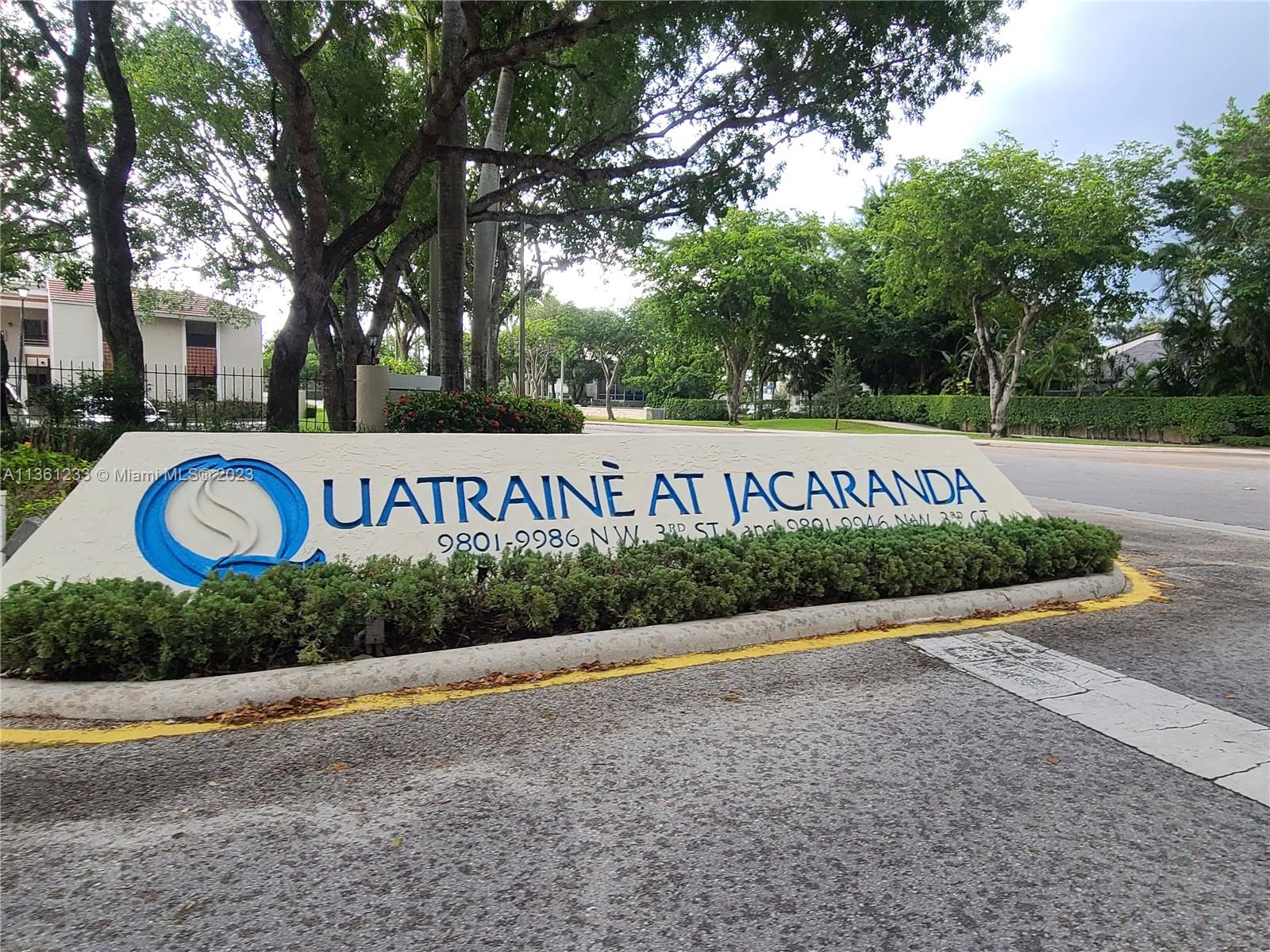 Beautiful corner unit located in the quiet community of Quatraine at Jacaranda. Enjoy sunsets from your screened-in terrace or naturally lit living room. Bamboo Wood flooring throughout all the living areas in a split bedroom floor plan. Plenty of closet and attic space. Screened-in terrace is spacious and has a storage closet plus a washer/dryer. Kitchen has been retiled, new electrical panel just installed, A/C replaced 2 years ago, and a new roof installed 3 years ago. One assigned parking space and plenty of guest parking. The Community has 2 pools, a hot tub, and a child play area. It’s Close to multiple major shopping malls, schools, and highways. Click "Virtual Tour" above for an HD video tour. Please use Showing Time for showing instructions.