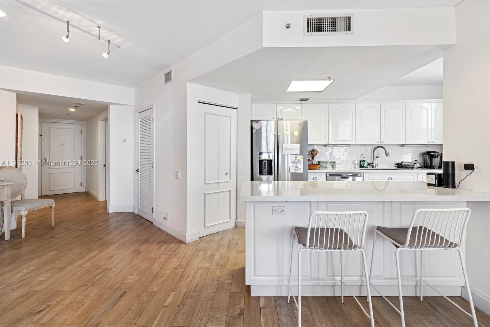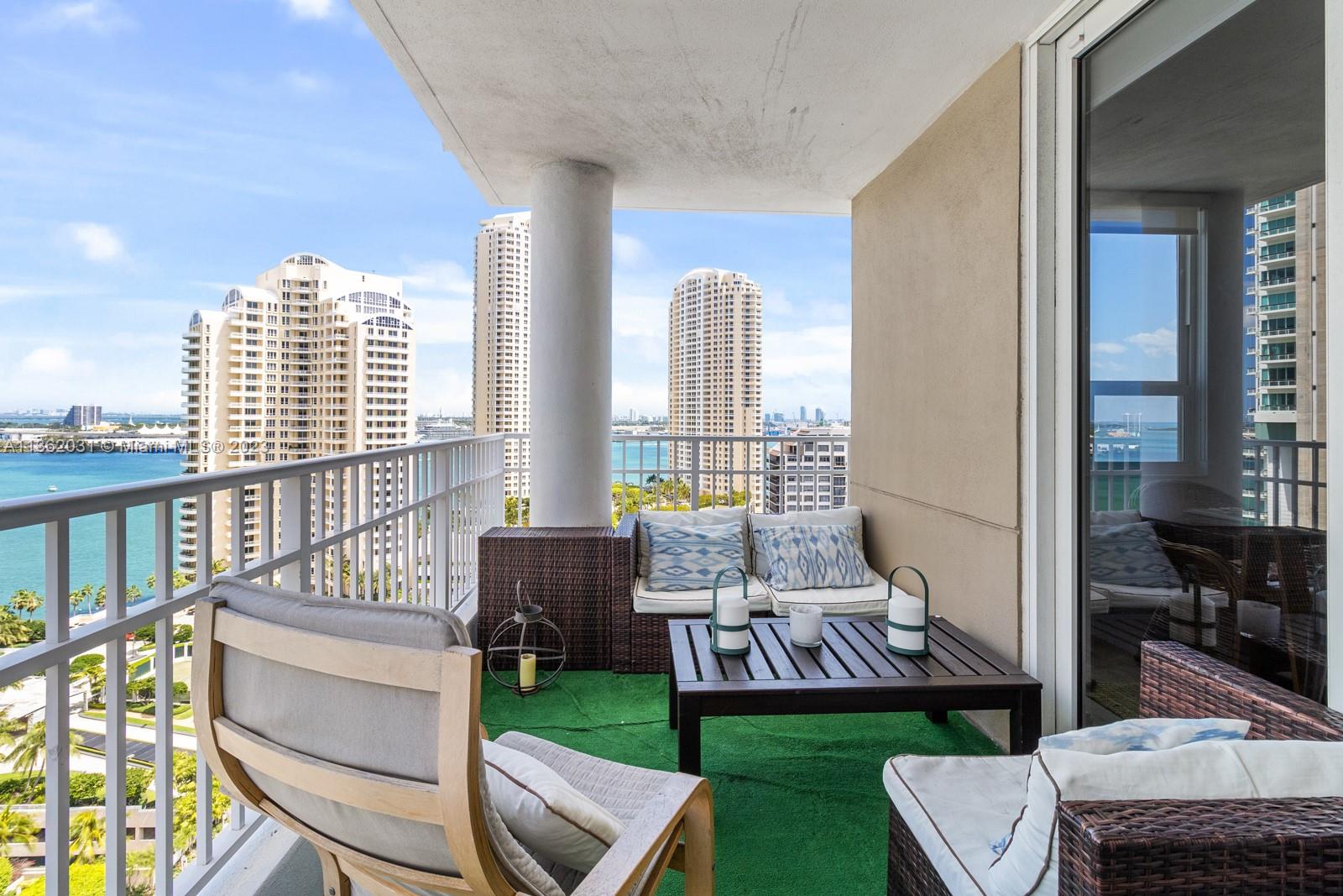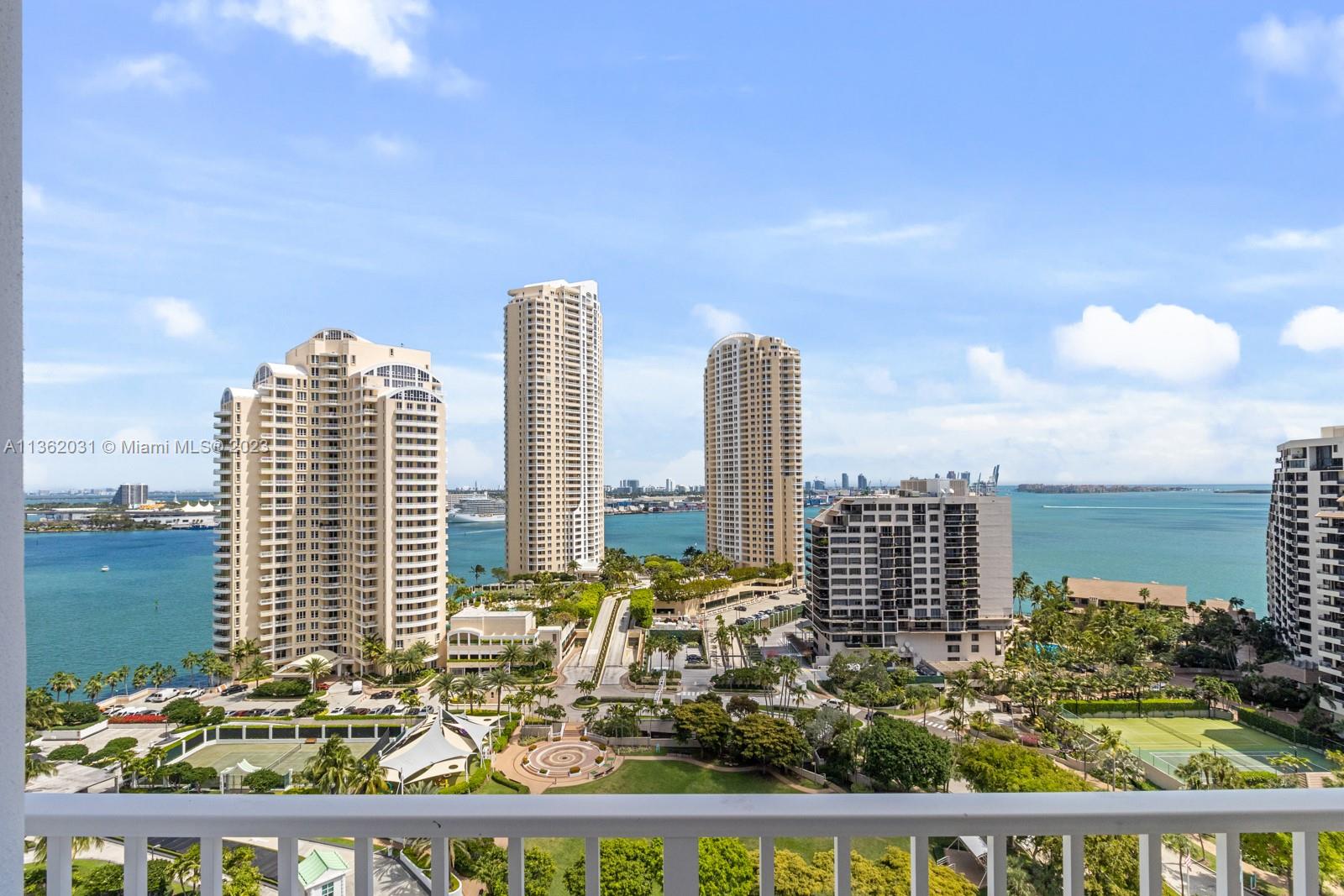 Completely upgraded corner unit in the heart of Brickell Key with beautiful city and bay views at exclusive Courvoisier Courts building. The unit features 2 fully renovated bedrooms and 2.5 bathrooms with an updated and beautiful kitchen with quartz countertops and elegant mosaic backsplash, porcelain floors throughout and an outstanding open balcony. Amenities include: pool, renovated energy, spa, racquetball courts, 24 hours security, valet and billiard room. Walking distance to all Island amenities like running track, mini supermarket, beauty salon, restaurants, 2 parks, picnic area, and much more!