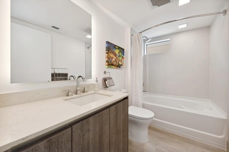 This exquisite 3 bed 3 bath unit boasts a stunning contemporary design with a spacious 390 SqFt terrace that lets you soak in the gorgeous sunsets. Enjoy the convenience of living only a block and a half away from Atlantic Ave in a prime location. The unit features a range of upgrades such as Restoration Hardware light fixtures, remotely controlled lights and August-lock, and automated shades with shade pockets on all windows. You'll also find detailed custom closets, a full-size washer, and an exterior-vented dryer.Experience the best of luxury living with 2 covered parking spots that come with EV charging stations and 2 storage units. Enjoy the amenities that the 111 First Delray condominium building has to offer,