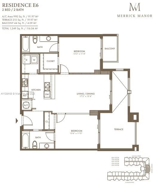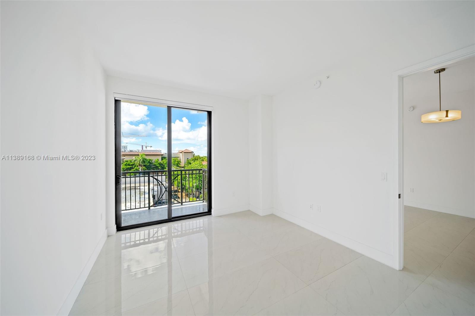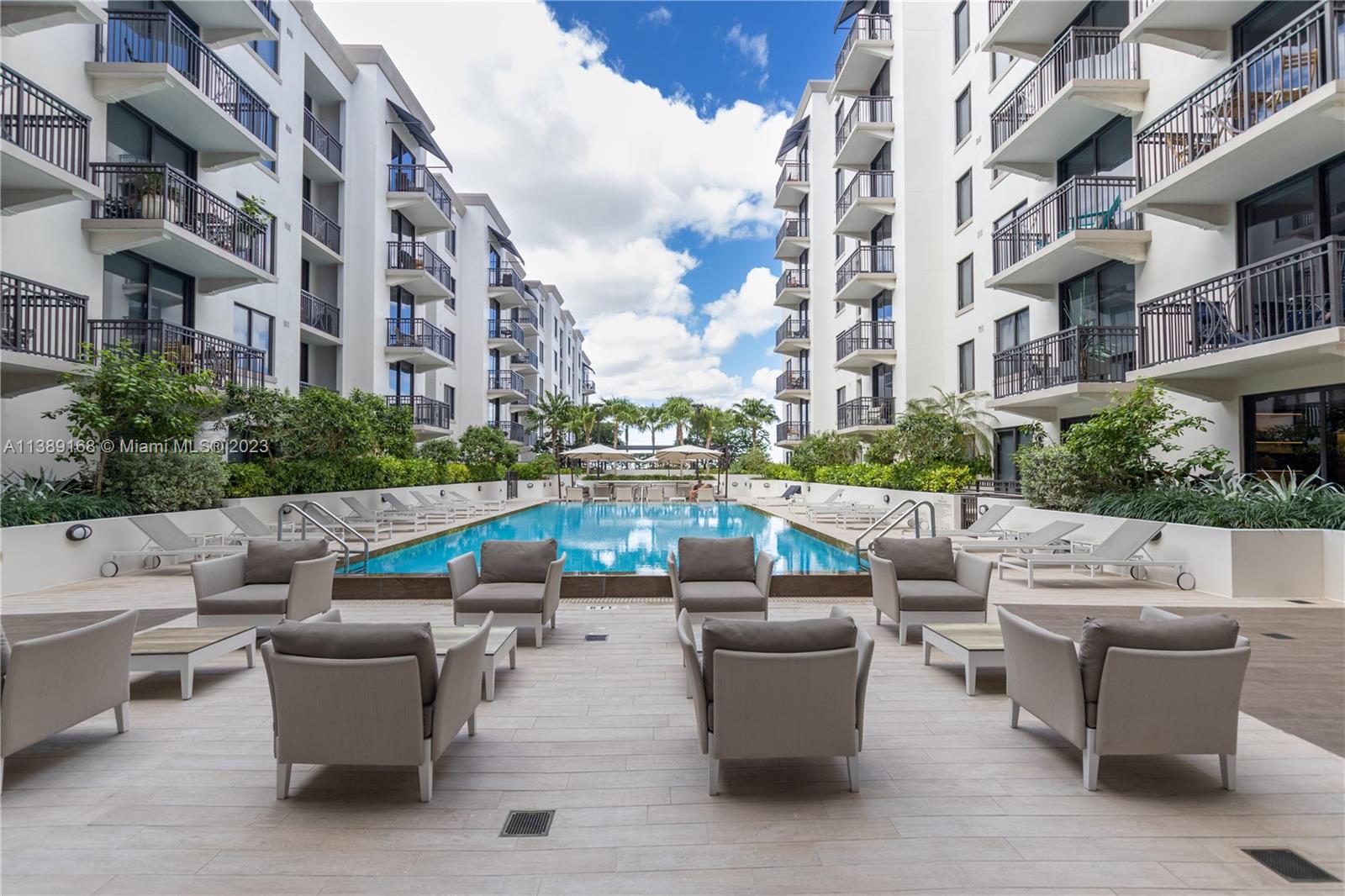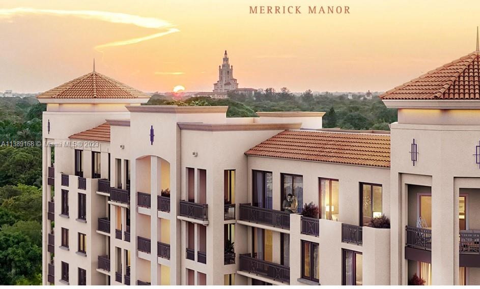 2 bd 2 bath w Extra Large private terrace at luxury, full-service Merrick Manor. Approx 906 SF unit, covered Terrace +200 SF adds another room to unit. Extra high ceilings 10 ft. 2019 construction. Impact windows. Built-in Bosch SS appliances, white quartz counters. 24 hr concierge/security. Gorgeous amenities include: outdoor pool, summer kitchen and al fresco dining, top of the line gym. 1 assigned parking. EV charging in garage. Easy to rent, condo allows 6 month rentals. In the heart of Coral Gables, close to world class shopping, dining and business district.