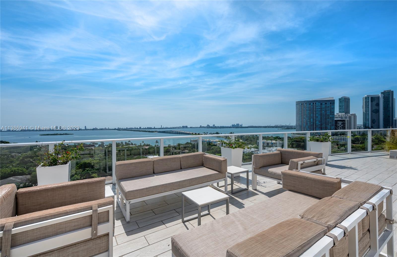 Penthouse unit features 2 bedrooms and 2 bathrooms, stunning water views. The living and dining areas are spacious and filled with natural light, and the open kitchen is equipped with high-end St. S. appliances. The bedrooms are fitted with solar screens and blackout shades. Located conveniently within walking distance from the Design District's shops and eateries. The building is equipped with impact glass throughout and offers top-of-the-line amenities, including a state-of-the-art pool and gym, as well as a rooftop barbecue area and summer kitchen. Easy to schedule a showing.