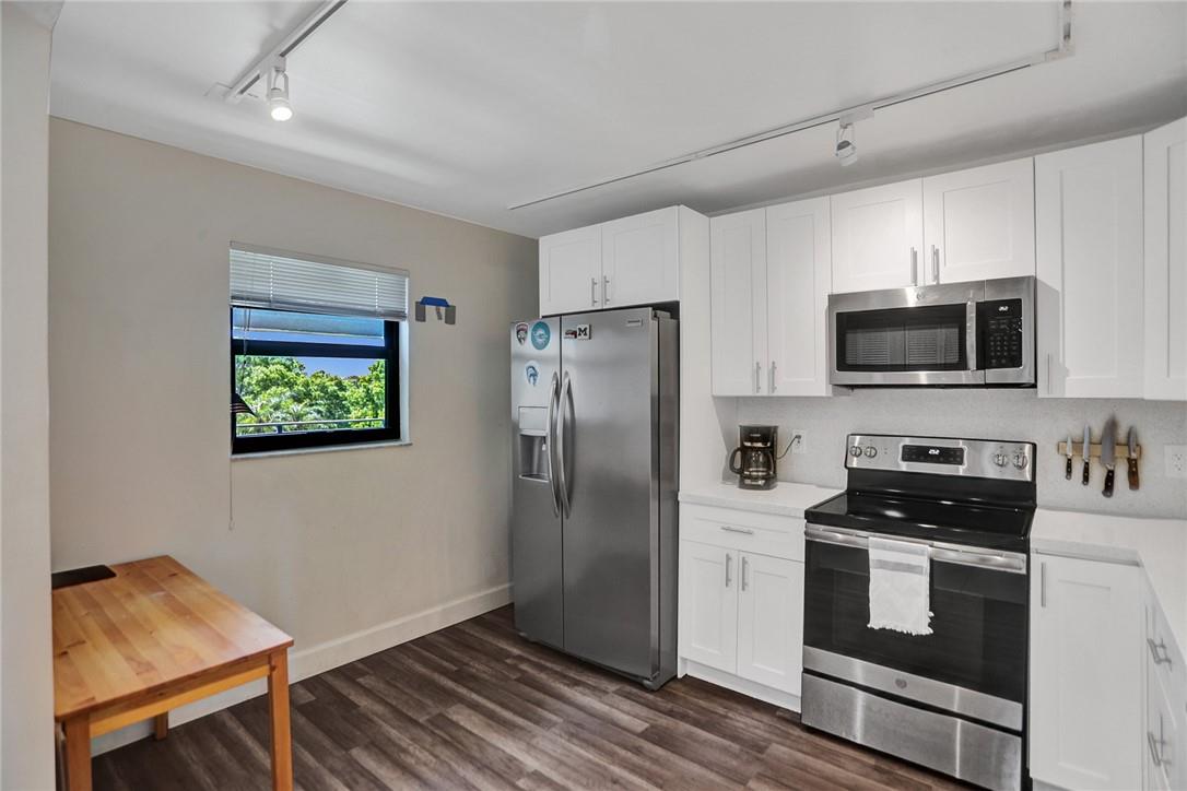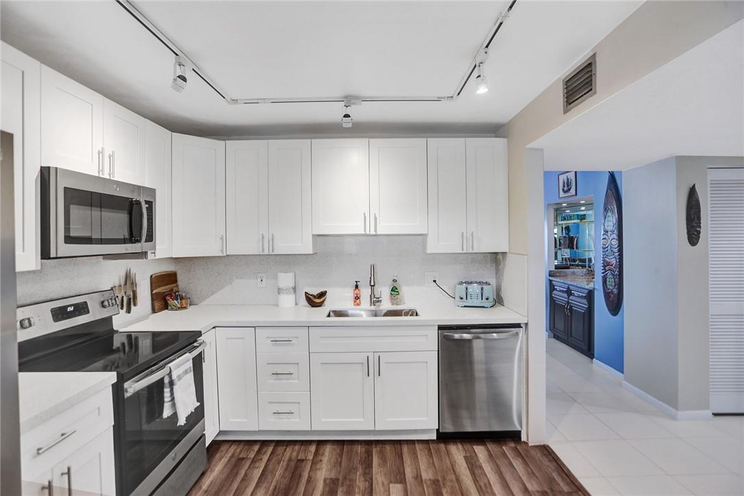This 2 bed/2 bath renovated condo is in a prime location. Brand New roof and hurricane impact glass windows & doors. The kitchen is equipped with stainless steel appliances, granite countertops, and ample storage space. You'll be greeted by an expansive living area with sliding glass doors to a balcony overlooking the golf course with a water view. This unit has another section for entertaining, complete with cabinets, countertop space, a wet bar & sink. The primary bedroom is spacious and the bathroom has dual sinks as well as a spacious shower & tub. This unit comes with a host of amenities: clubhouse, 2 pools, bowling alley, tennis, racquet ball & pickleball. Assoc. requires 700 credit score. Included - cable, water and basic internet. First year no rentals.