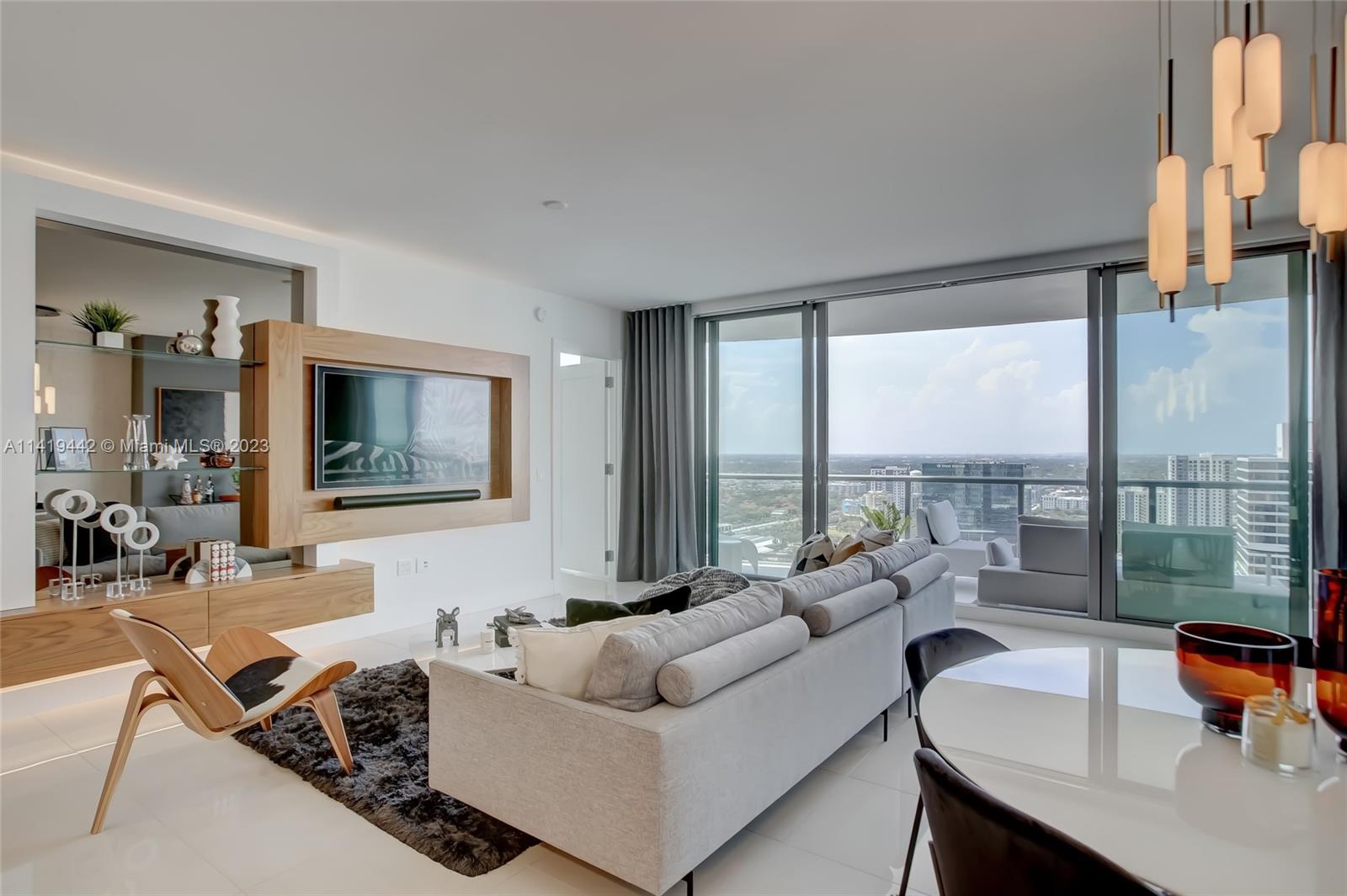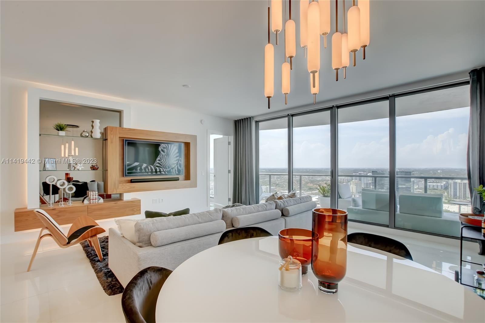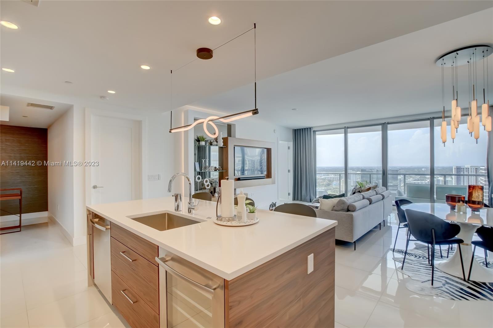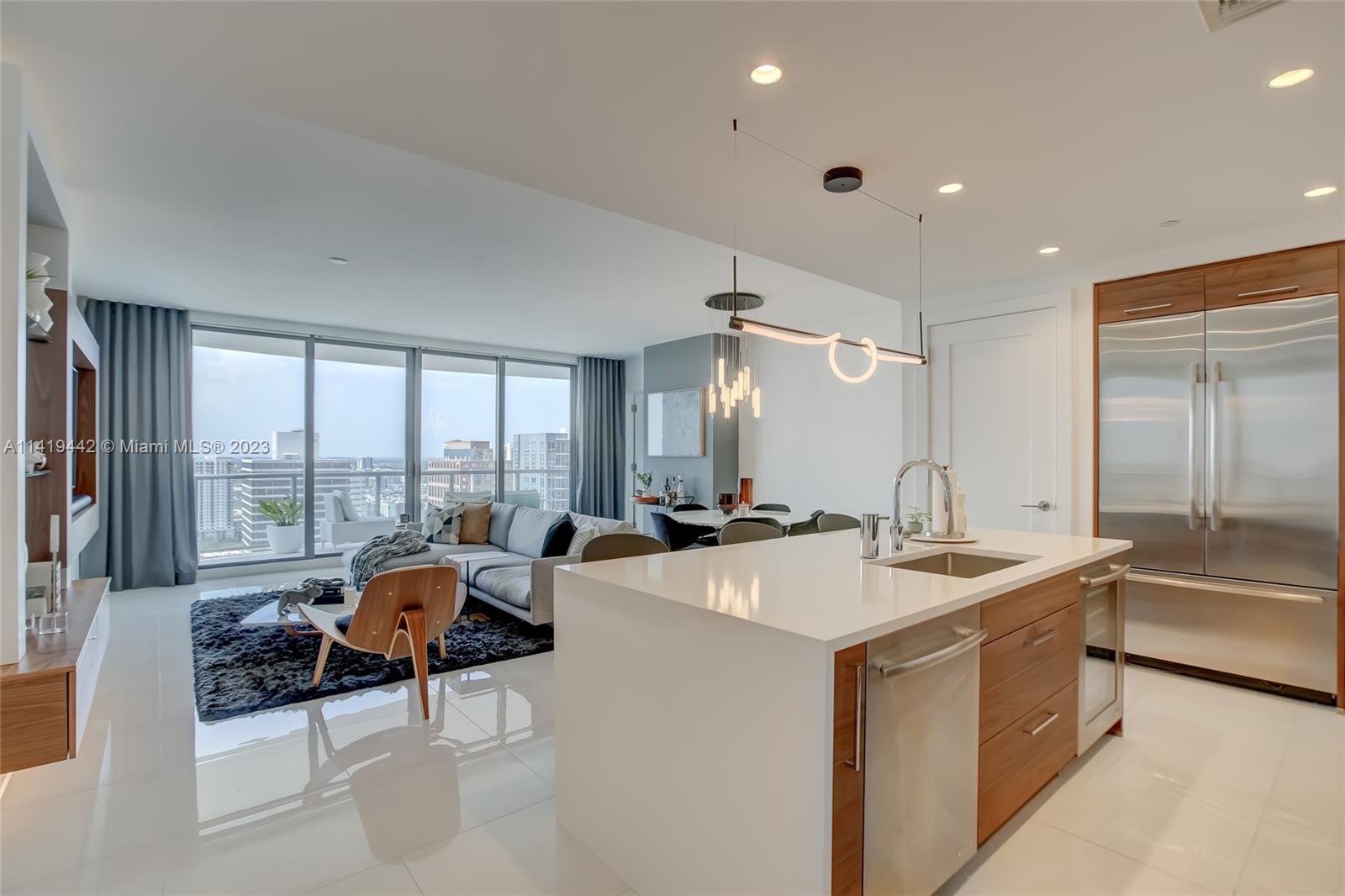 Absolute best downtown address! Breathtaking views featuring floor-to-ceiling windows. Unit features 2bd/2.5 baths + office/den with an open layout, porcelain tile throughout, & all windows feature motorized shades. Kitchen equipped w/ Nolte Euro cabinetry, Jenn-Air stainless appliances, & quartz countertops. Upgrades include a full quartz backsplash, wine cooler, & custom-made closets. Unit sold fully furnished & turn-key ready! Parking includes 2 side-by-side garage spaces w/ EV charging (VERY RARE)! 100 Las Olas is the tallest building in Ft. Lauderdale w/ 46 stories & only 113 residences. Five-star resort-style amenities; rooftop pool, cabanas, fitness center, grills, club room, restaurants, 24hr doorman/security, & valet service. Rapid HOA approval. You don't want to miss this unit!