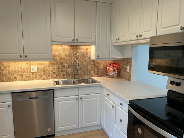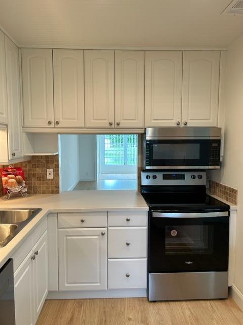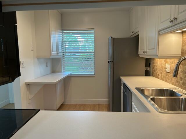 Move in ready. Freshly painted, updated Kitchen, Corian counter tops, stone backsplash, all new appliances. Recessed lighting. New A/C and W/H. New laminate wood floors throughout. Two walk-in closets to be customized by buyer. Spacious tiled 22x10 enclosed patio. Sliding doors removed between LR & patio to give unit a more open look with a step down into the patio. Full size W/D and extra storage closet on patio. Crown molding, 5'' baseboards, new raised panel doors & hardware, updated electrical switches and outlets. Updated bathrooms. Accordian Shutters. Ring door bell will convey to buyer. This unit won't last. Discover Golden Lakes Village. 24/7 guard gated, clubhse, pool, hot tub, tennis, gym & so much more. Full time social director schedules shows, trips and social events