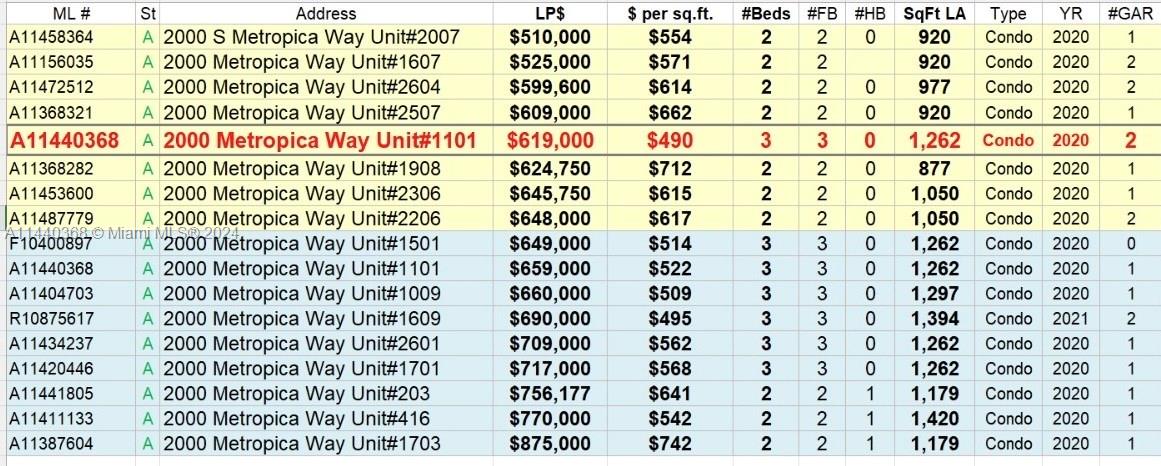The lowest price per sq.ft. in the entire building! Spacious 3-bed. 3-bath. +den unit is an ideal choice for a new home or a smart investment opportunity. Generously sized open kitchen, modern SS appliances, Italian cabinetry and porcelain tile. Floor-to-ceiling impact windows with panoramic & unobstructed views. Each room has an access to an oversized balcony. Two assigned parking spaces. Can be rented right away: 4 times per year, for a 3 months min. One Metropica offers 24/7 security, concierge, fitness center, sauna, infinity pool, tennis courts and more. Ideal location near Ft.Lauderdale & Miami Airports, Sawgrass Mills Mall, grocery stores, restaurants, banks etc. THE BEST DEAL IN METROPICA!