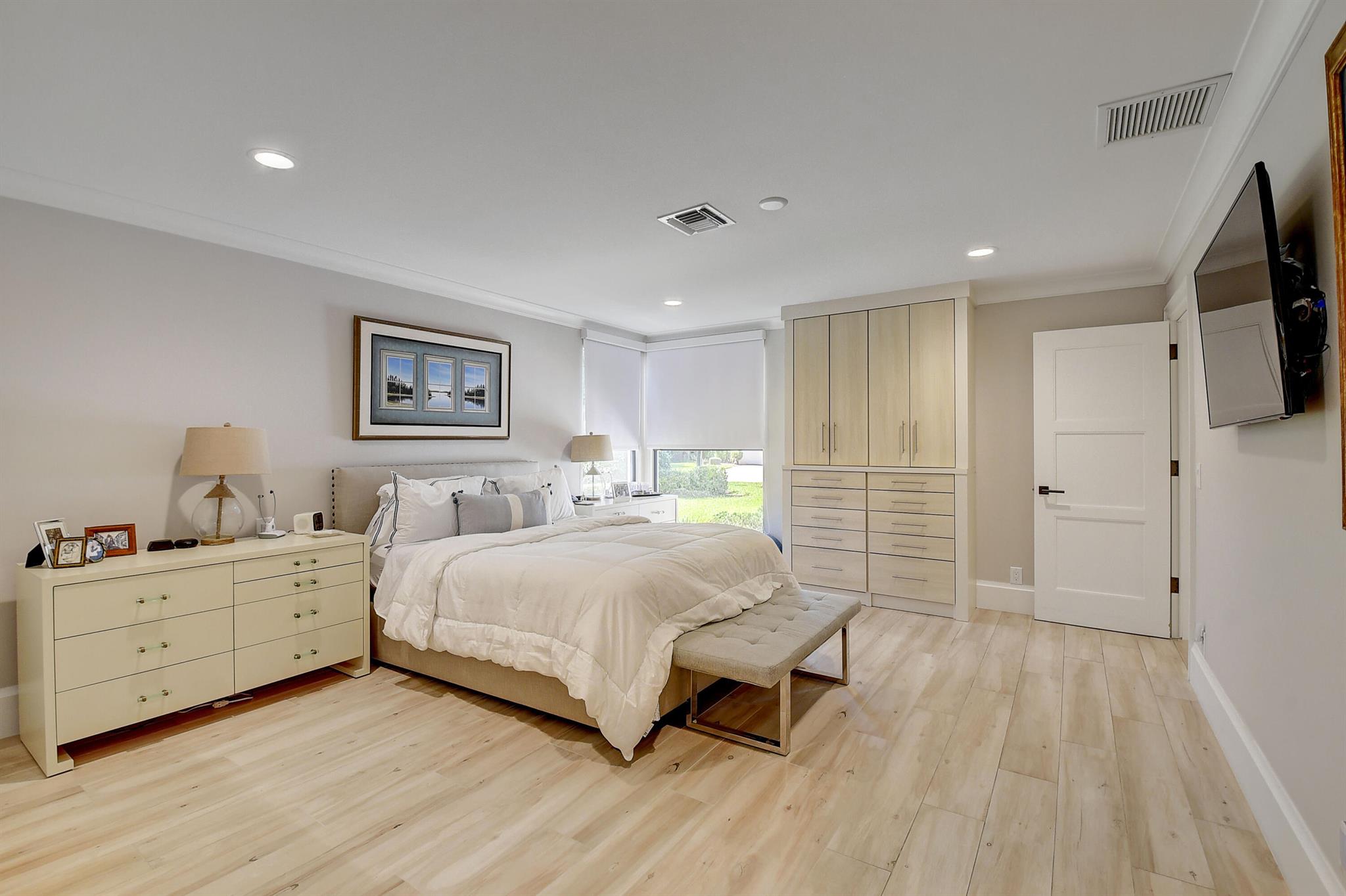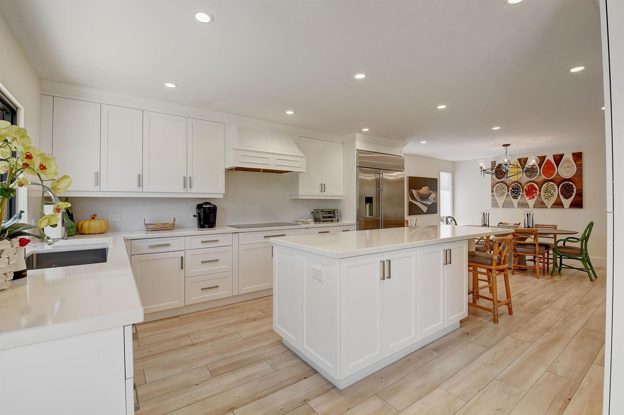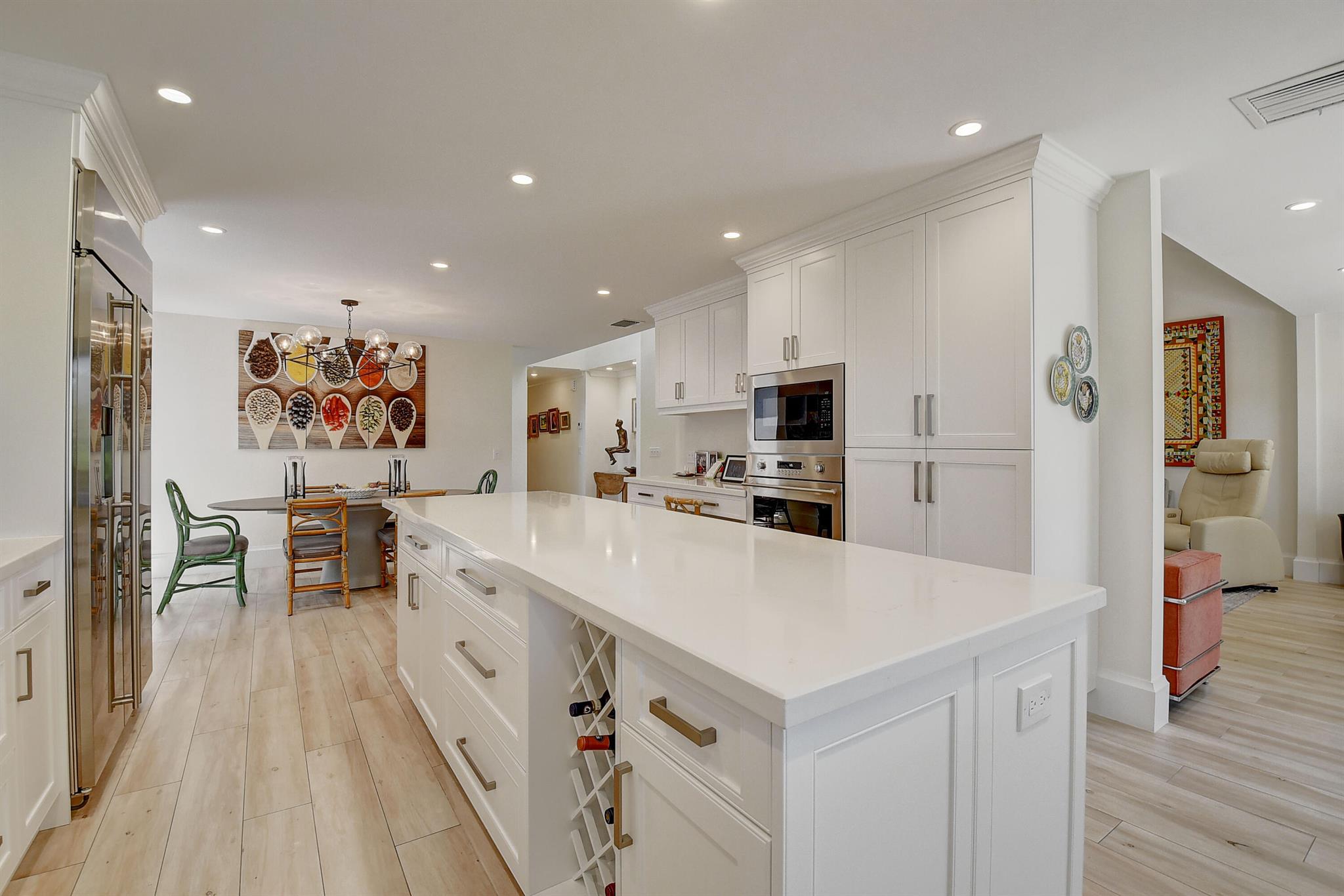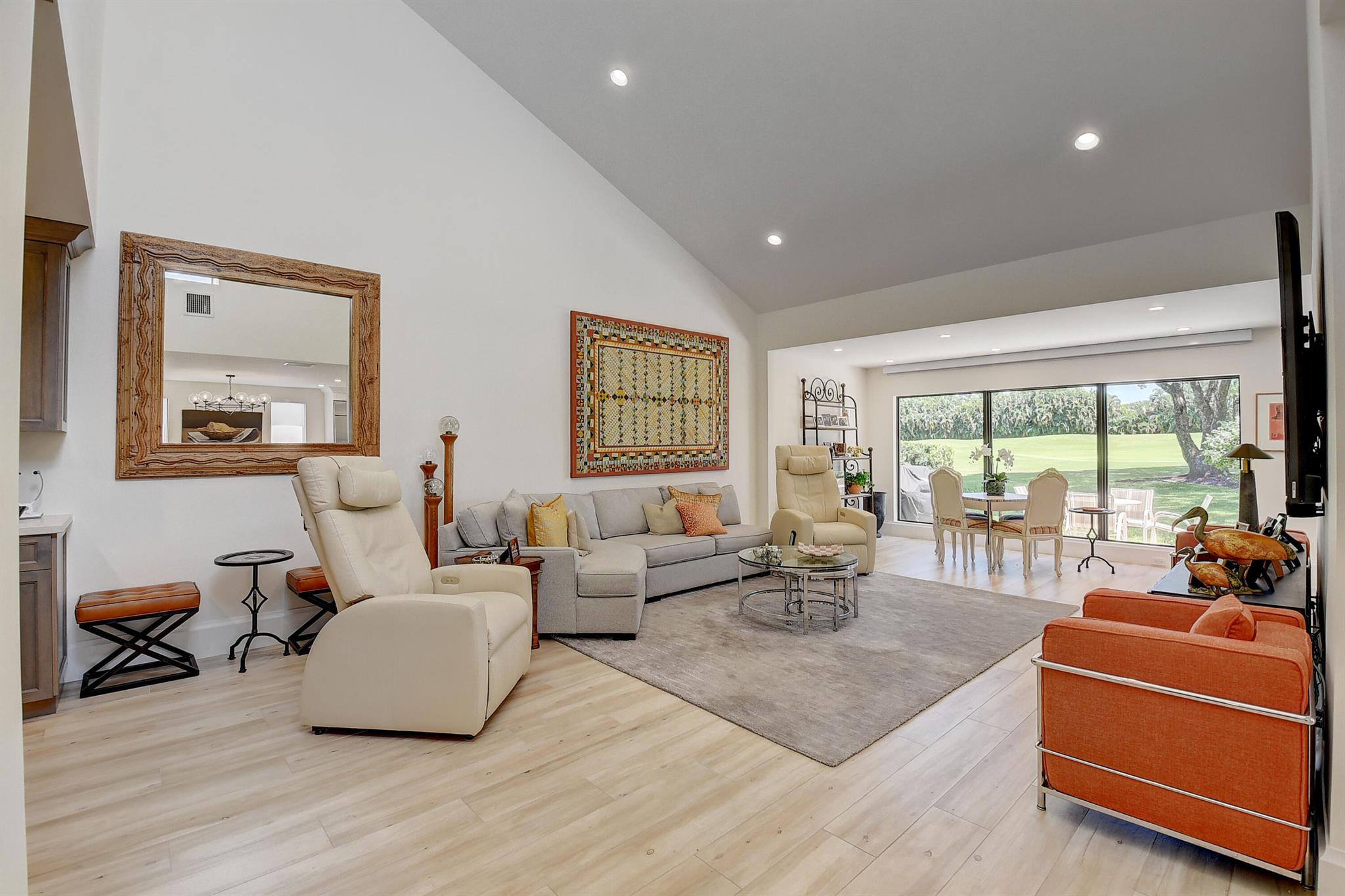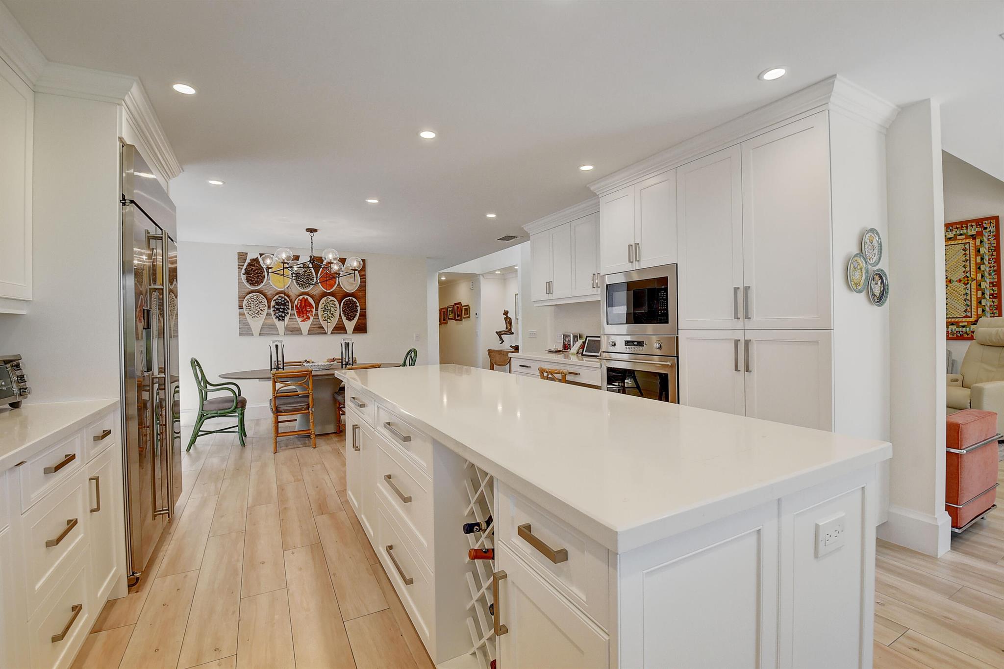 Architecturally designed & renovated 3 bed, 2 bath home on a beautiful golf lot is now available. A fabulous contemporary renovation combined with a forever view make this home so desirable. This special home has the finest decorator finishings and upgrades. The open floorplan features a spacious kitchen with a large island & dining room. The living room has a wonderful bar and serving area to host intimate or large parties. In the primary bedroom there is a large walk-in closet and a separate linear closet. A beautiful primary bath completes the primary retreat. An air conditioned garage with a coat closet and additional storage space will accommodate a car and golf cart. Impact windows and doors complete the package. ~Imagine life inside the Nation's #1 Private Residential Country Club!