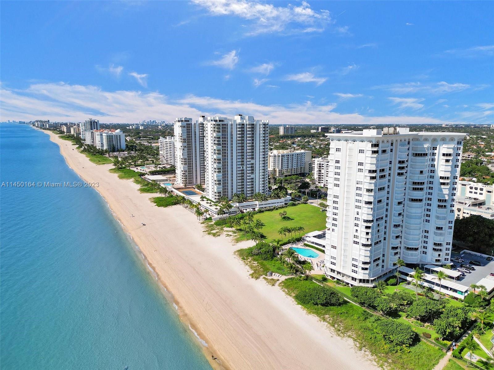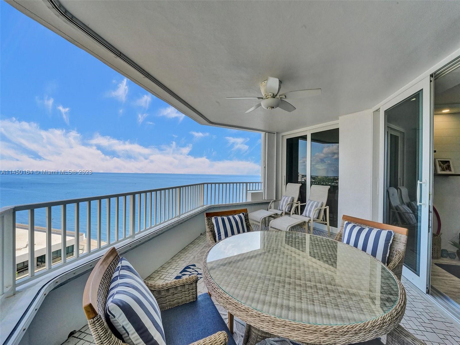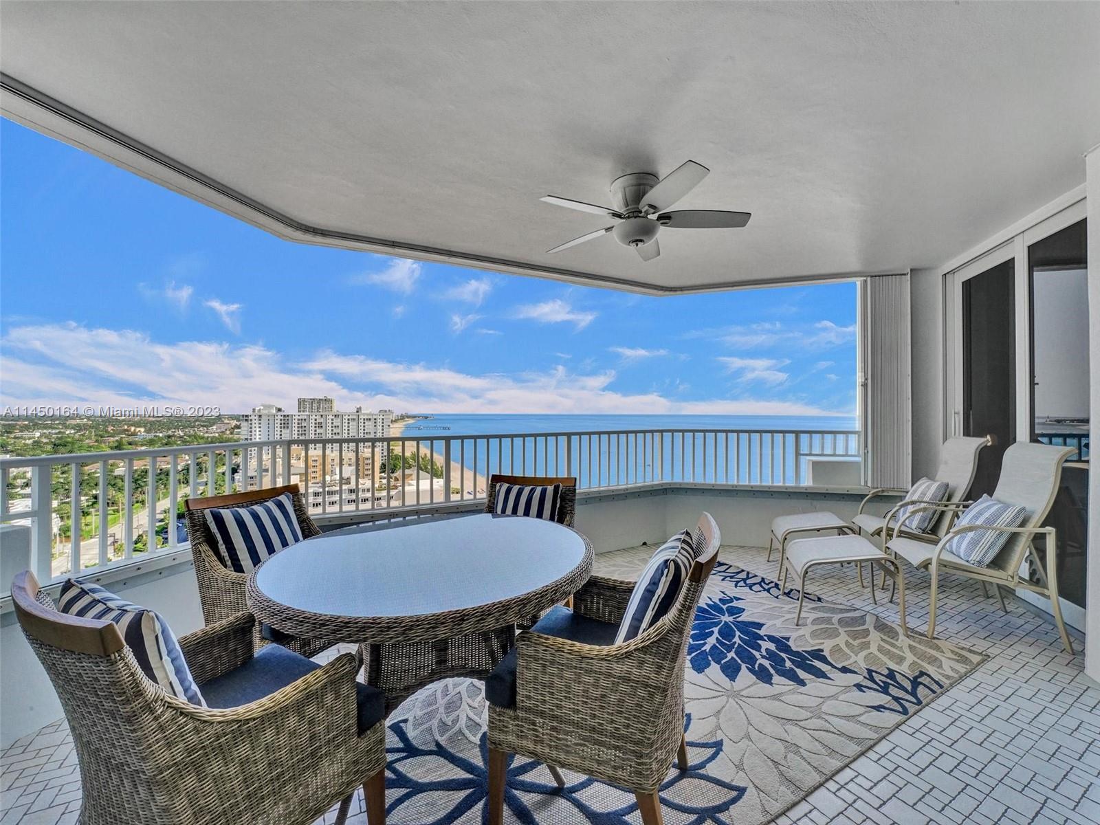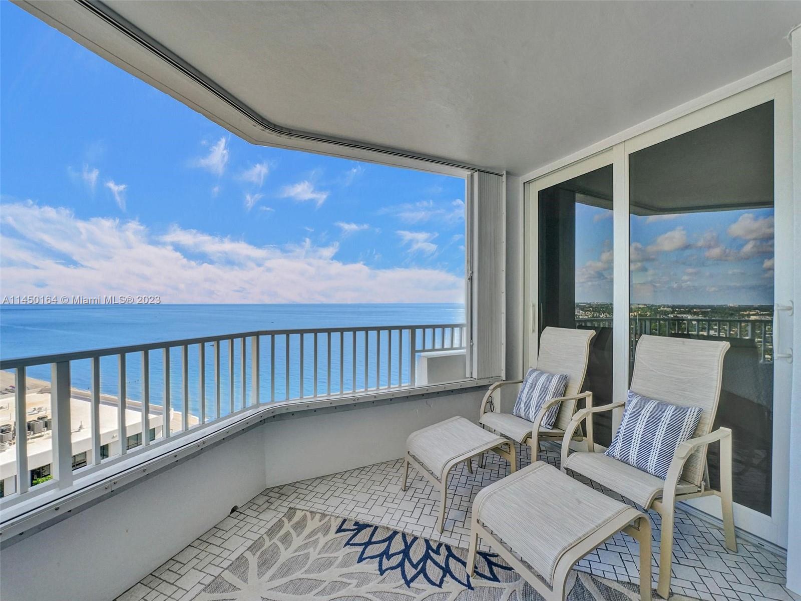 STUNNING VIEW OF THE OCEAN, INTRACOASTAL AND SKYLINE FROM UNUSUALLY LARGE BALCONY 23' x 12'. ACCESSABLE FROM THE LIVING AREA, KITCHEN AND PRIMARY BEDROOM. IMAGINE ENJOYING YOUR COFFEE EVERY MORNING WITH THIS BEAUTIFUL VIEW OF THE BLUE OCEAN, WHITE SANDY BEACH, MILES OF COASTLINE, POMPANO BEACH PIER AND THE LIGHTHOUSE! TOTALLY REMODELED, EVERYTHING NEW. FURNISHED! SPACIOUS OPEN FLOOR PLAN. KITCHEN OFFERS LARGE ISLAND, CUSTOM CABINETS, QUARTZ COUTERTOPS AND WINE COOLER. SPLIT BEDROOMS. BATHROOMS, CUSTOM CABINETS AND QUARTZ COUNTERTOPS. HURRICANE IMPACT DOORS AND WINDOWS. ELECTRIC BLINDS IN BEDROOMS, TURN KEY, 24/7 SECURITY, POOL, FITNESS CENTER, SAUNAS, LIBRARY, CONFERENCE ROOM, CARD ROOM, BOCCE BALL, BILLIARD ROOM, BBQ GRILLS AND BEACH CHAIRS. GREAT LOCATION.
