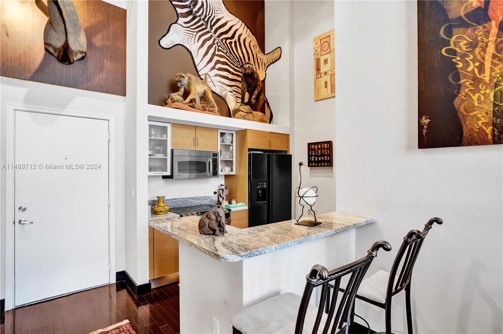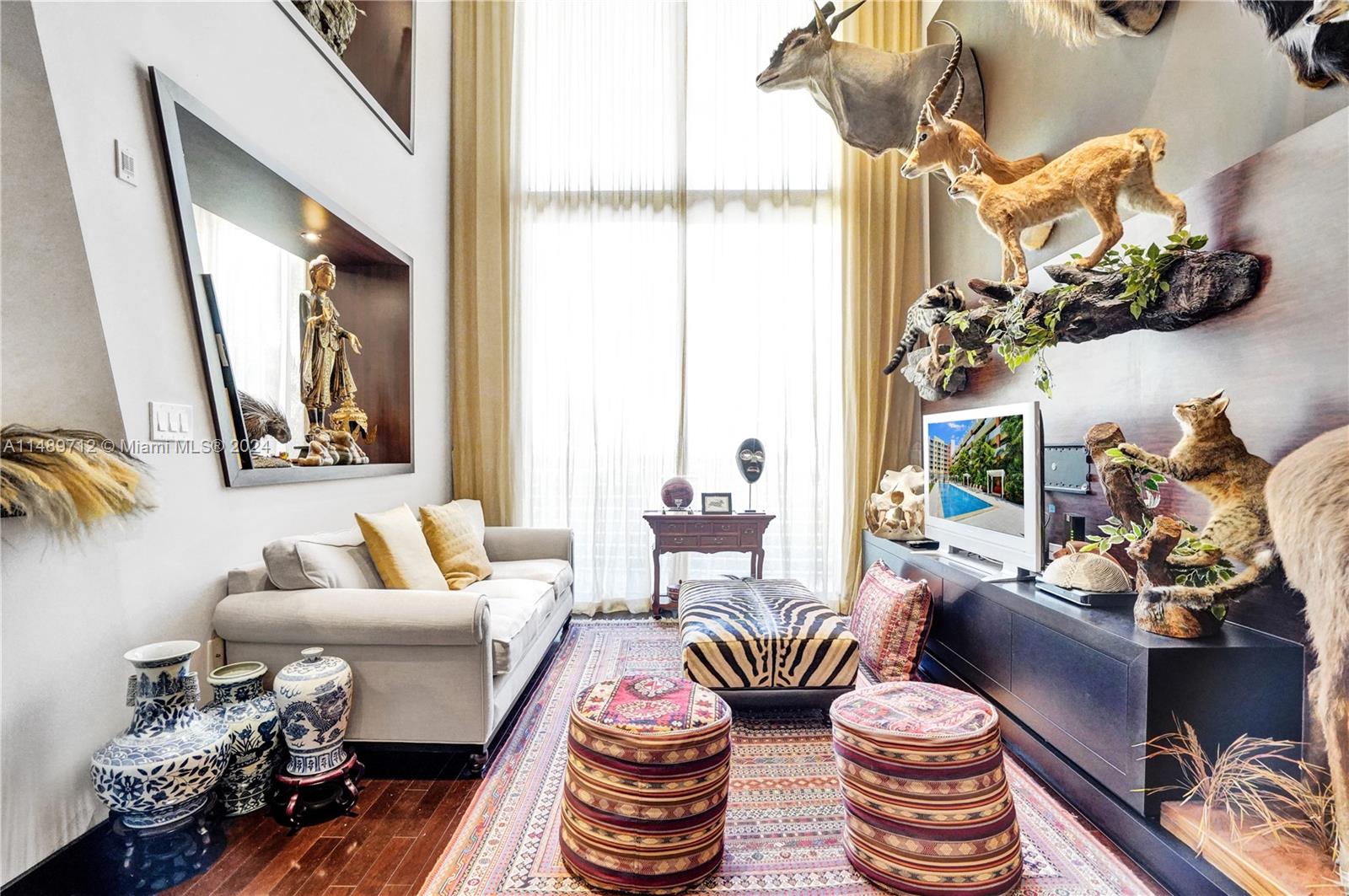 RARE OPPORTUNITY to own a first floor 2/2 with 20-foot high ceilings offering a direct view to the pool. There is ONLY ONE high ceiling 2/2 unit with DIRECT view to the pool in the building. Listed at $540,500 WITHOUT the furniture & animal mounts or at $780,000 with everything included. Taxidermy and furniture can be removed before closing. Hardwood floors, closet and doors. RARELY available too: Two covered parking spaces & two large storage spaces come with this unit. Boutique building, 24/7 concierge, pools, party room, cinema theater, business center. Located in the heart of Aventura, close to shops, restaurants, grocery store, houses of worship, Aventura Mall, the beach. No recreational showings.
